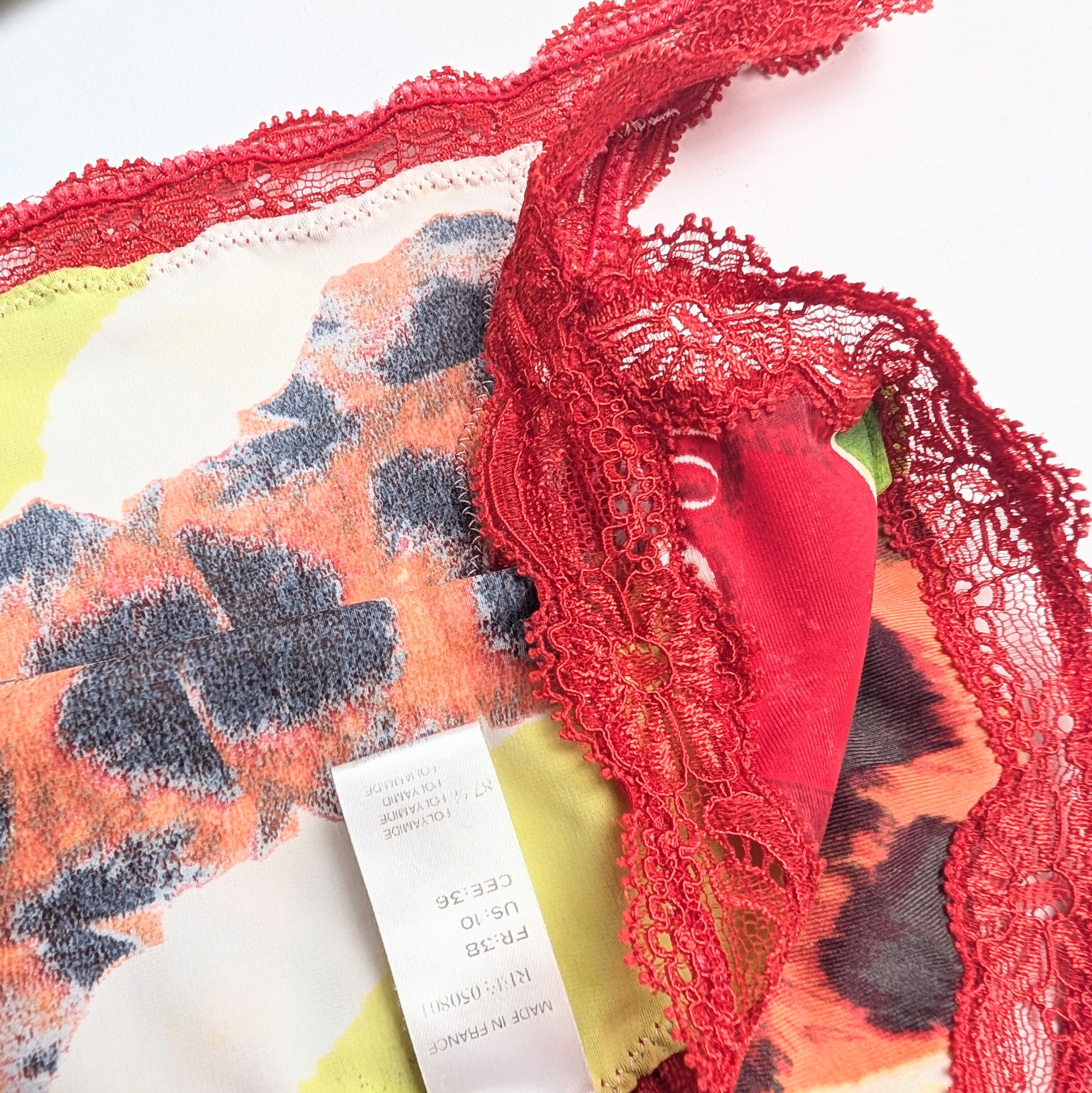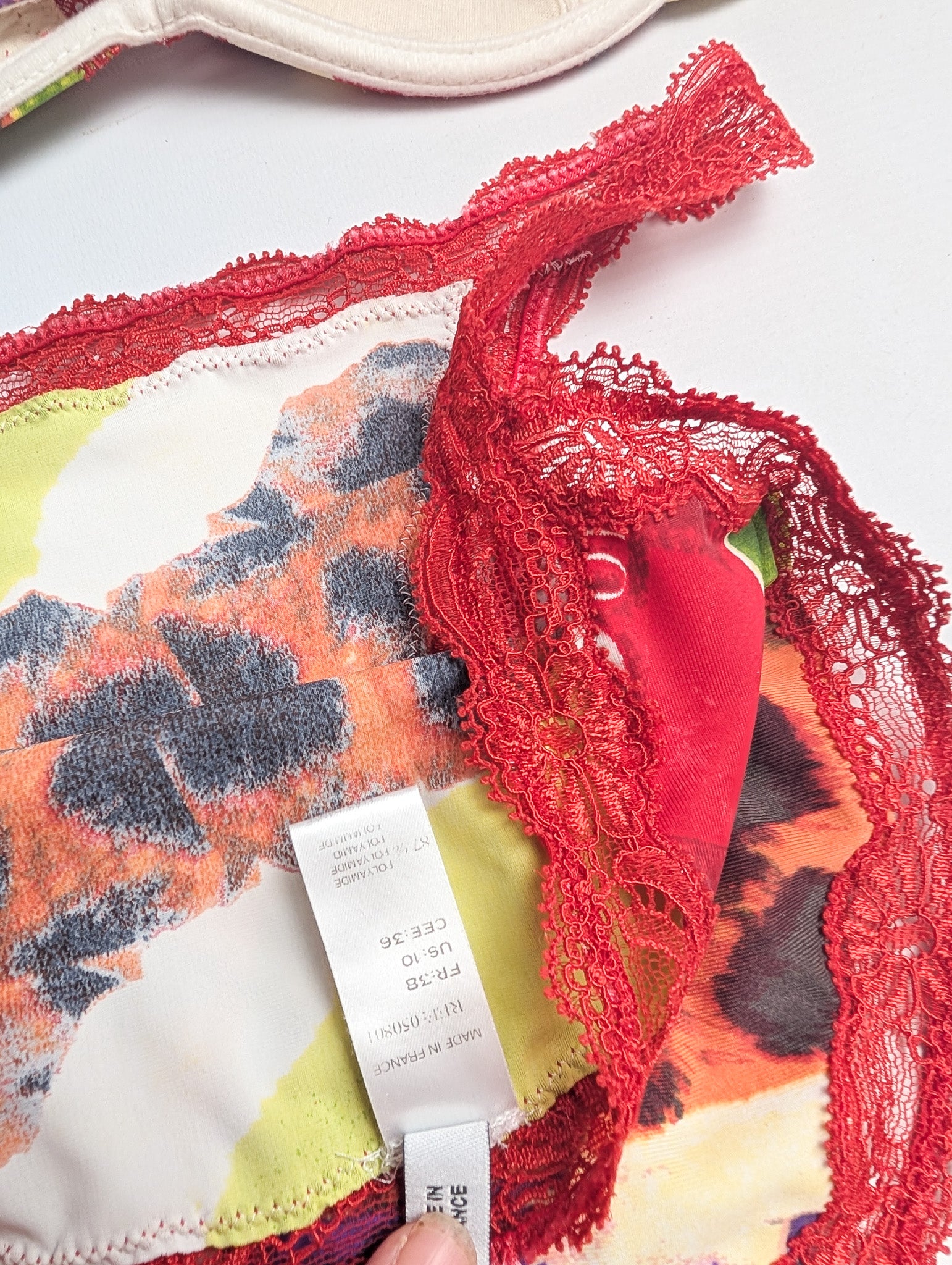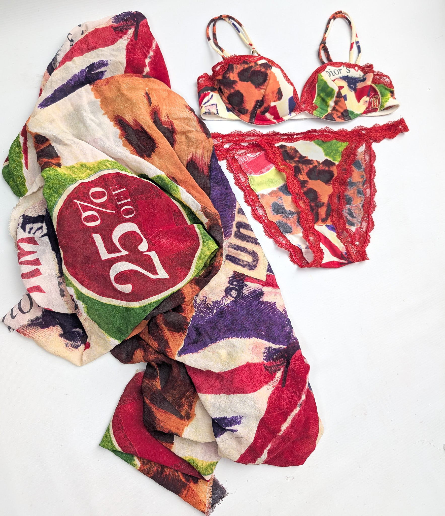 Item: Lingerie set that can also be worn as a swimsuit and very large silk scarf.