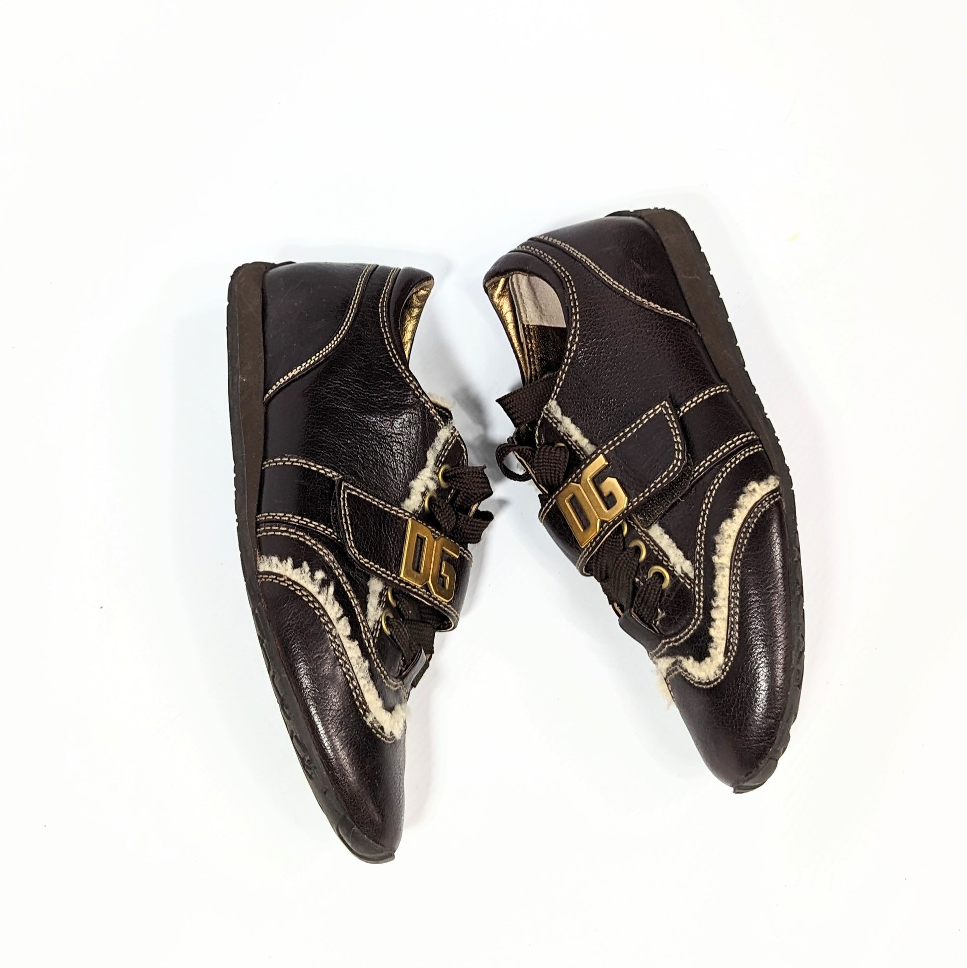 Item: Dolce & Gabbana lace-up sneakers in leather with fur inserts. Buckle adorned with gold-tone initials.
