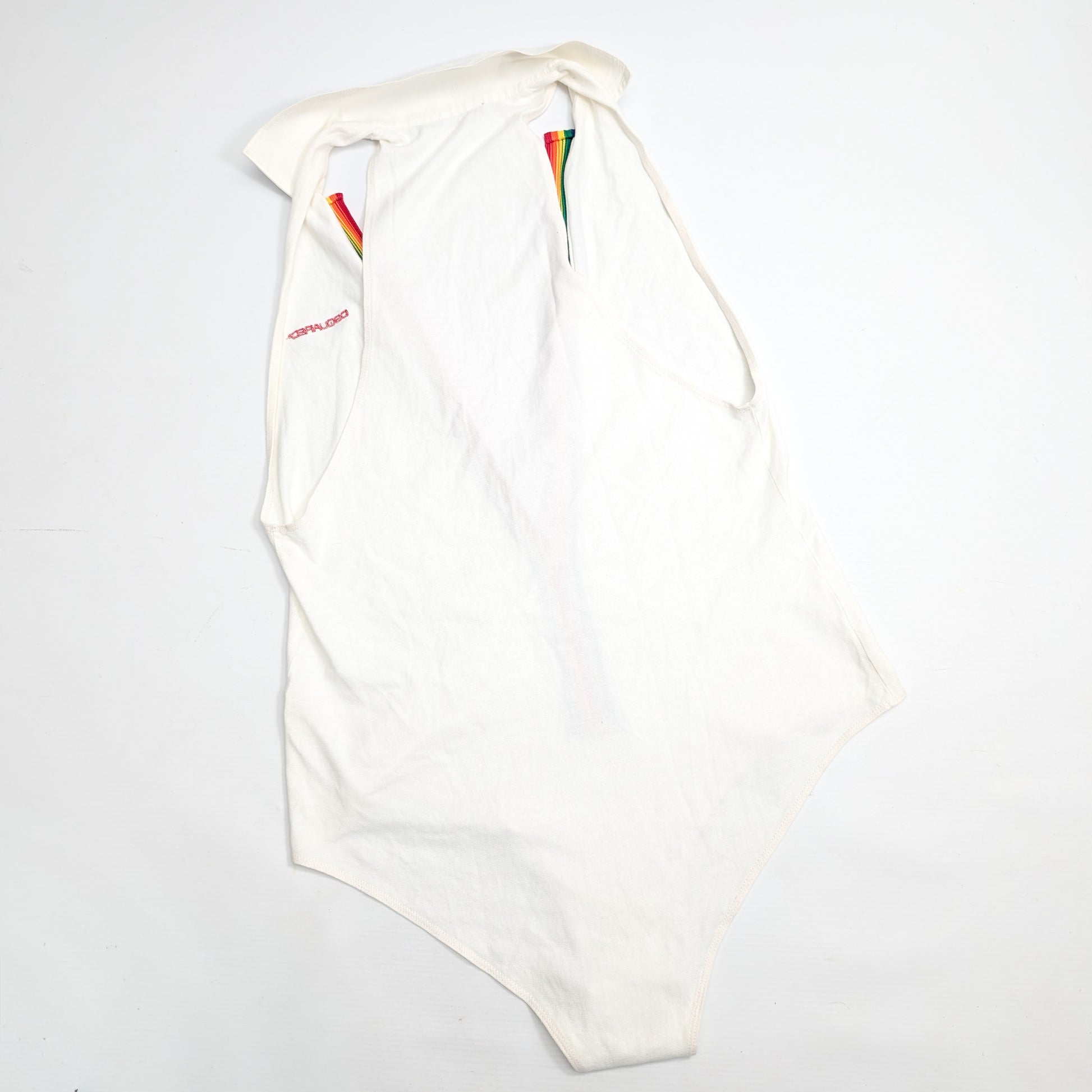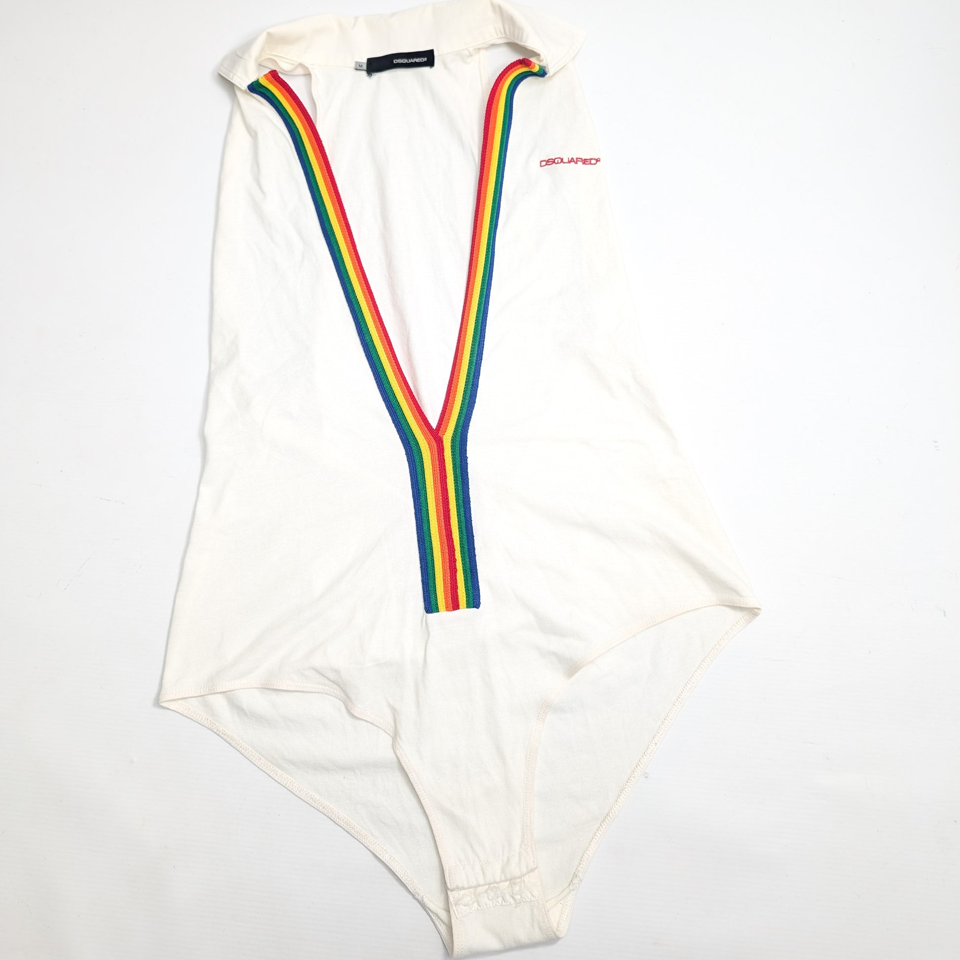 Item: White cotton bodysuit with a low neckline and multicolored trim.
