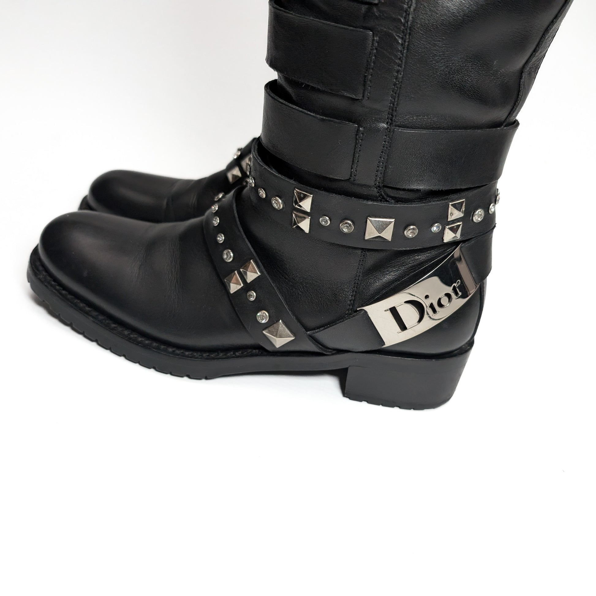 Item: Motorcycle-style leather boots. Silver plate marked "Dior" on each boot.