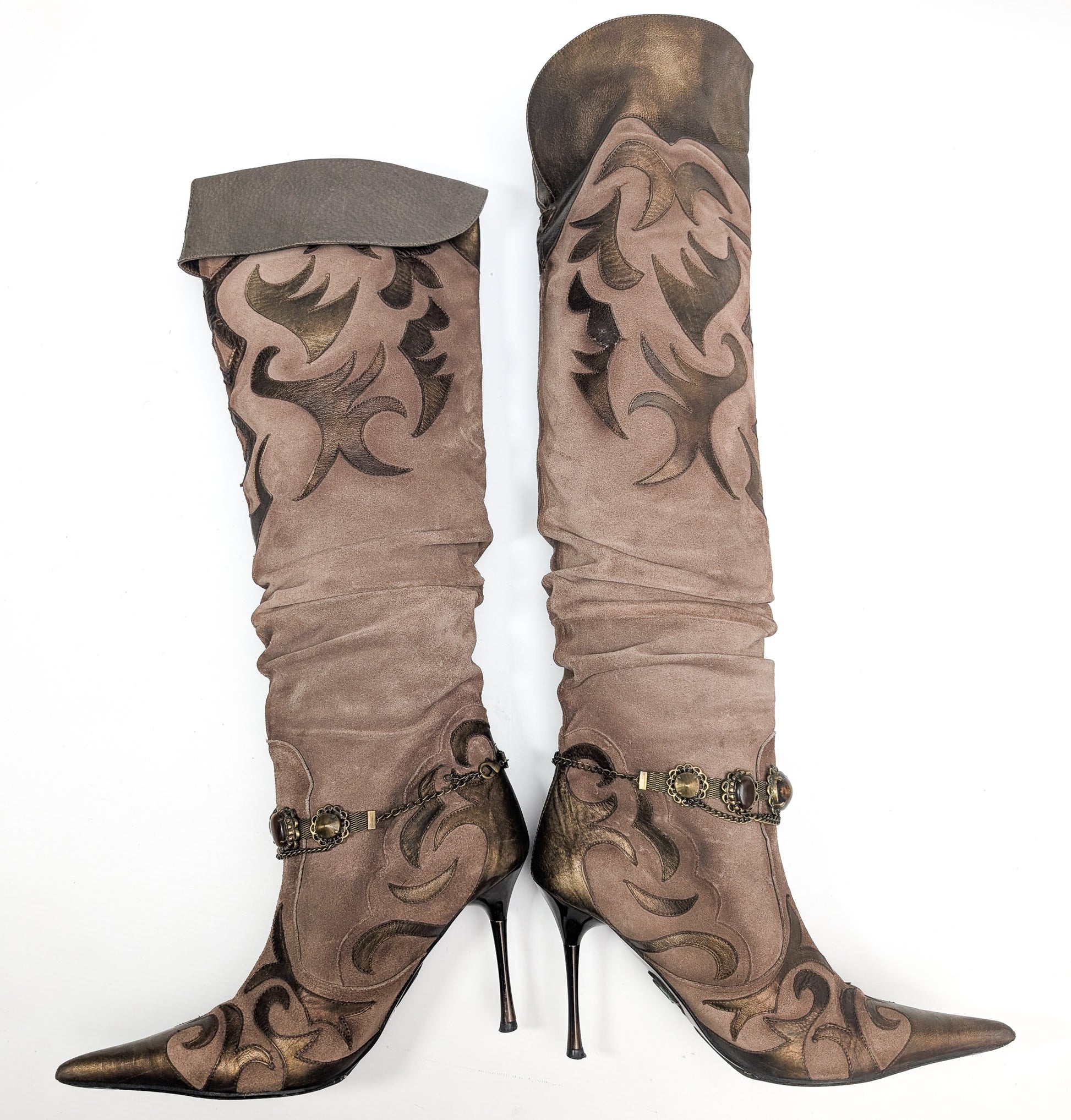 Item: El Dantes thigh-high boots in beige suede adorned with jewels.