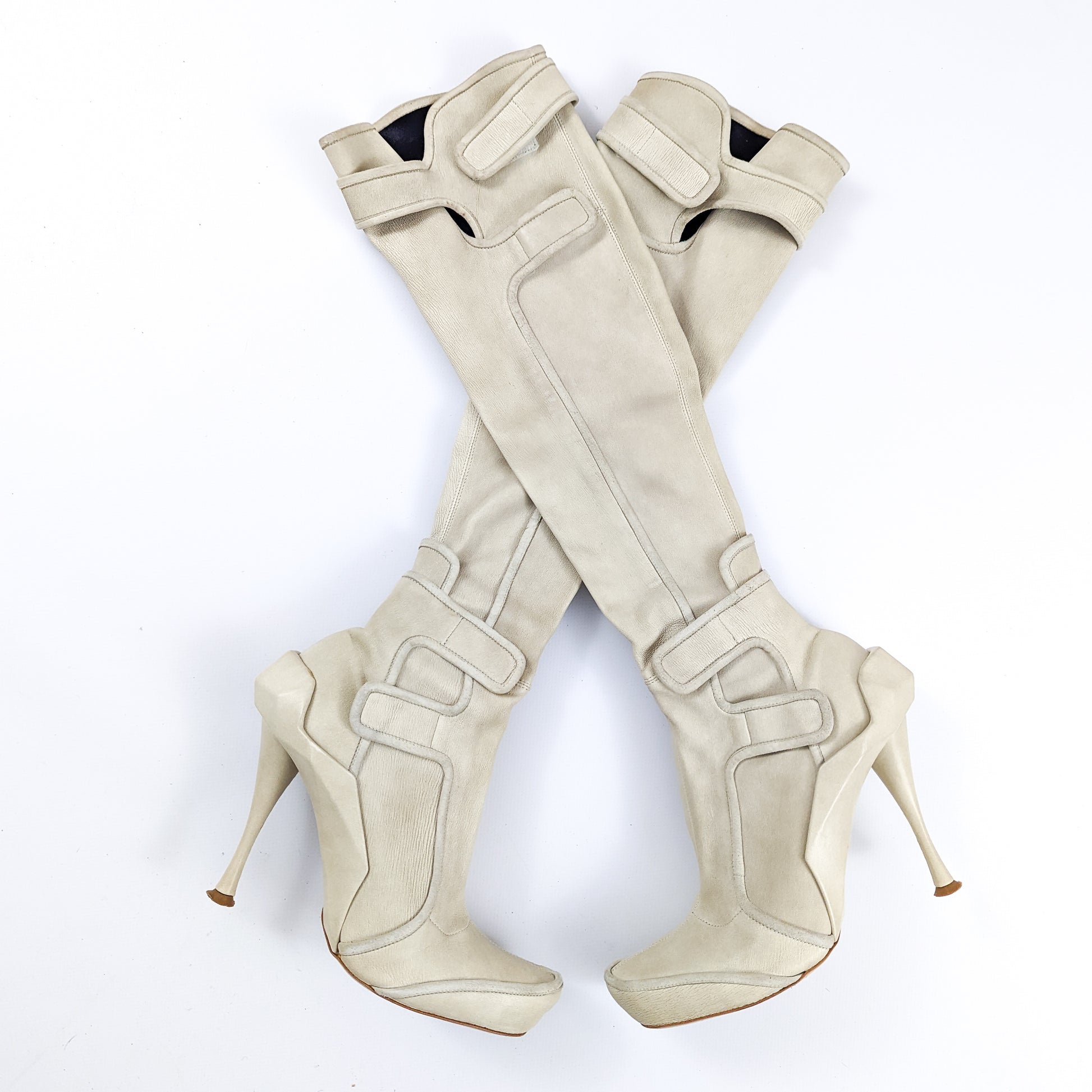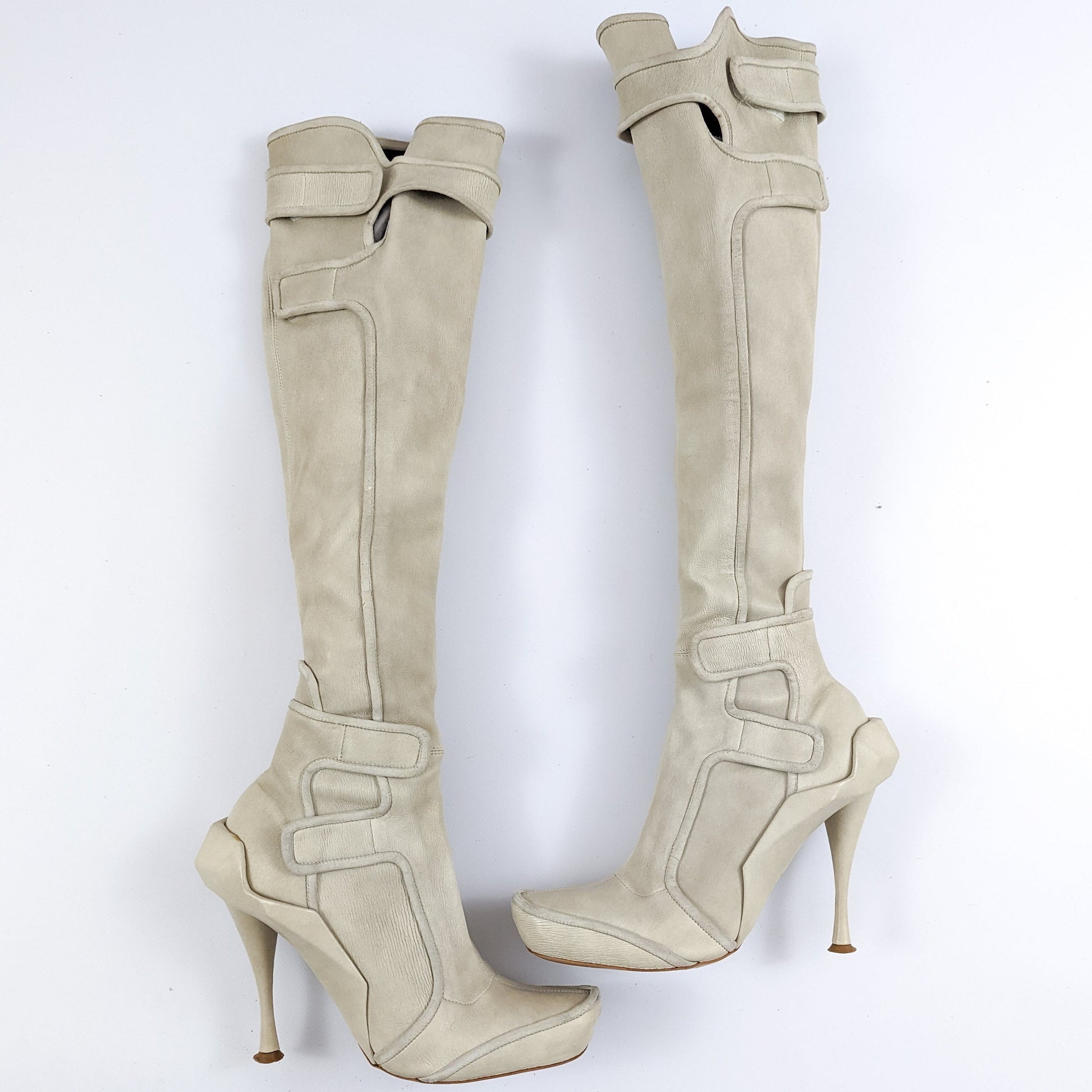 Item: Céline high strappy boots. Far from the Céline Fall Winter 2008 show. Soft leather. Shade of beige and gray.