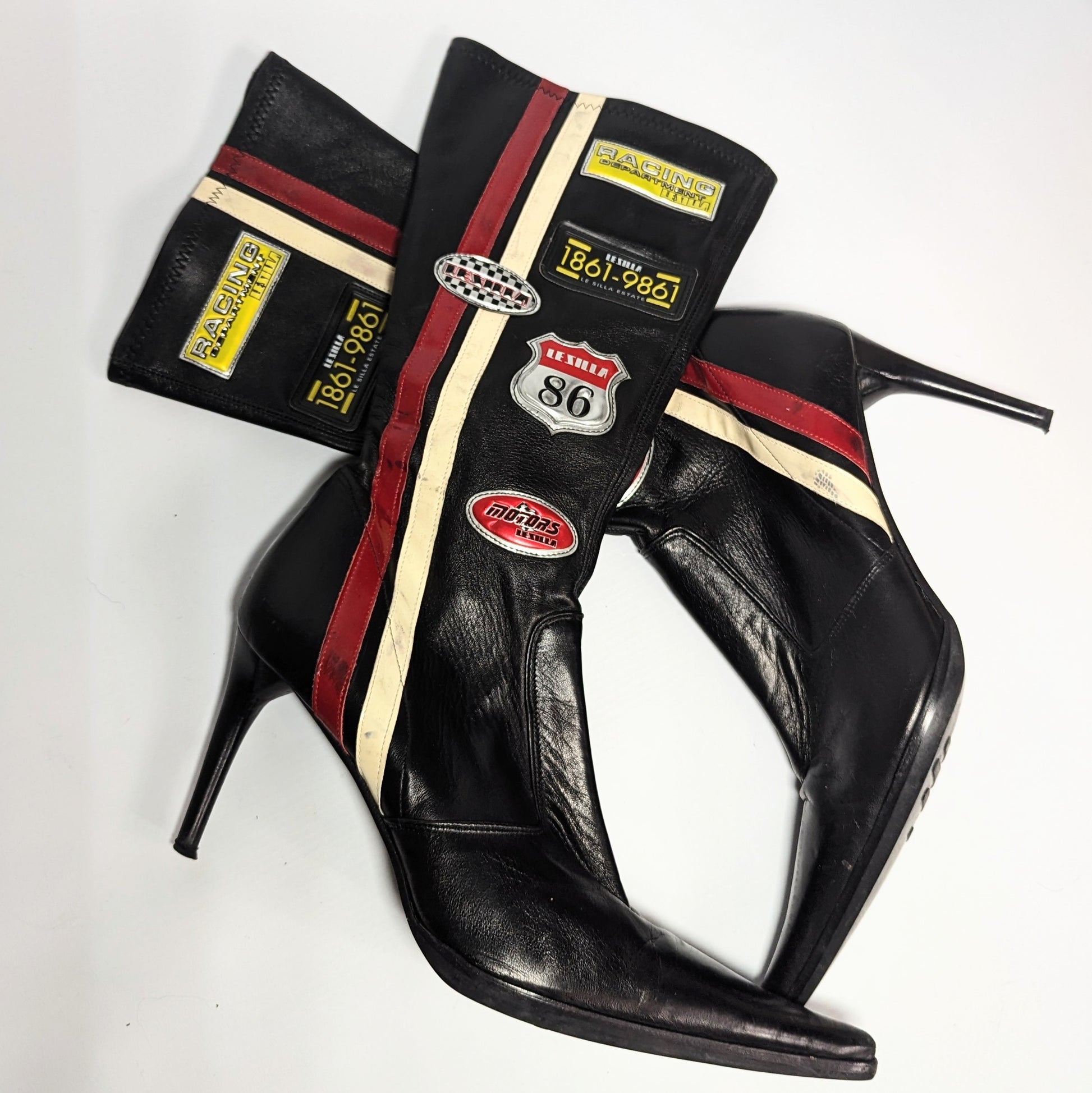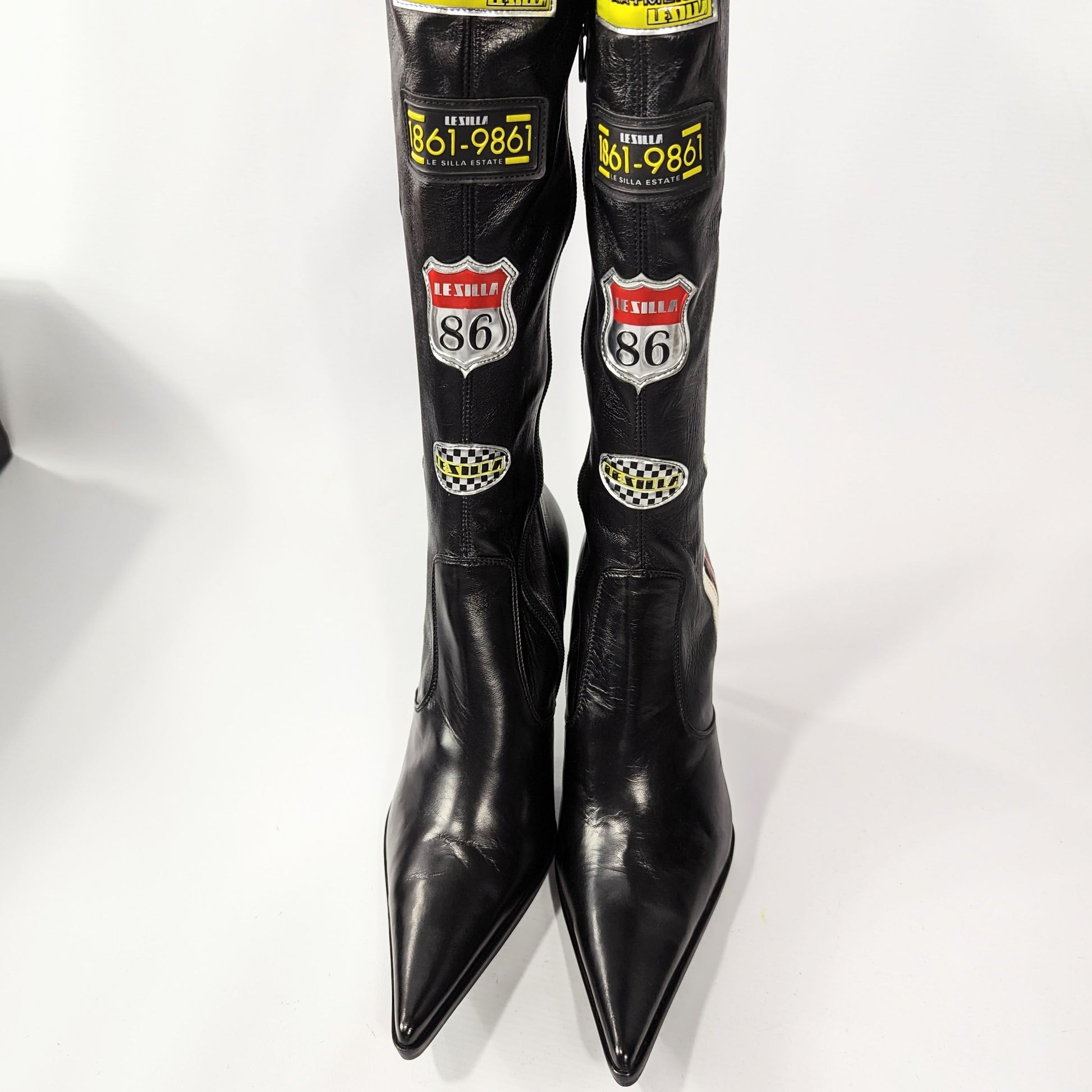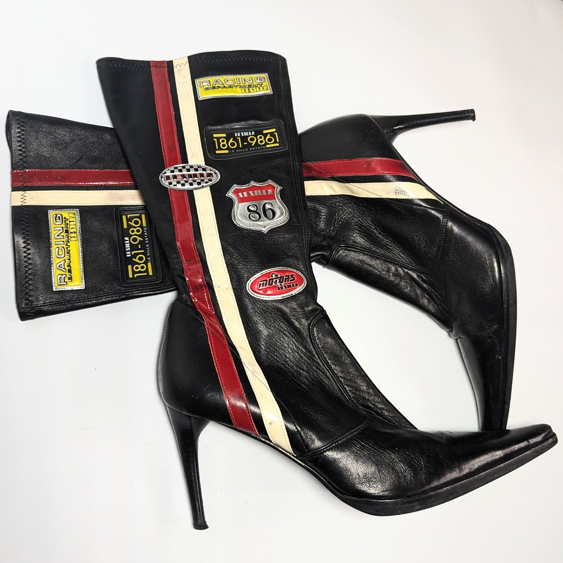 Item: Le silla boots in black leather decorated with motorcycle-style inserts.