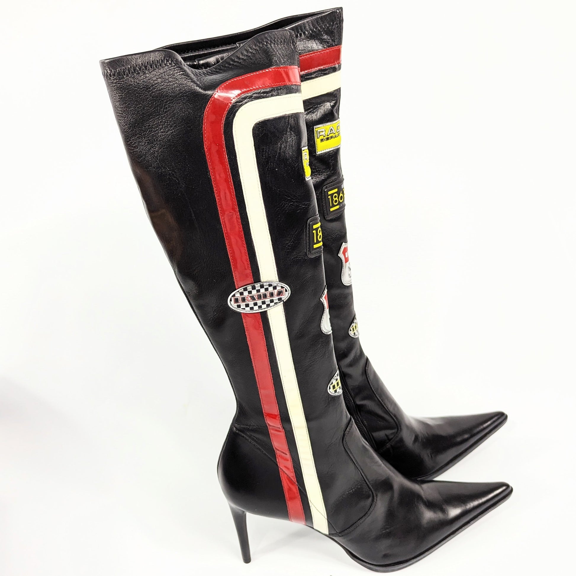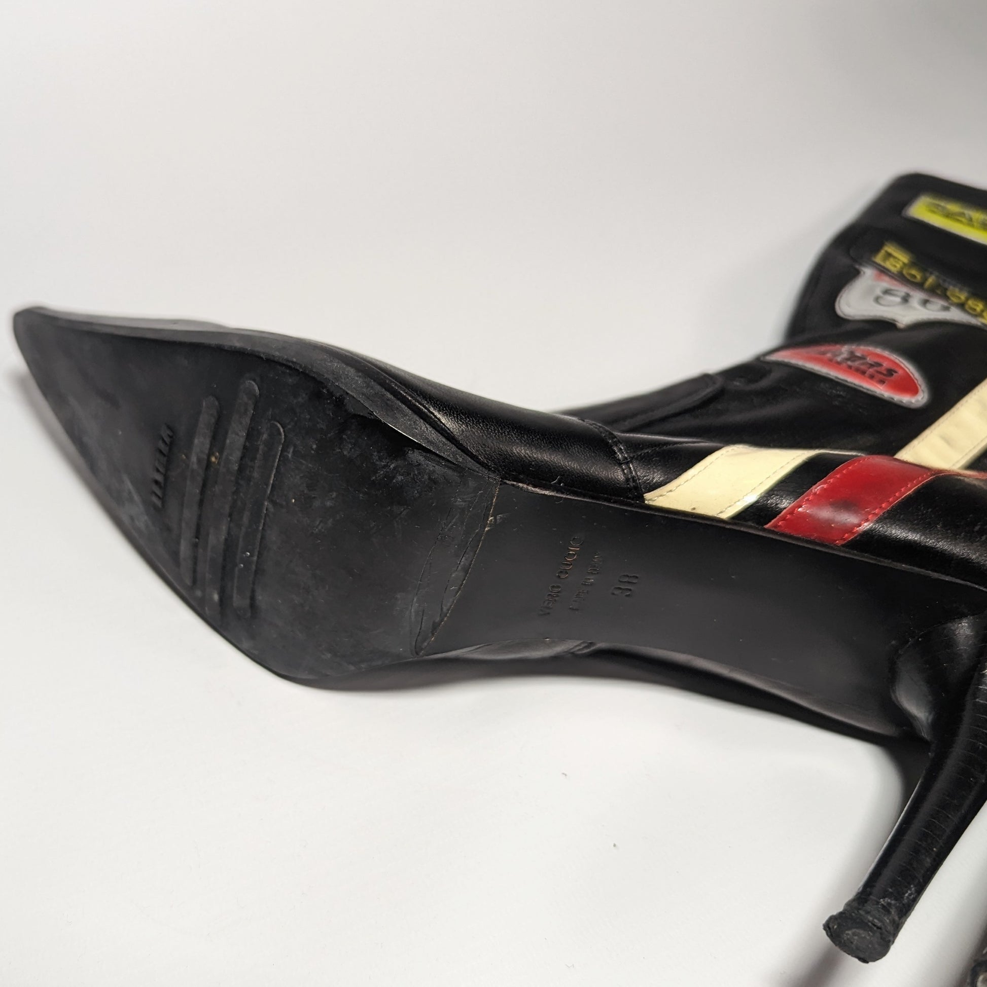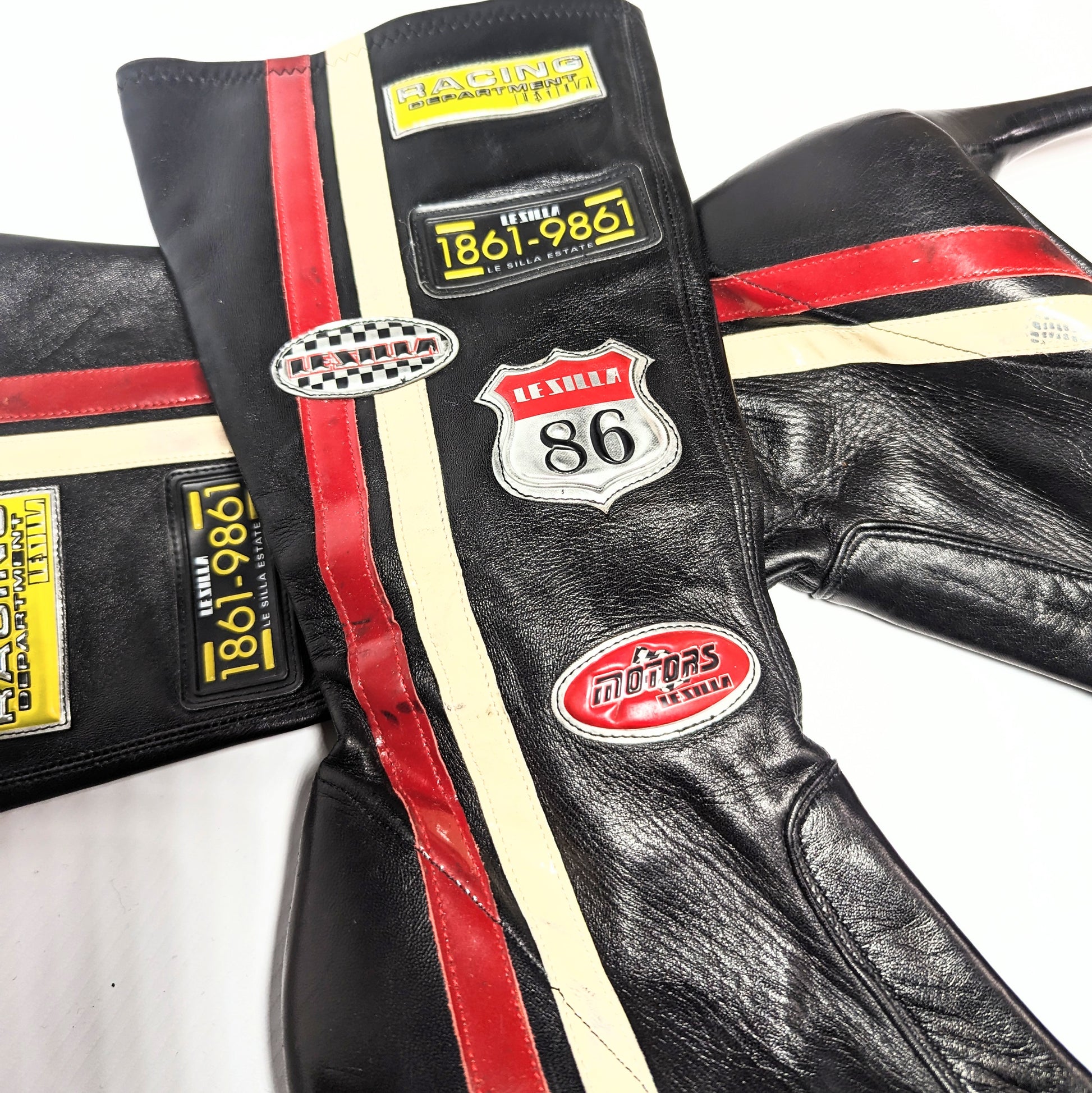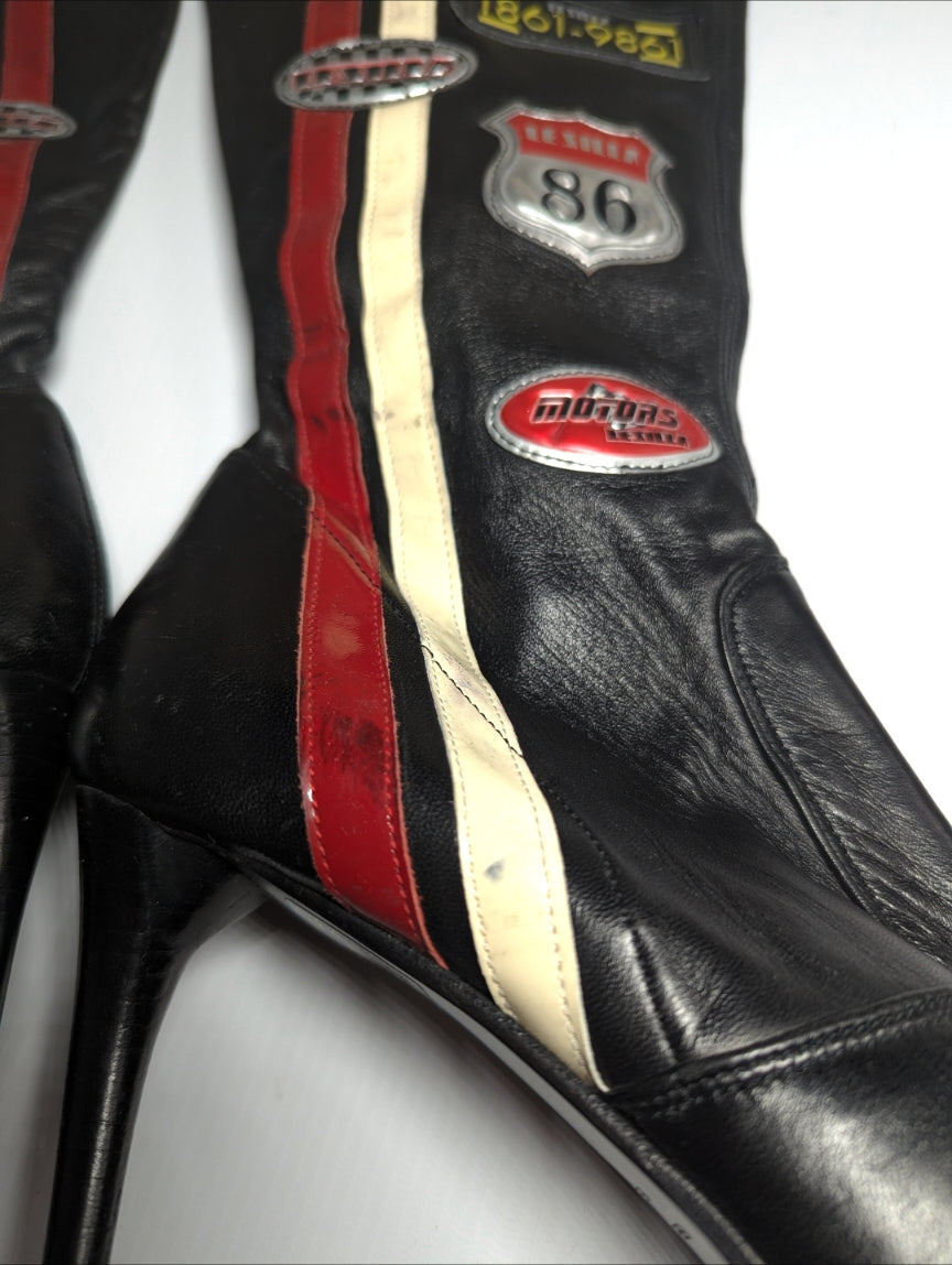 Item: Le silla boots in black leather decorated with motorcycle-style inserts.