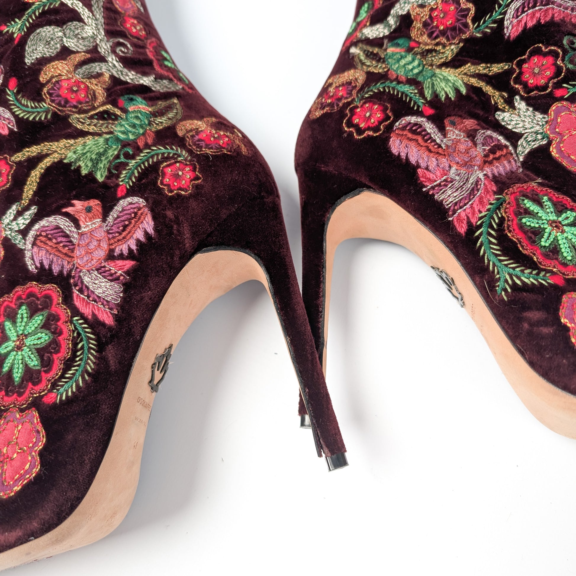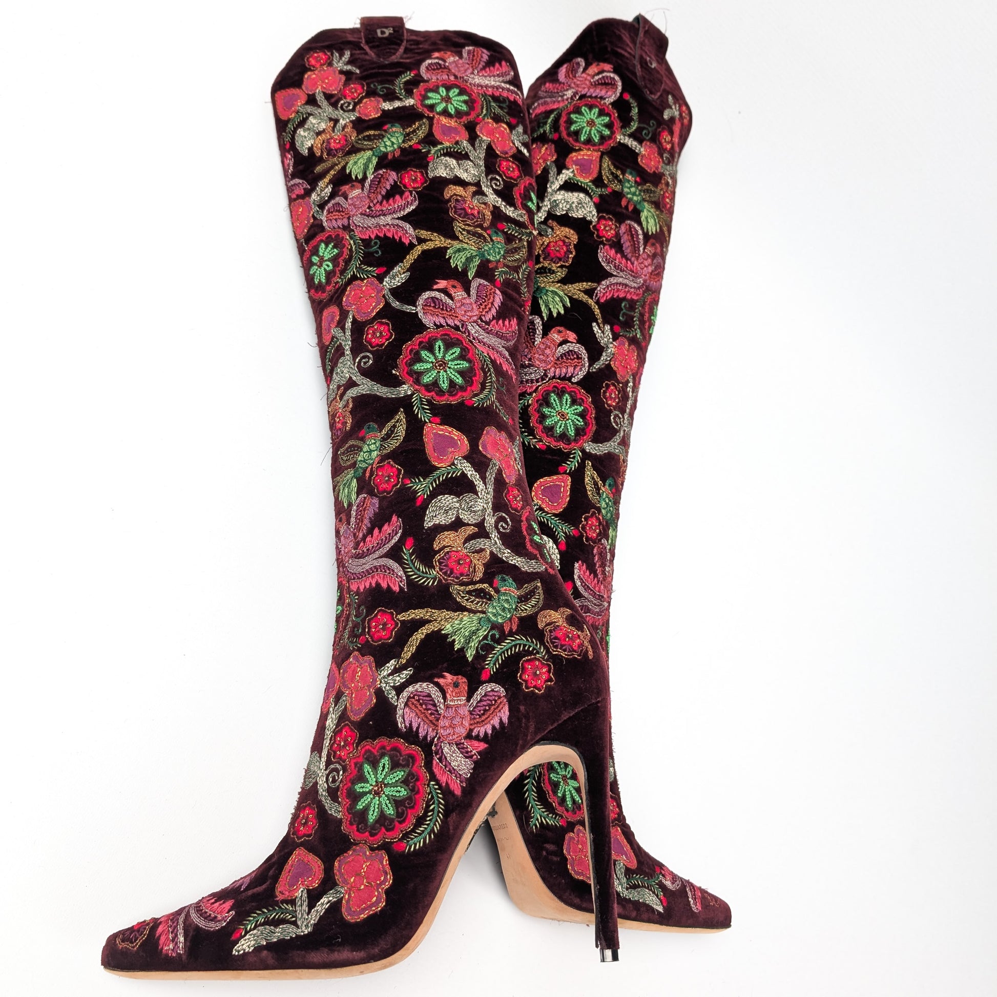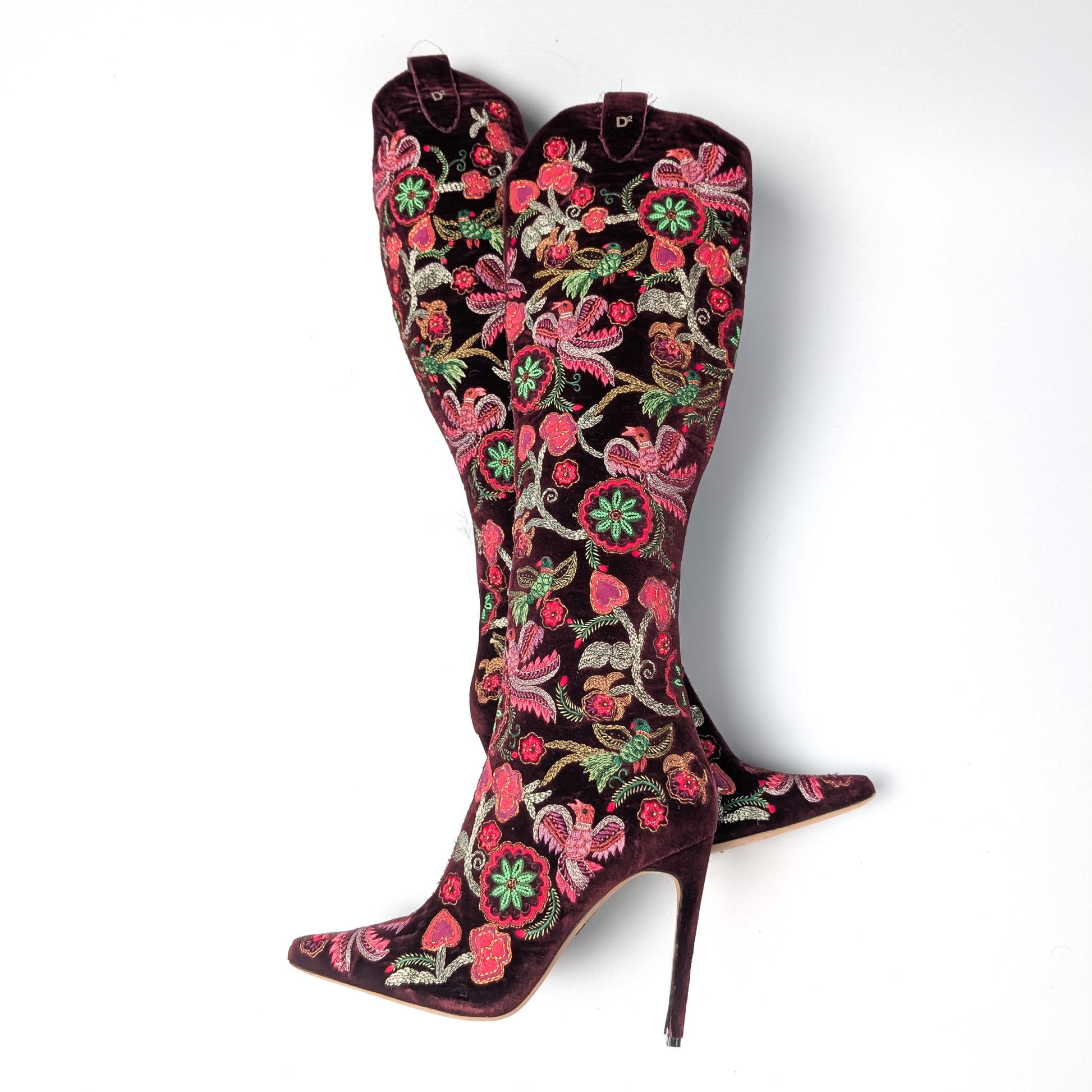 Item: Dsquared2 embroidered burgundy velvet boots .