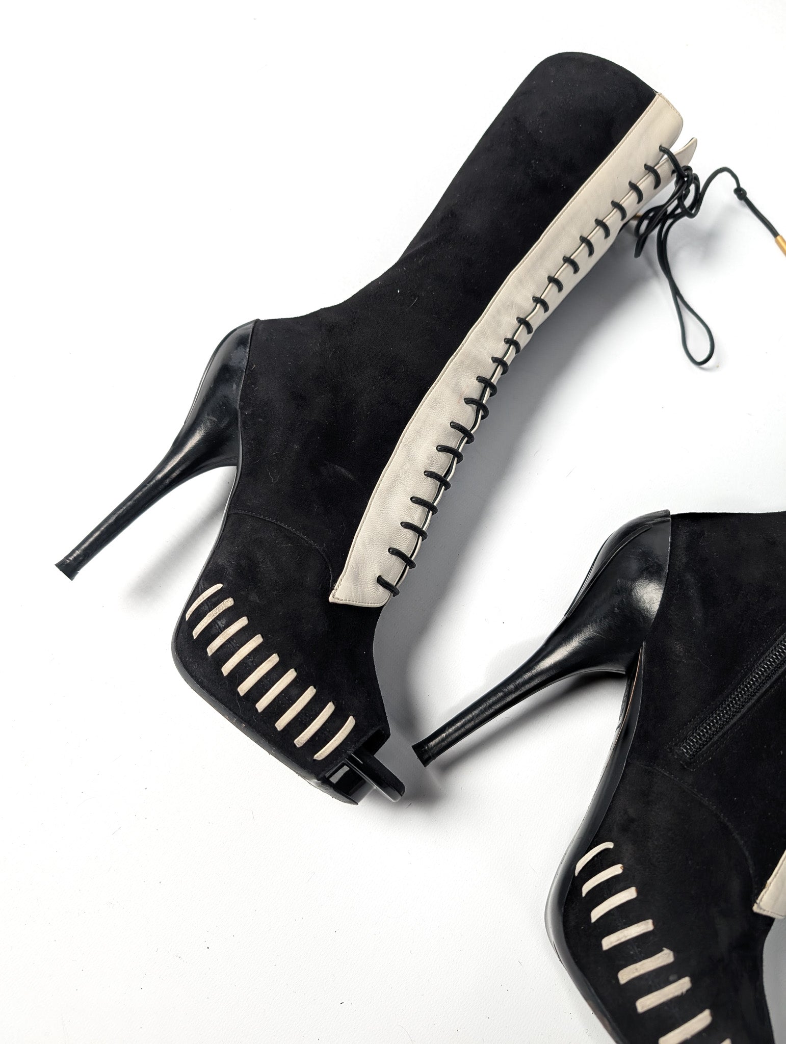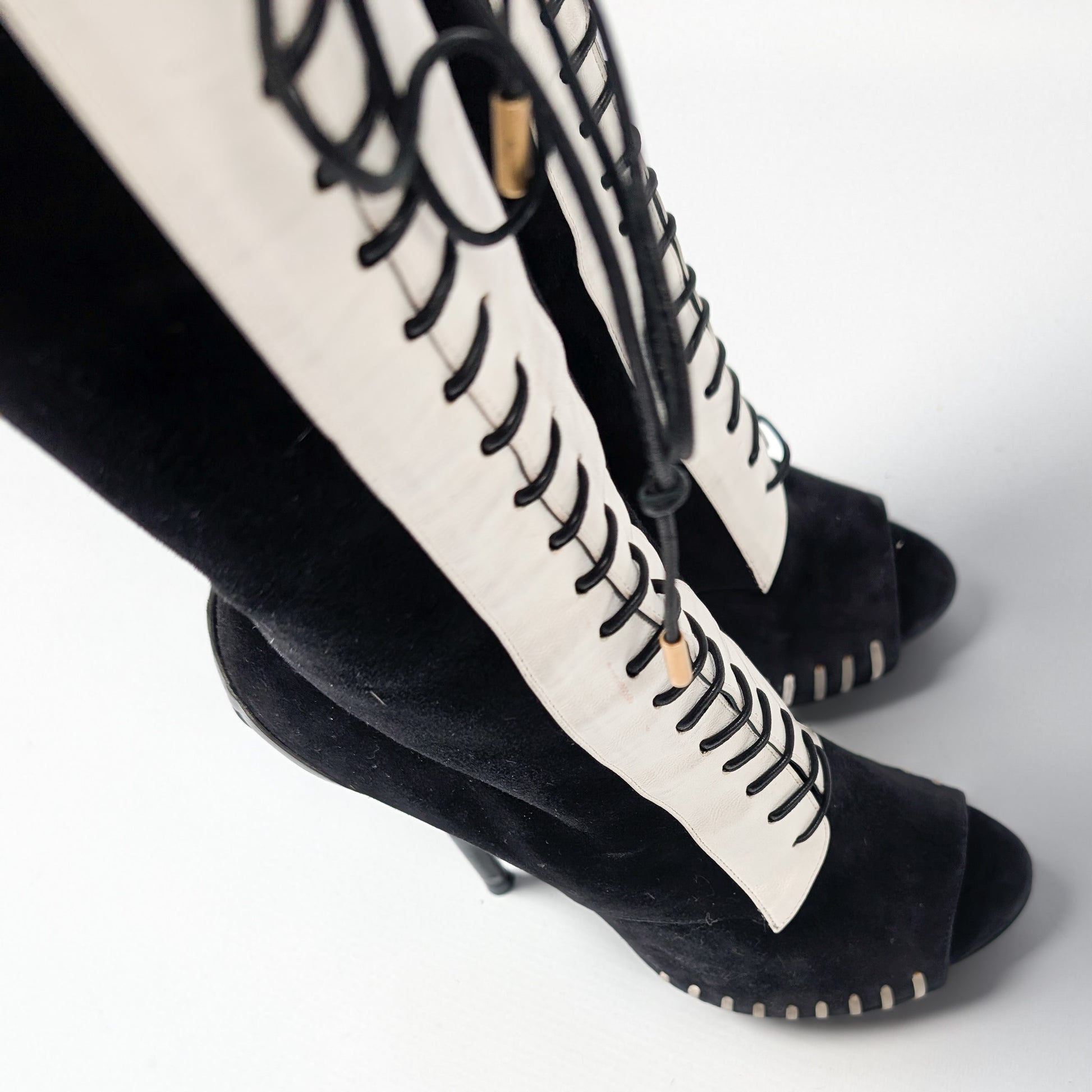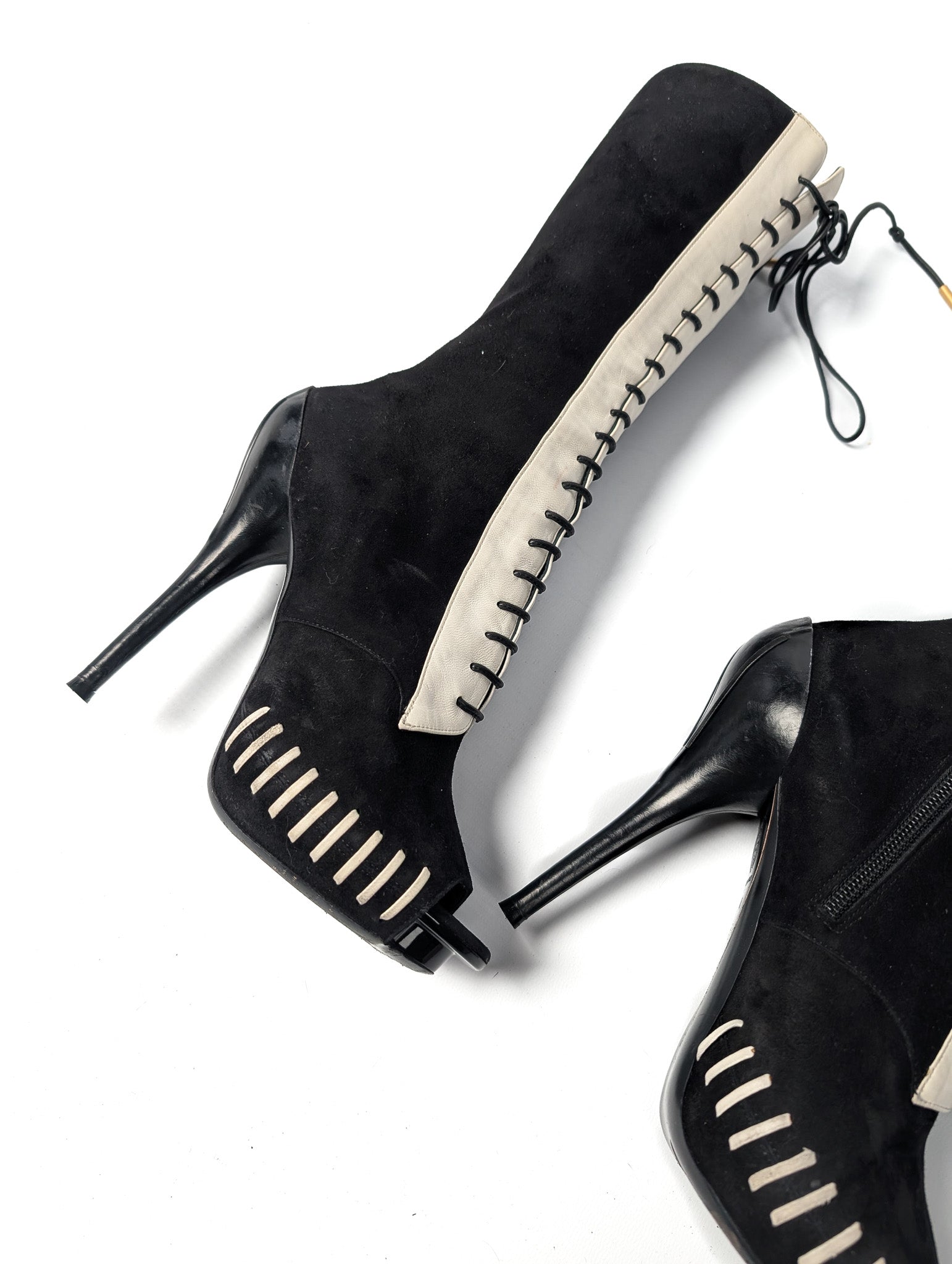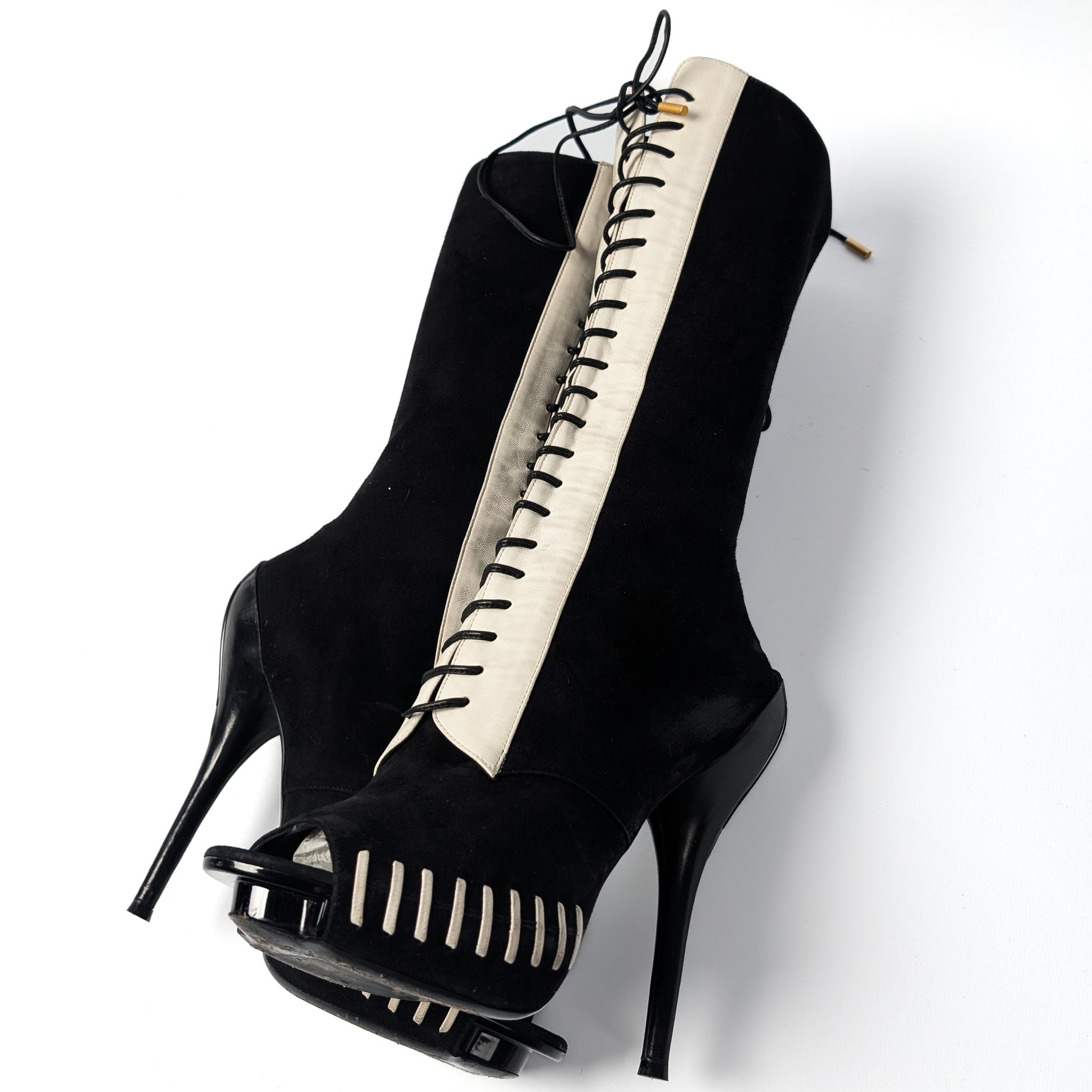 Item: Two-tone platform suede open boots.