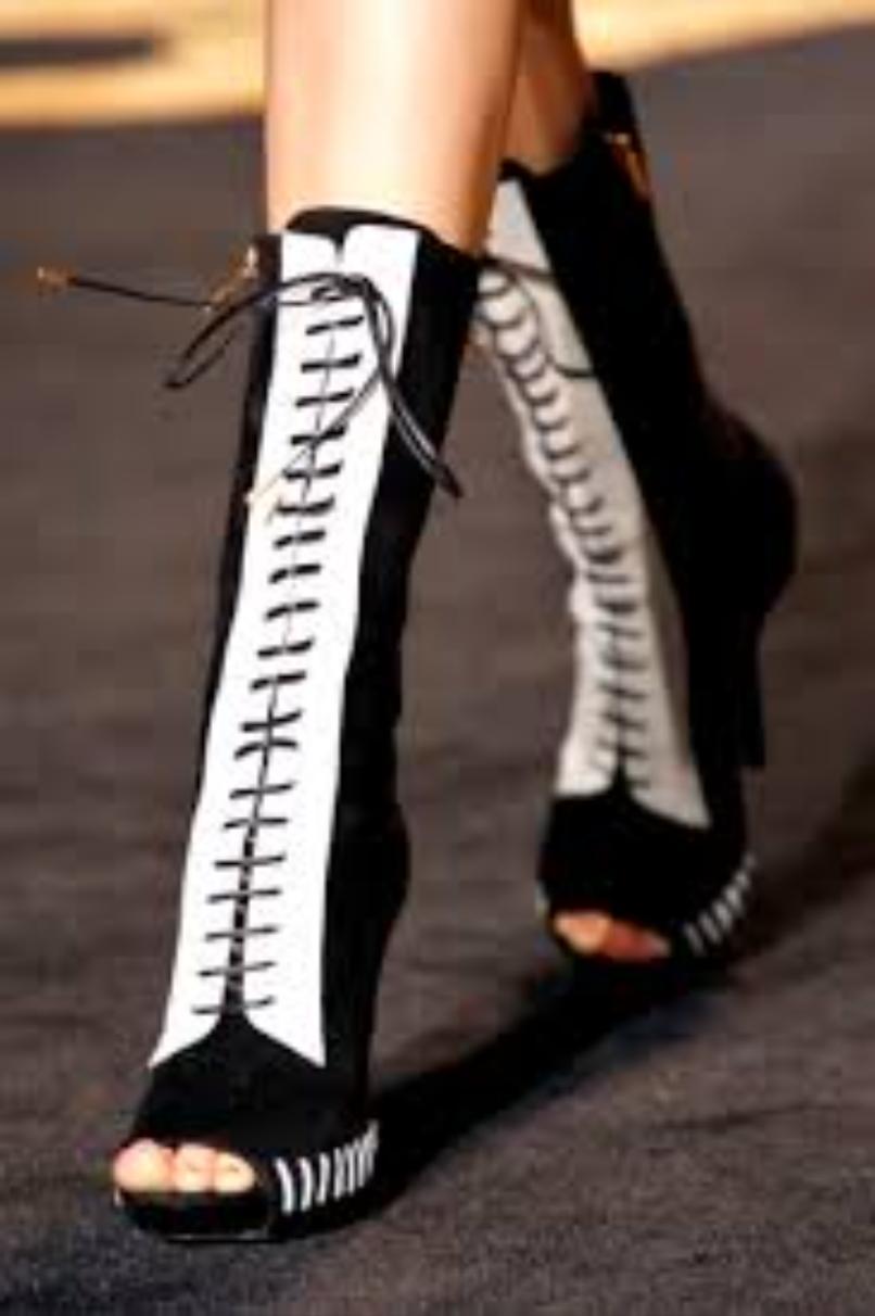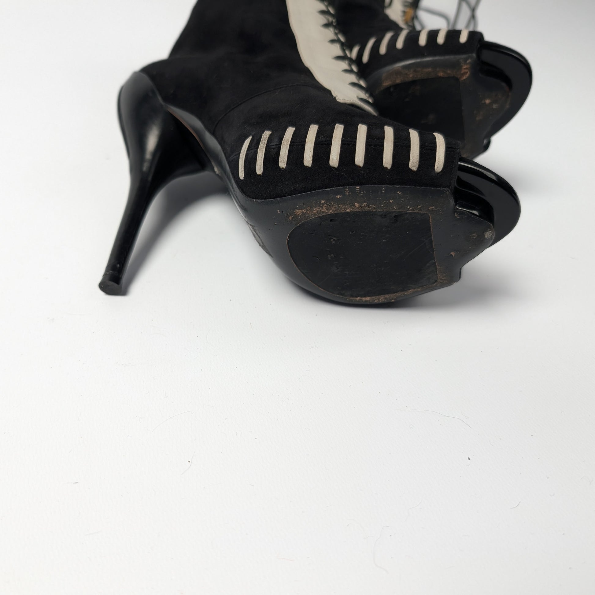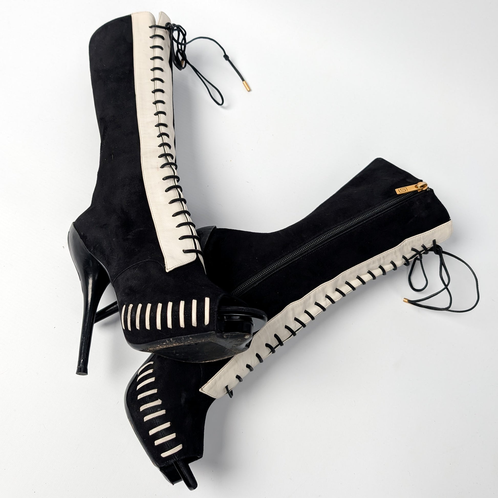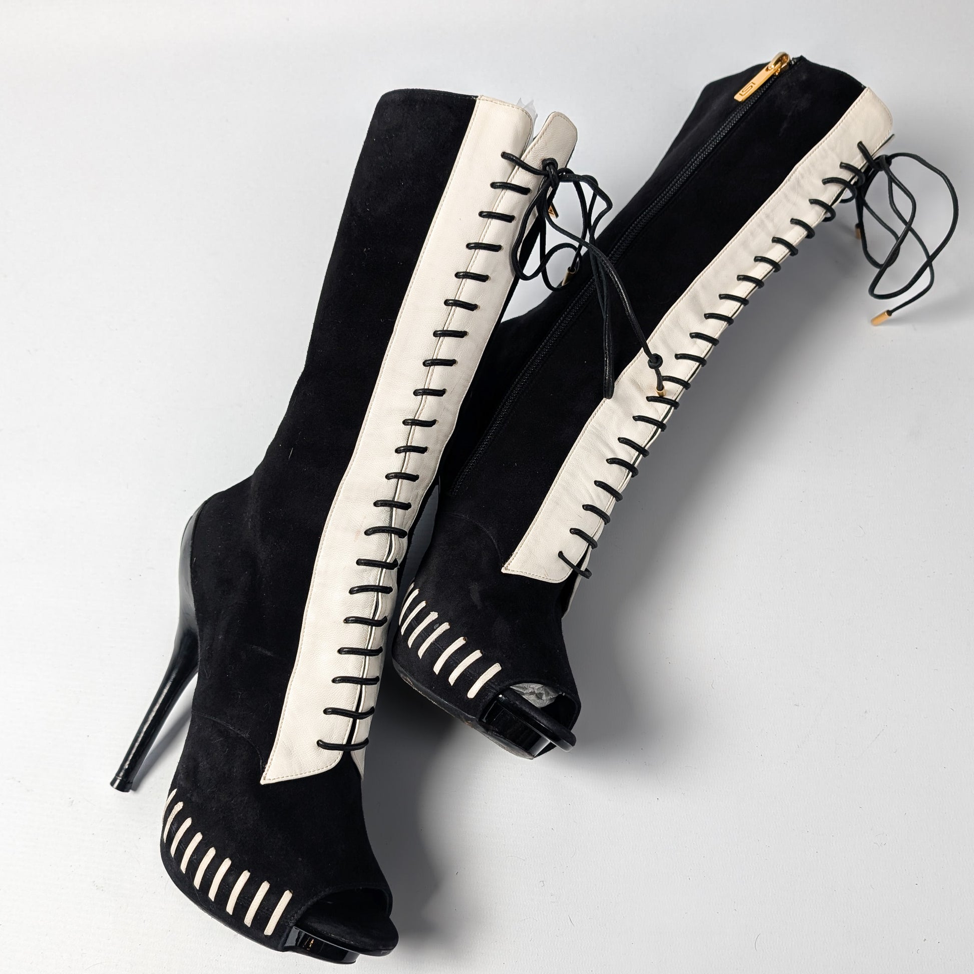 Item: Two-tone platform suede open boots.