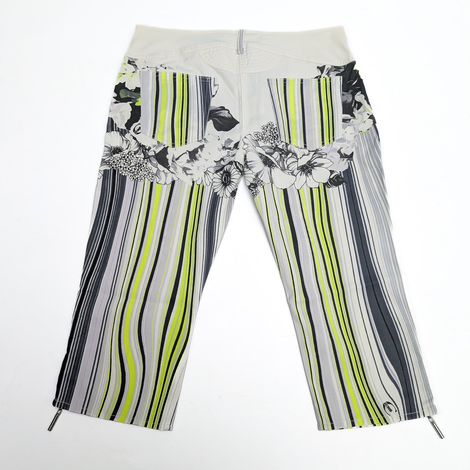 Item: Multicolor abstract patterned denim capris.