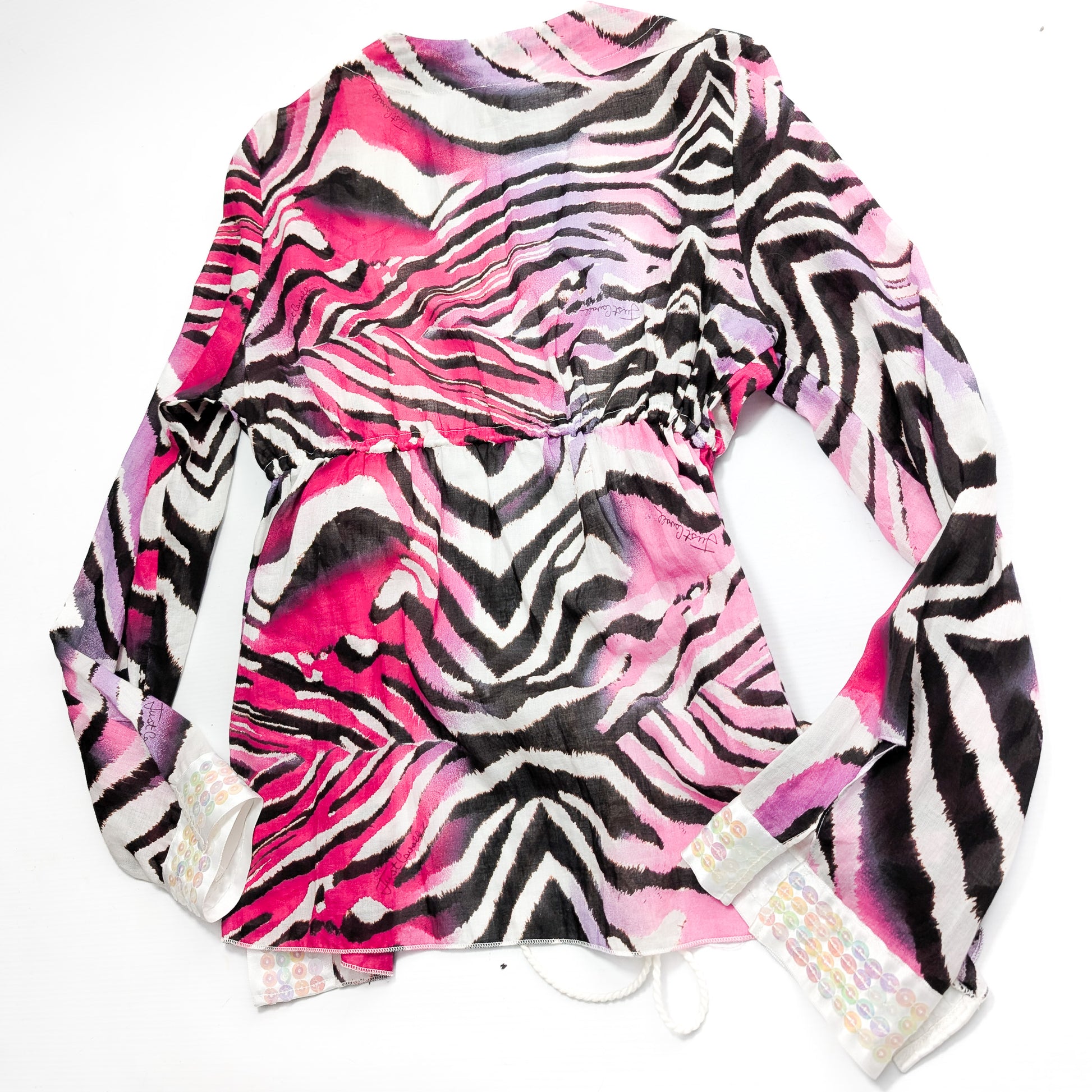 Item: Top adorned with rhinestones in a khaki zebra pattern.