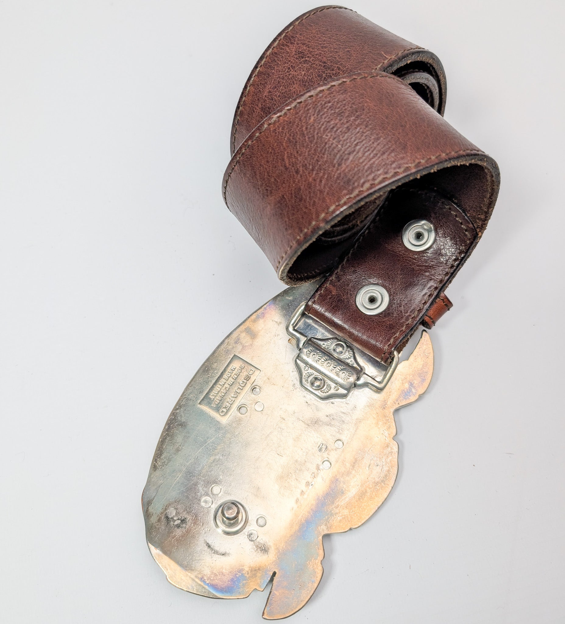 Item: Dsquared2 leather belt with large buckle featuring a palm tree and "Dsquared" lettering
