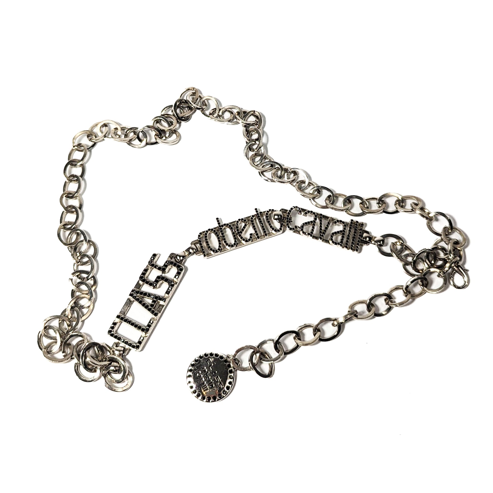 Item: Roberto Cavalli silver chain belt with silver "CLASS" charms and "Roberto Cavalli" inscription.