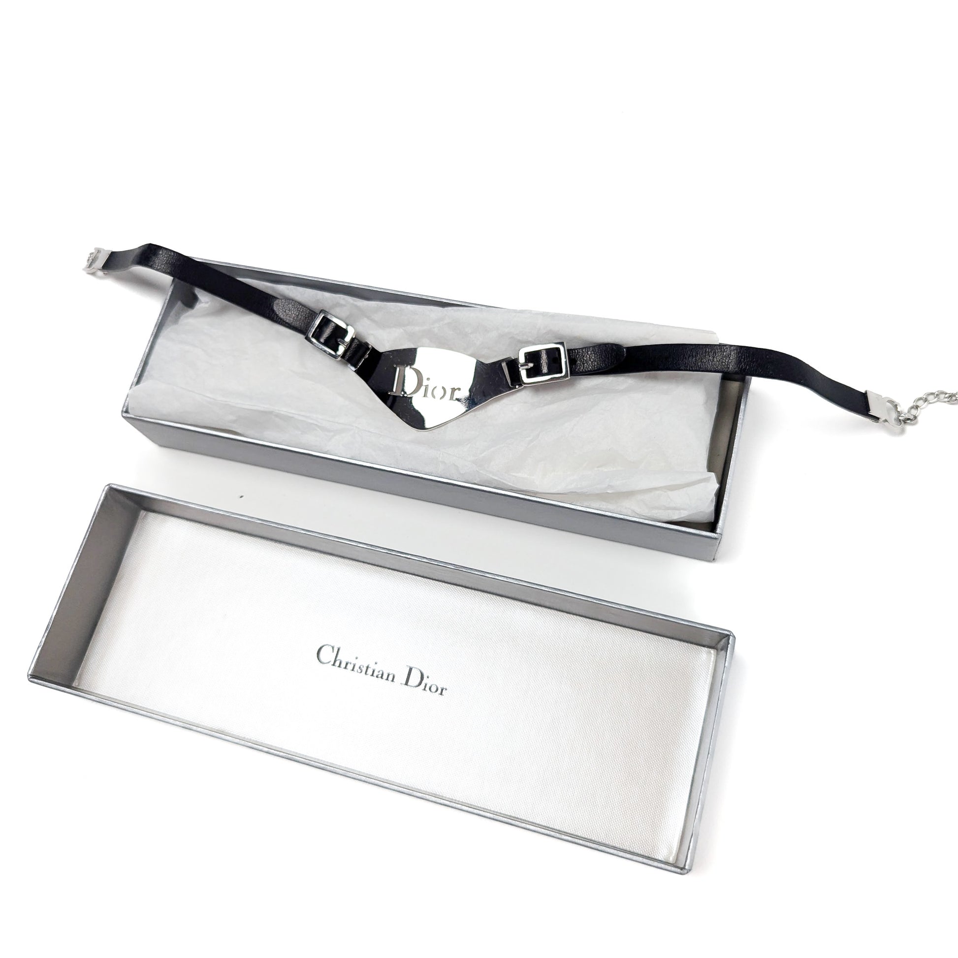 Item : Black leather choker necklace decorated with a plaque signed "Dior".