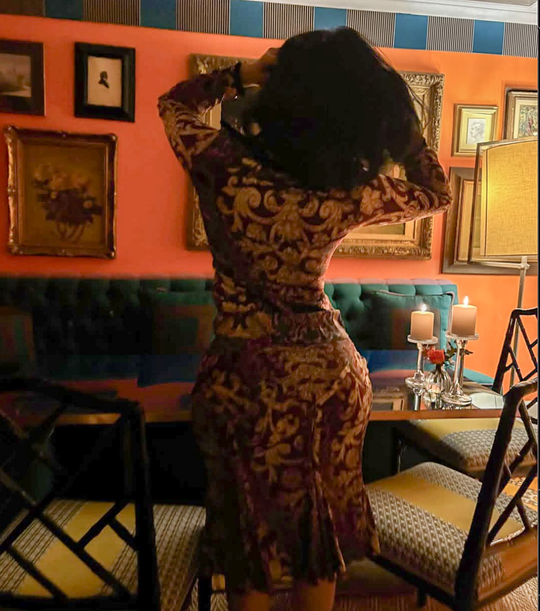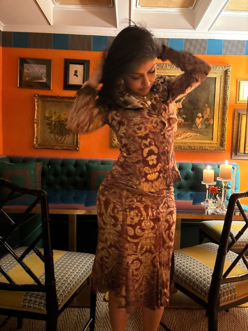 Item: Ensemble top et jupe à imprimé psychédélique orange et orné de détails en métal.