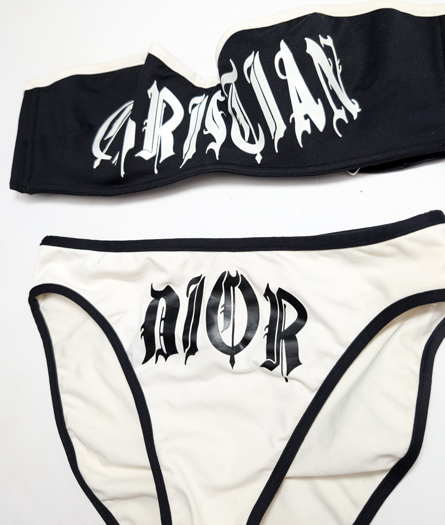 Item: Black and white ensemble adorned with a Gothic-style "Christian Dior" inscription.