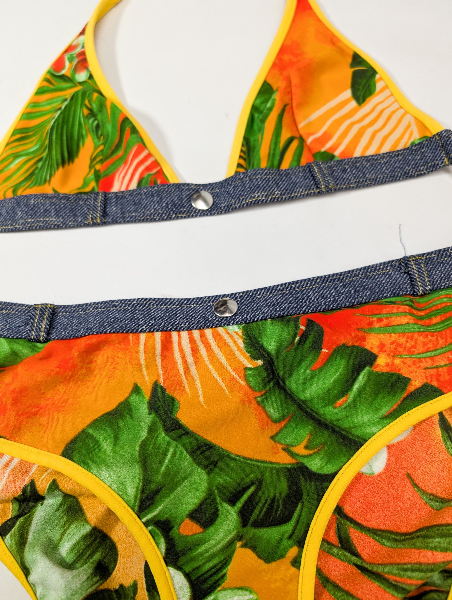Item: Pants and Two-piece swimsuit with a multicoloured print.