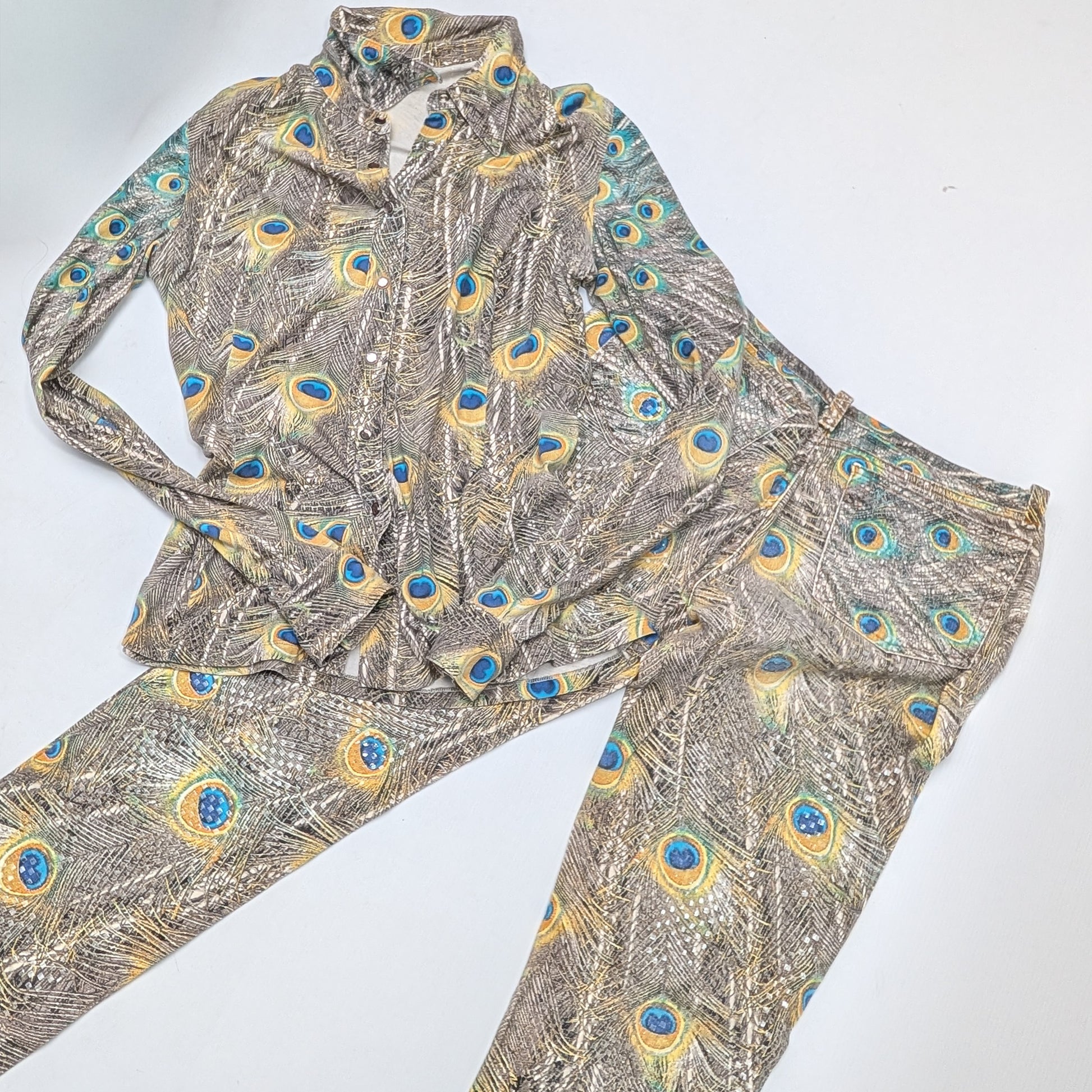 Item: Set consisting of low-rise denim pants adorned with rhinestones and a cotton shirt featuring a peacock pattern.
