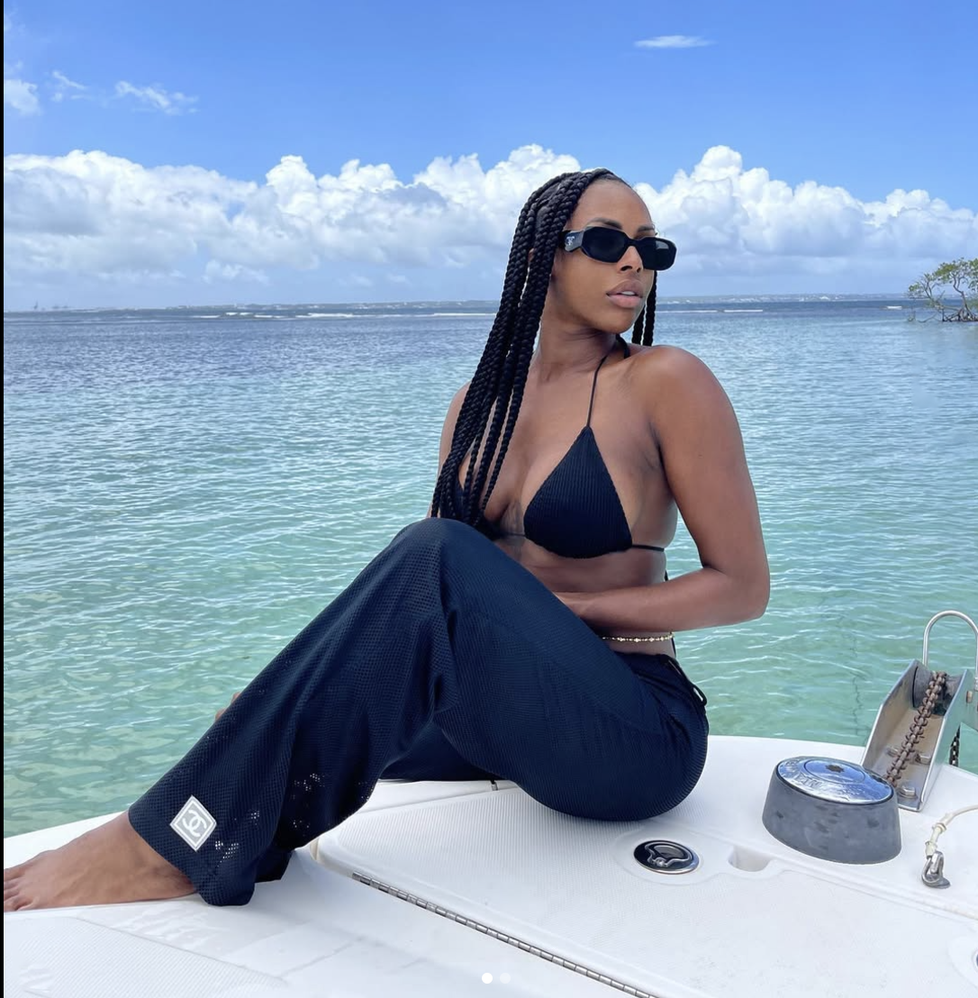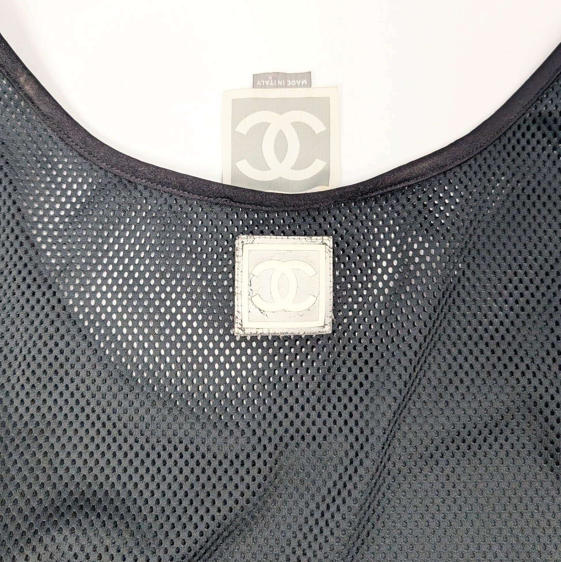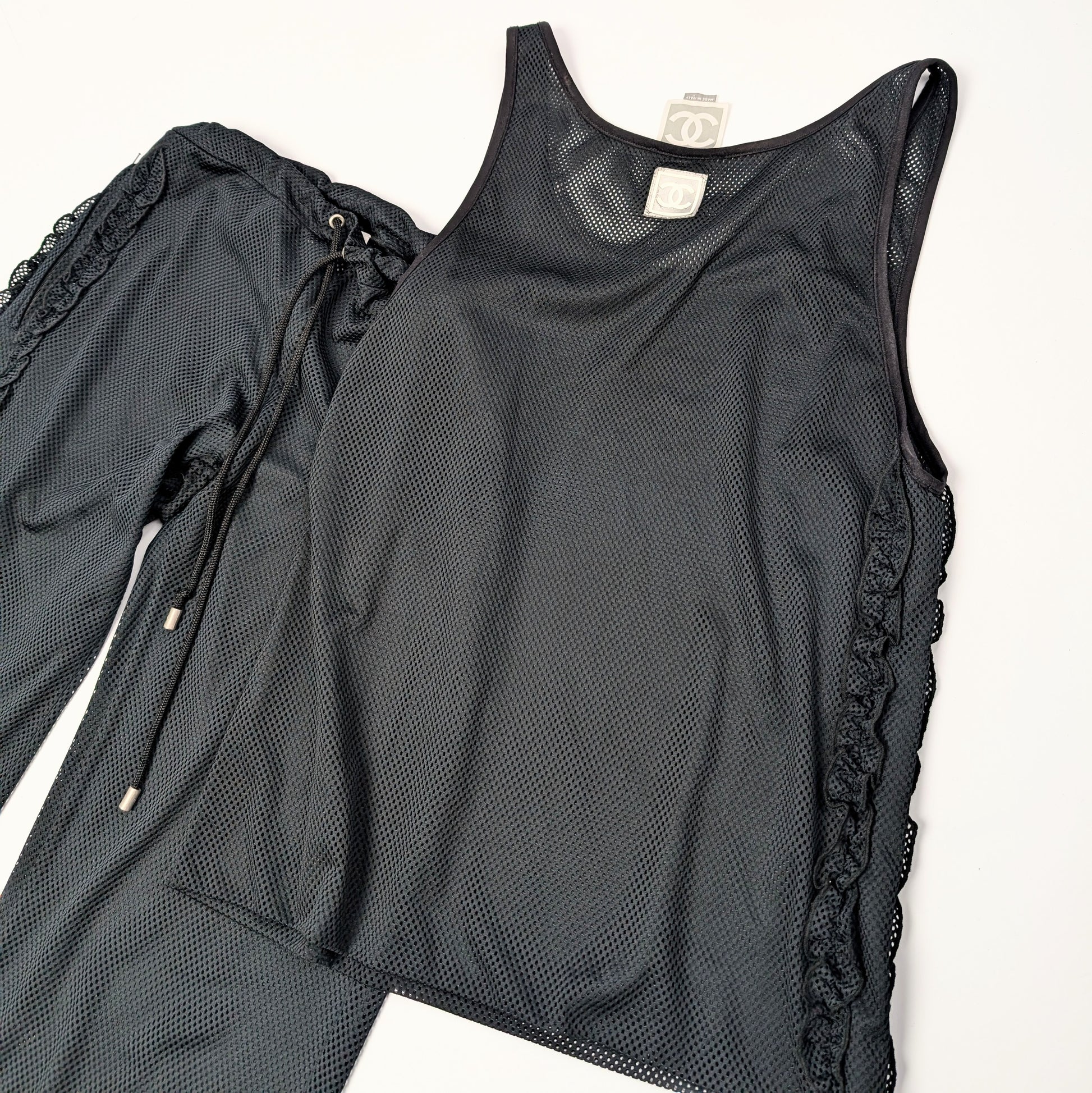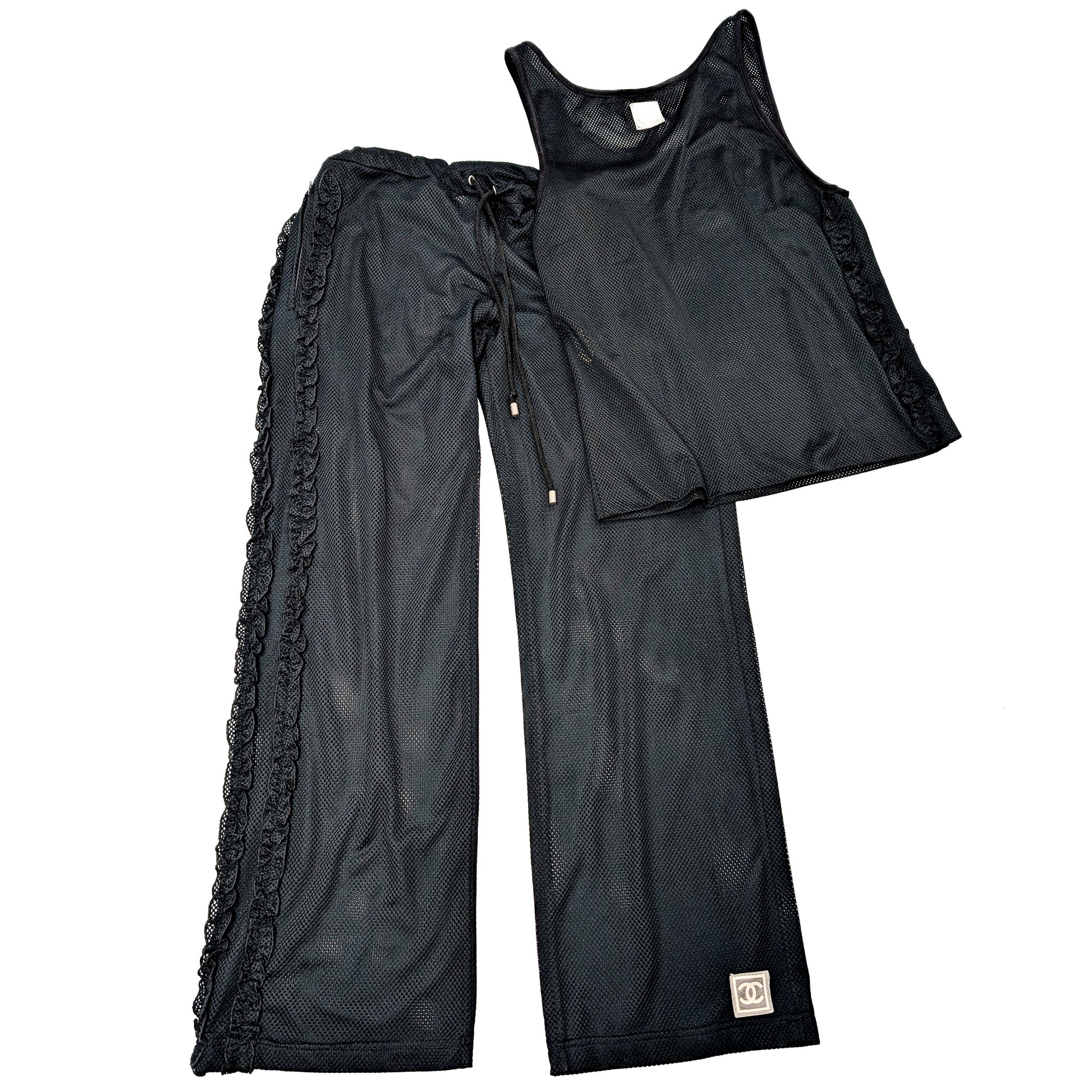 Item: Sporty style tank top and pants set, slightly transparent, decorated with the Chanel logo.