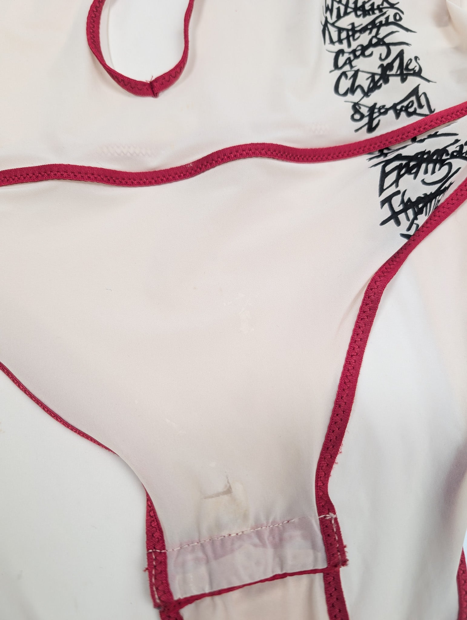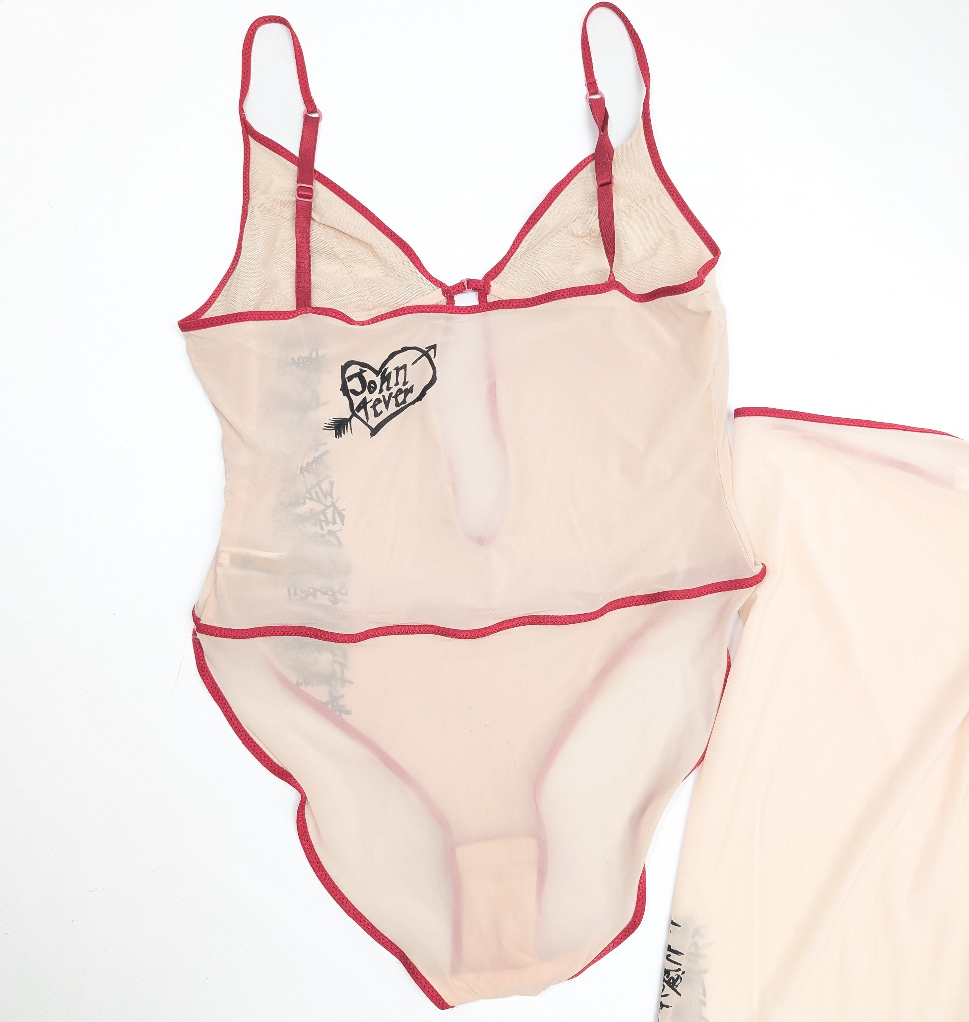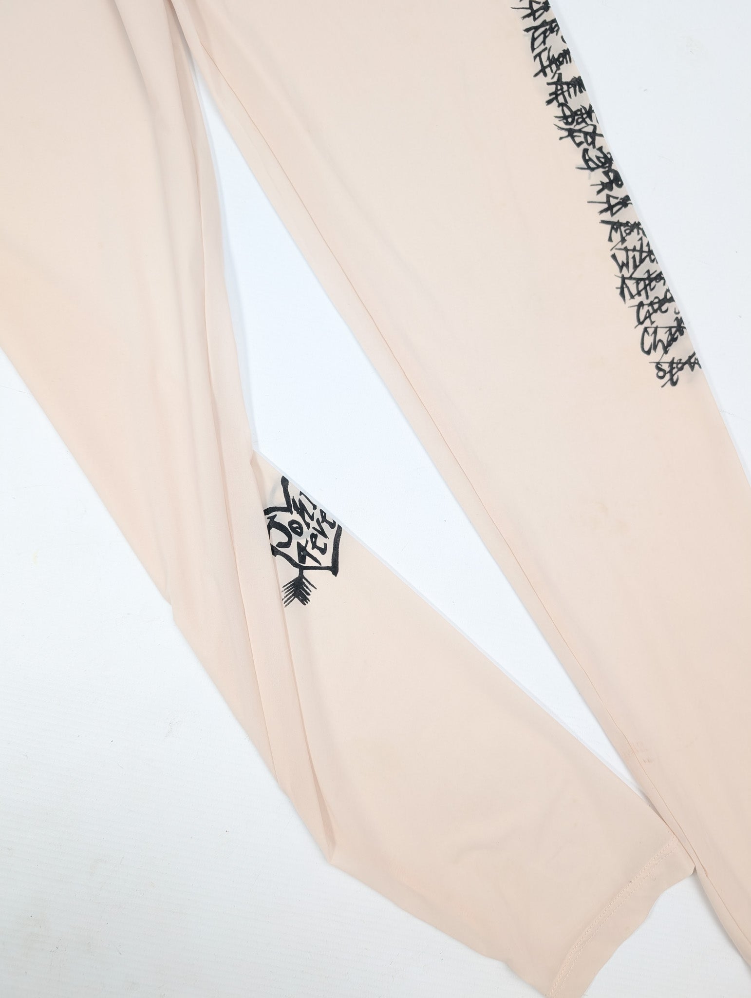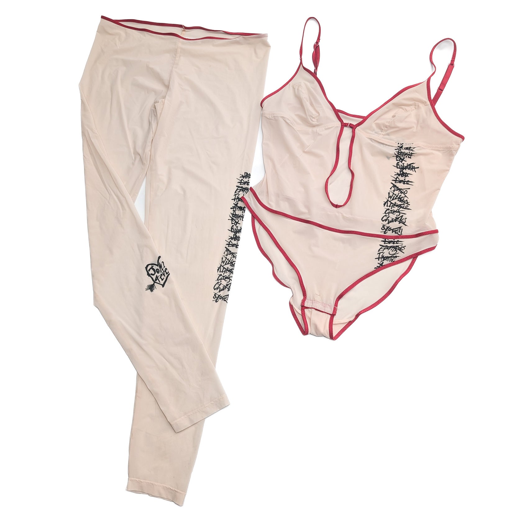 Item: Stretch legging and bodysuit set in sheer material adorned with fake tattoos.