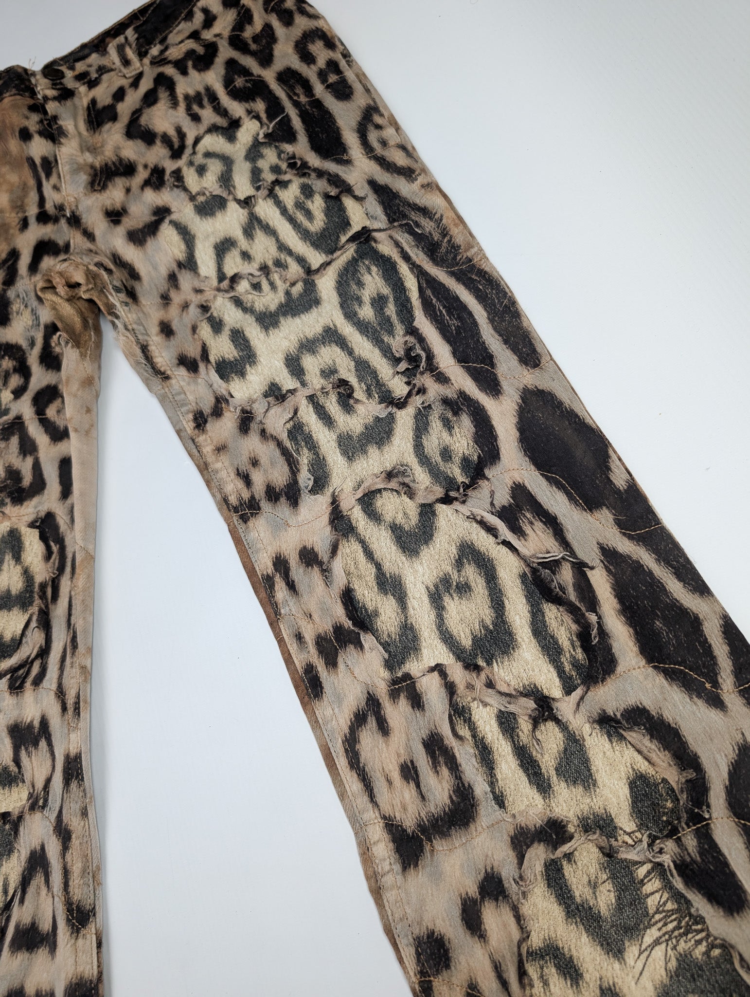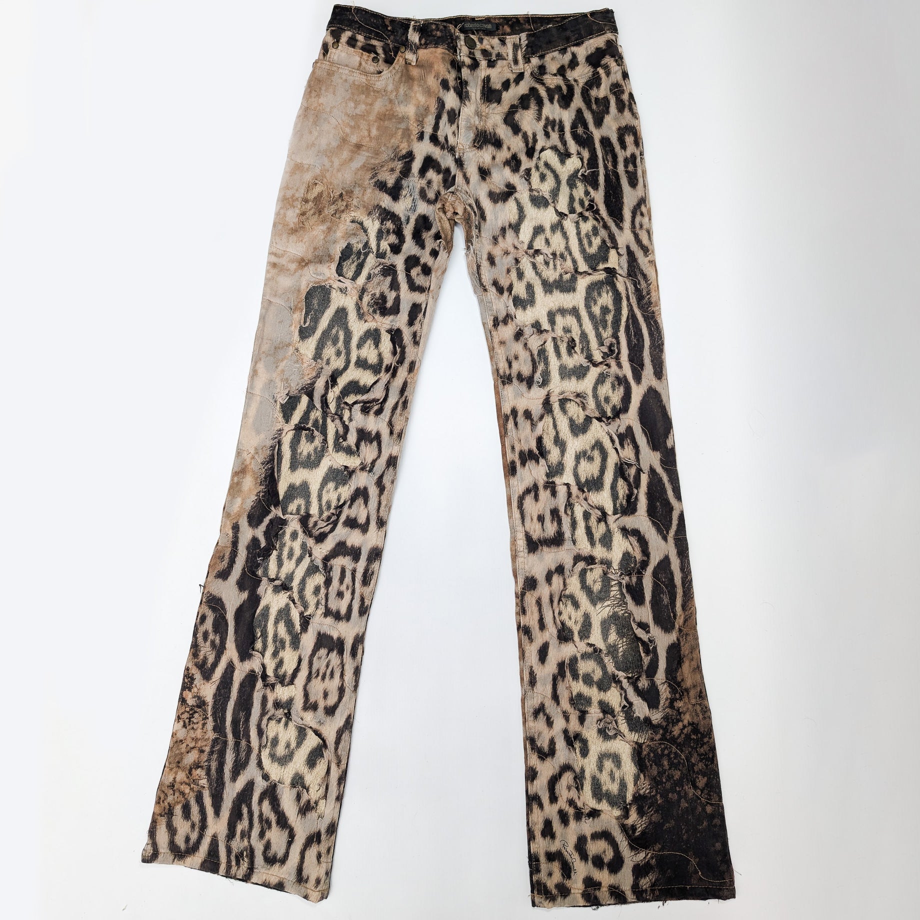 Item: Animal print jeans, leopard print on the front and tie-dye on the back. Destroyed effect.