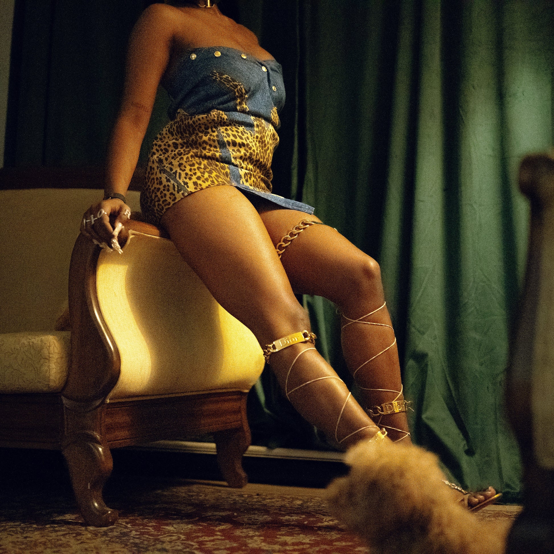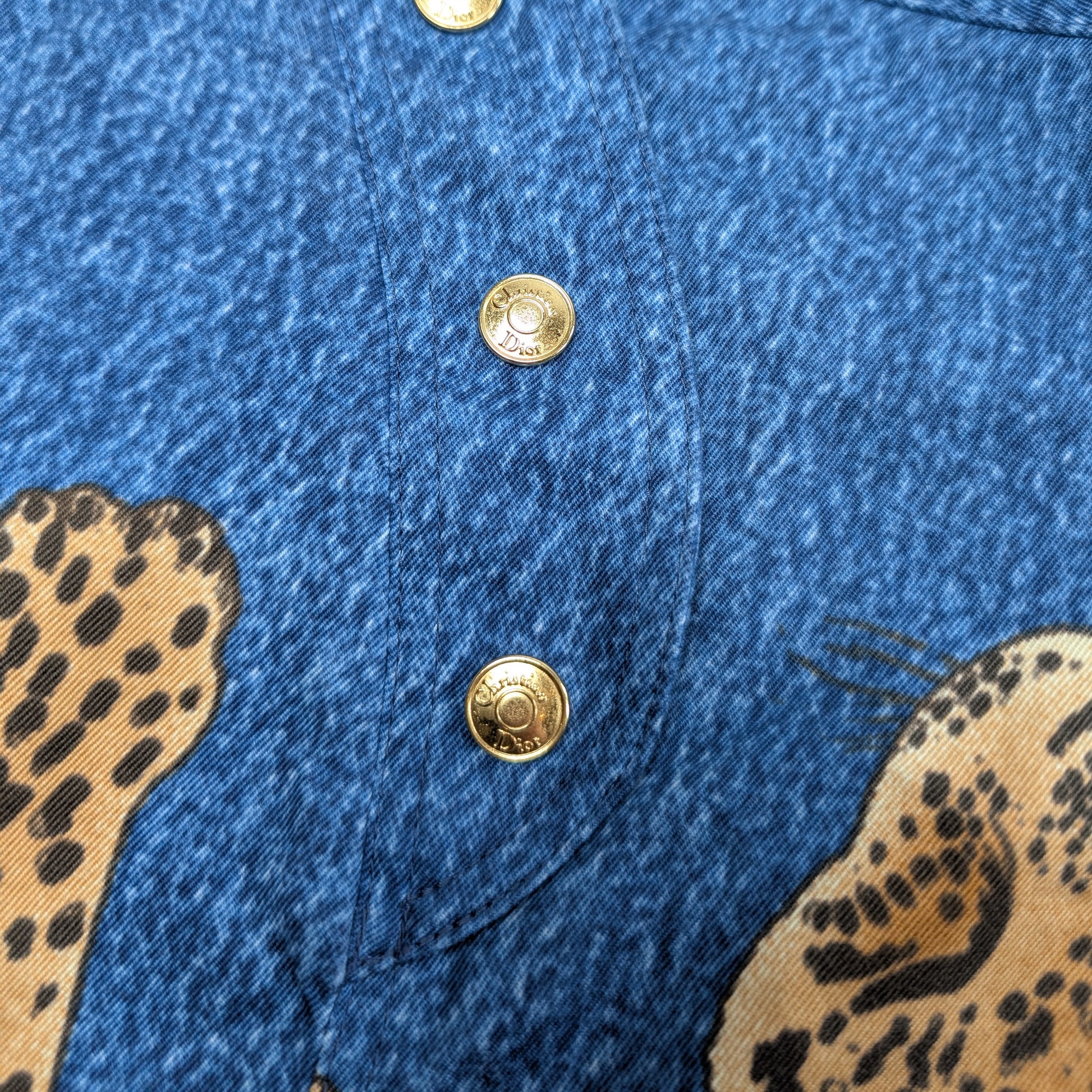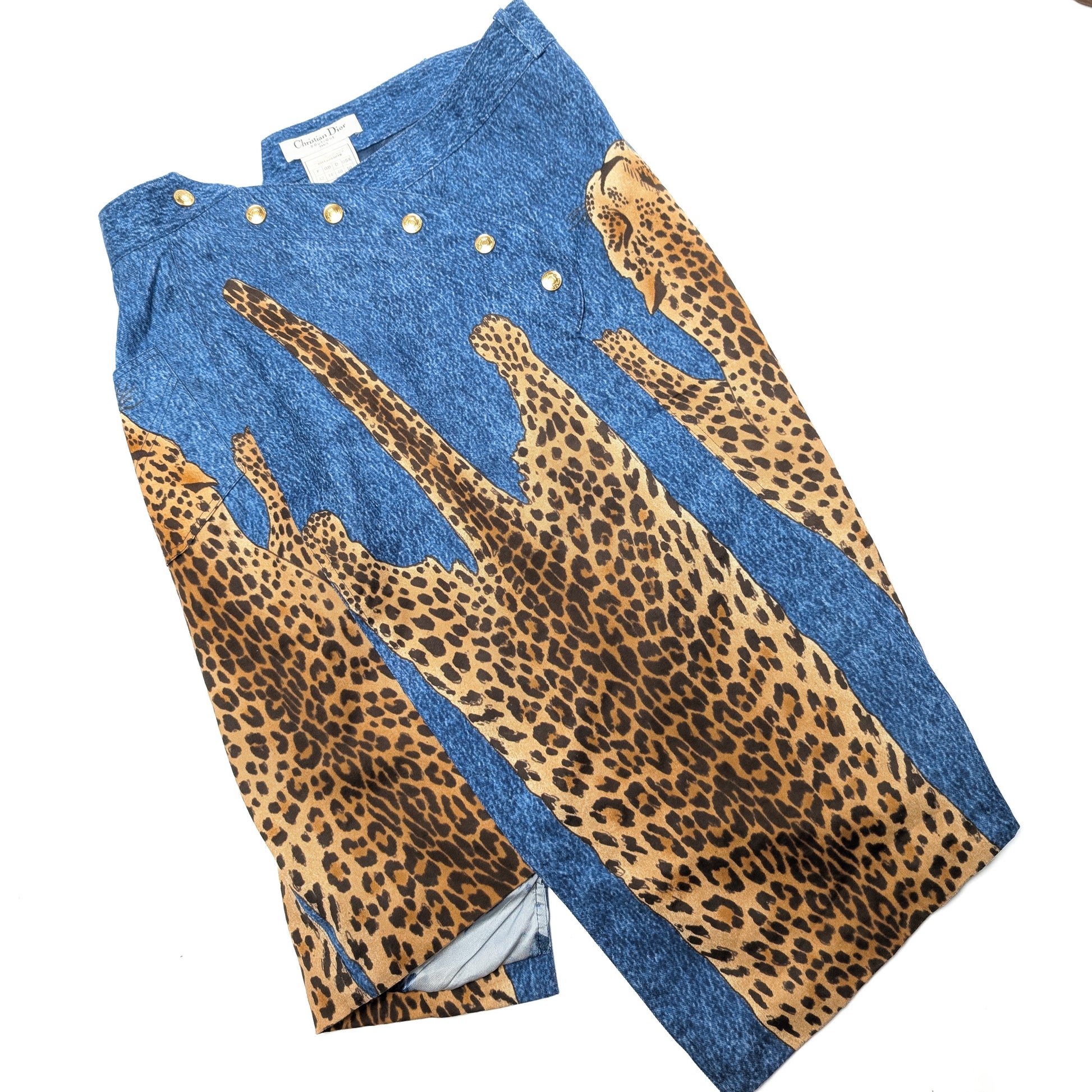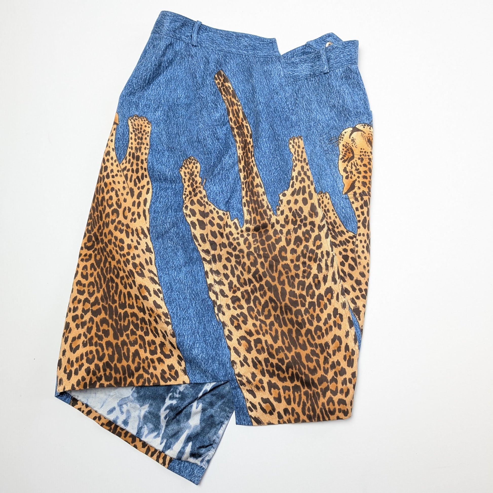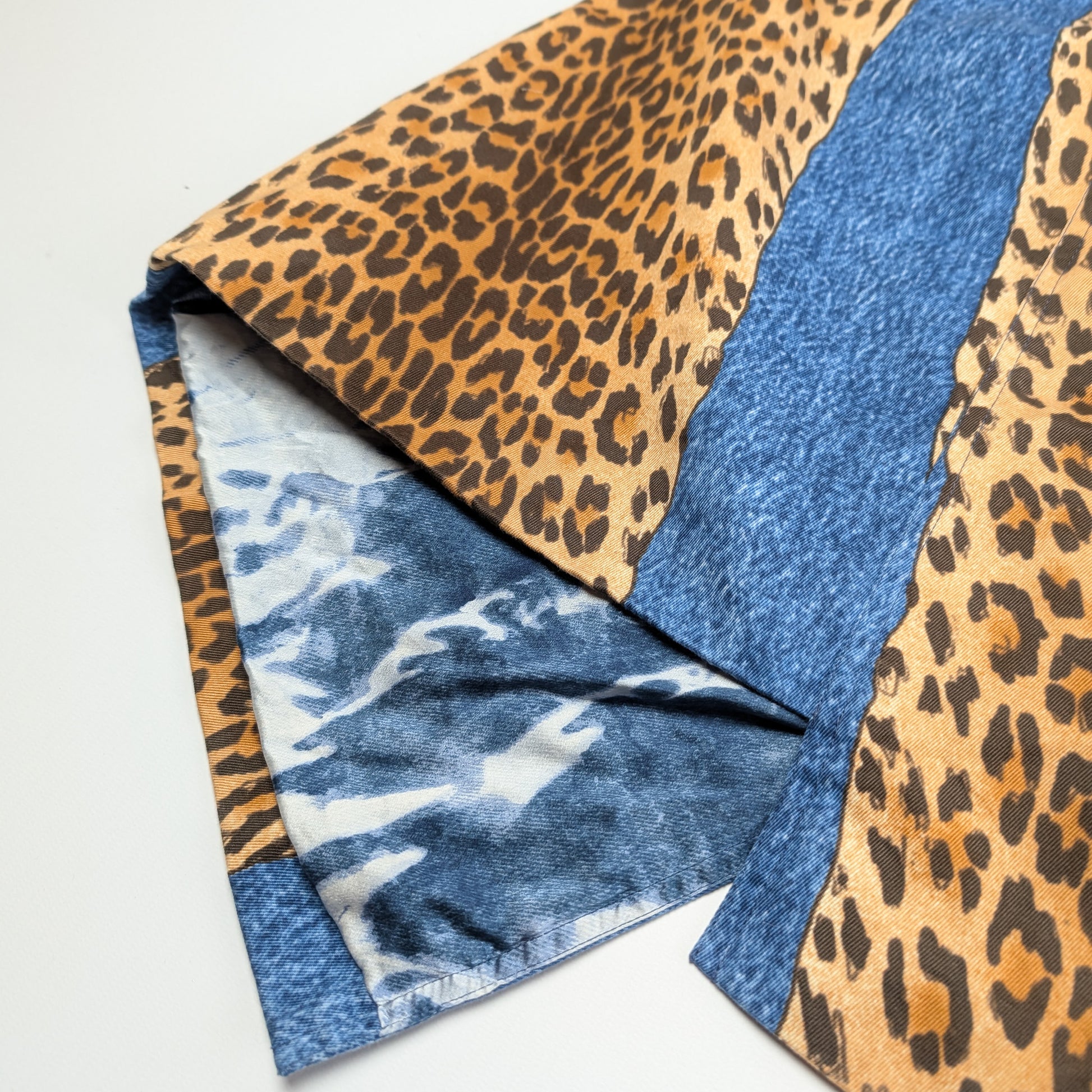 Item: Lightweight denim skirt with faux leopard print. Asymmetrical. Can also be worn as a bandeau dress.