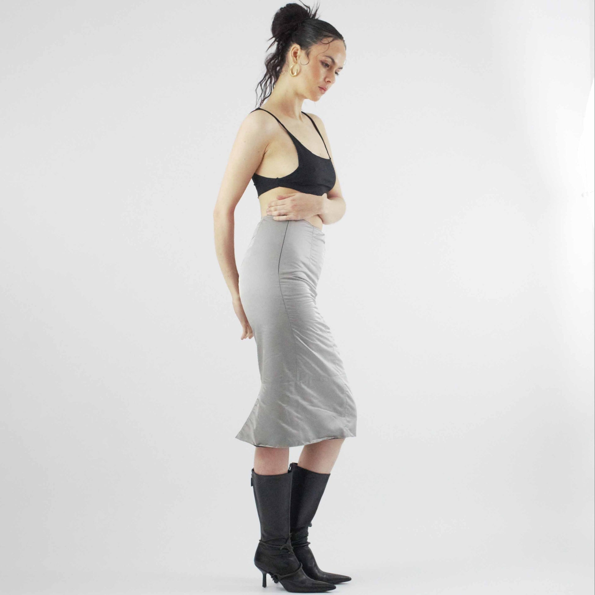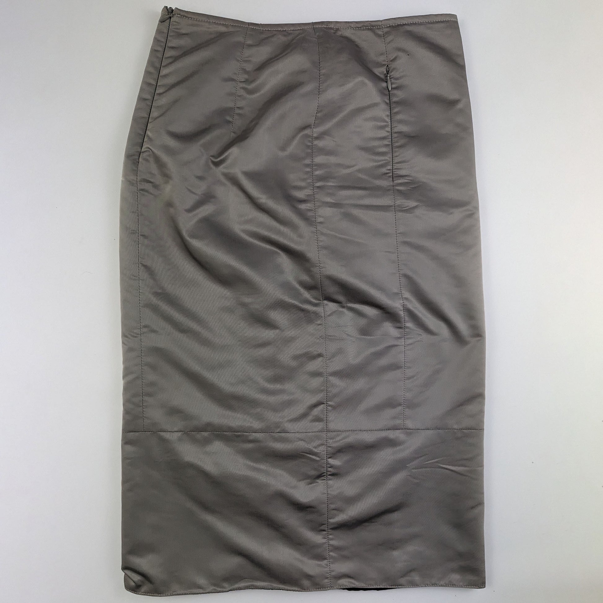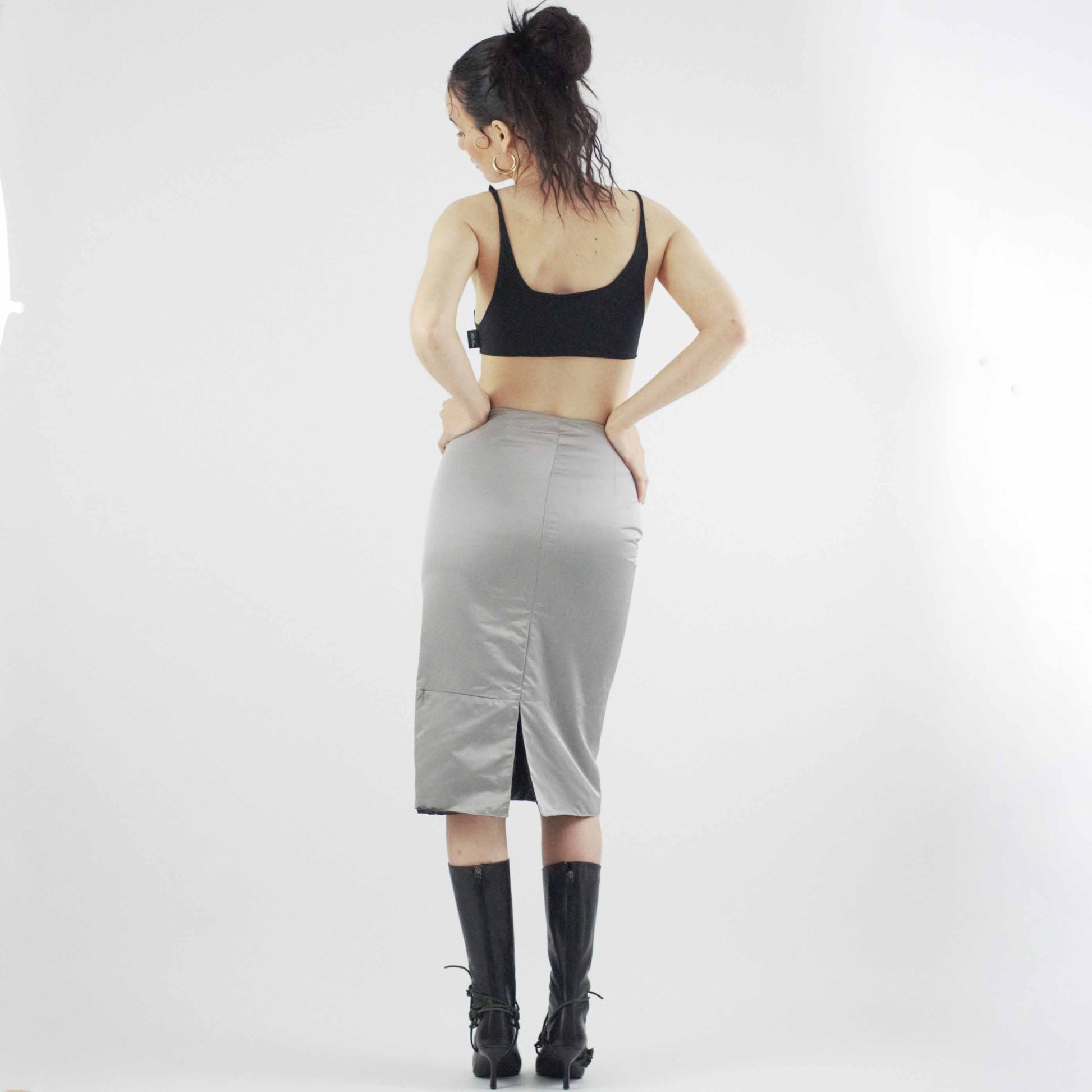 Item: Reversible knee length sheath skirt. Satin gray on one side and logo monogram on the other.