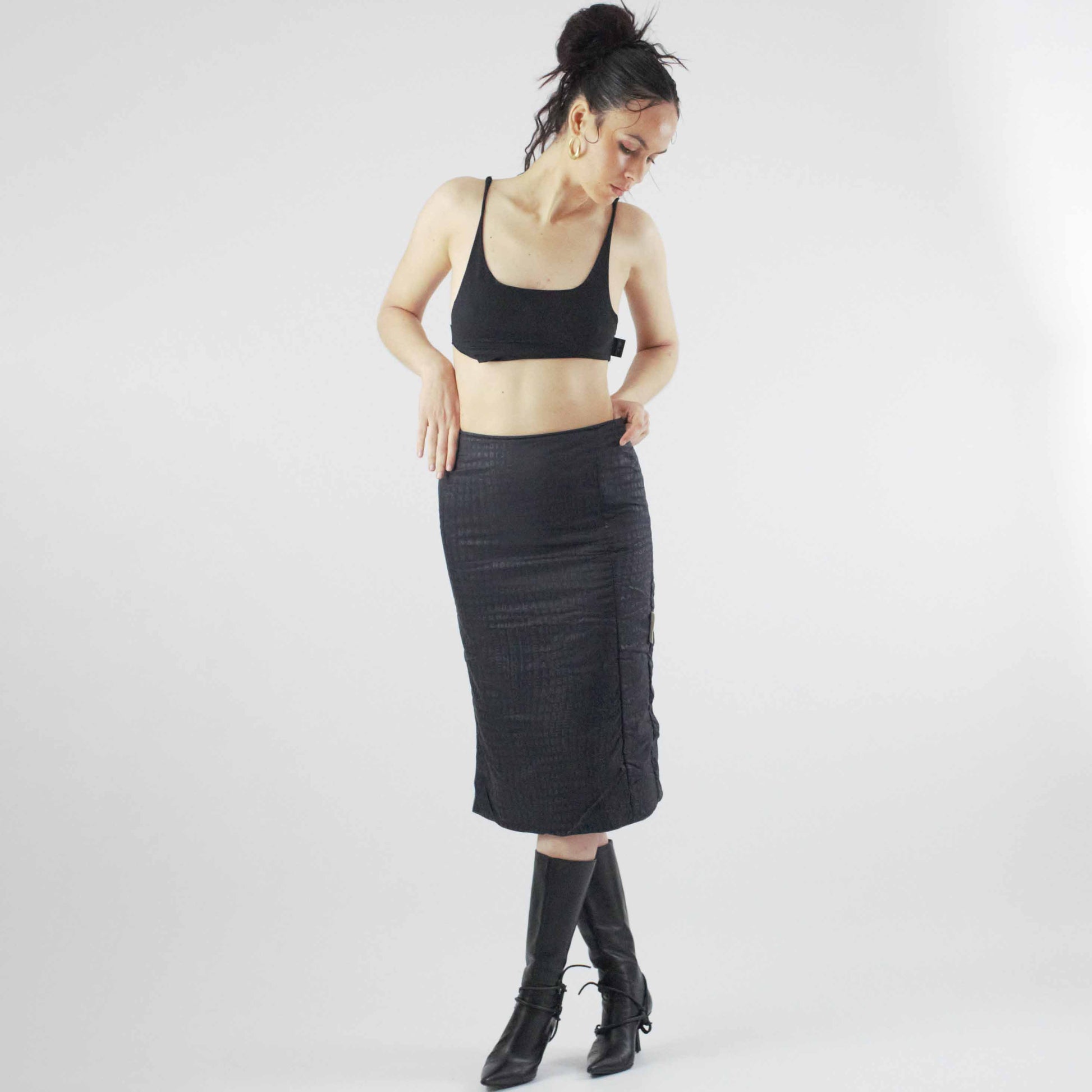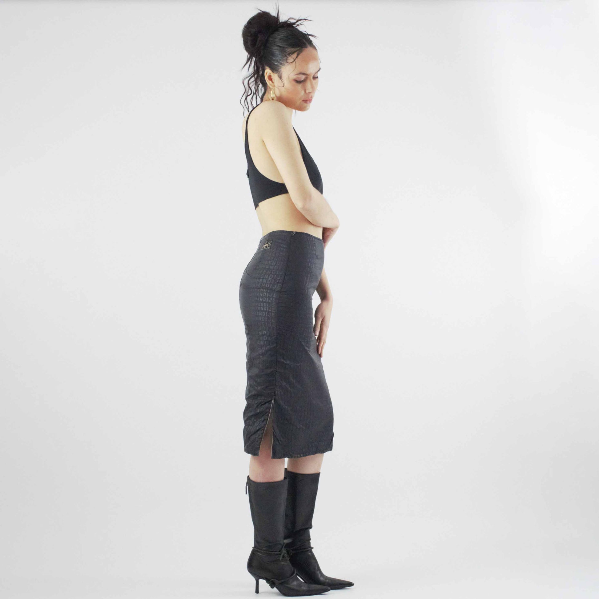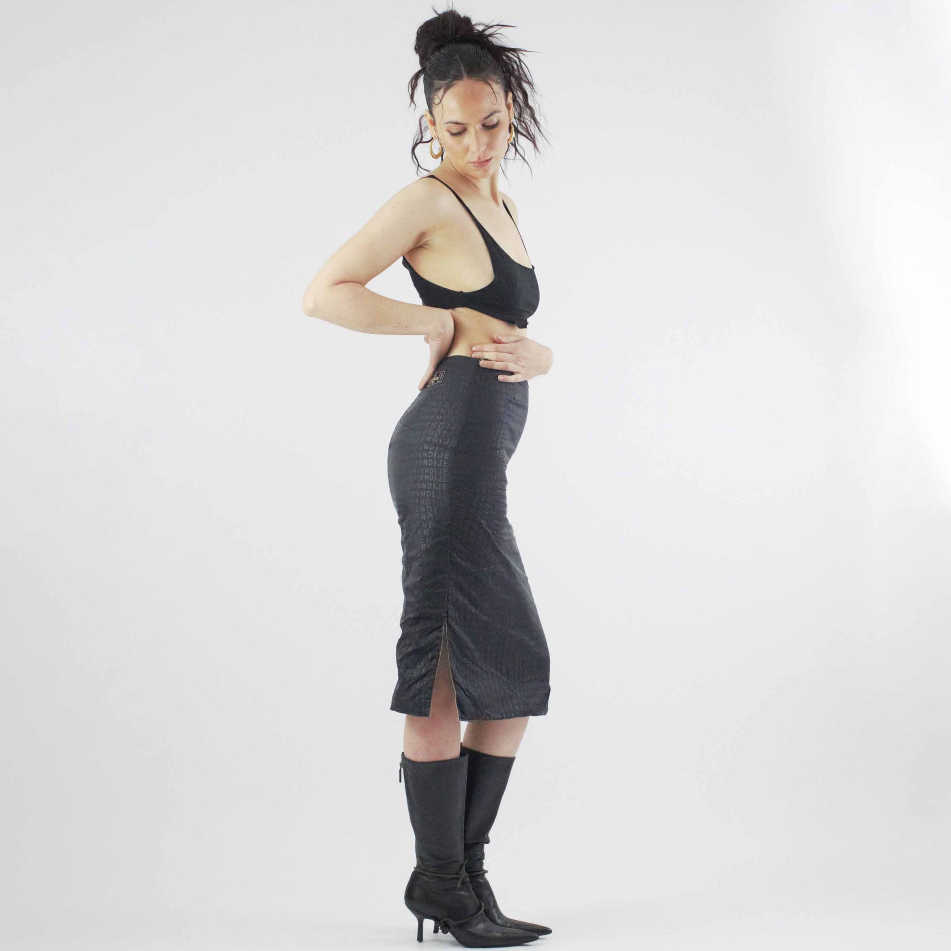 Item: Reversible knee length sheath skirt. Satin gray on one side and logo monogram on the other.
