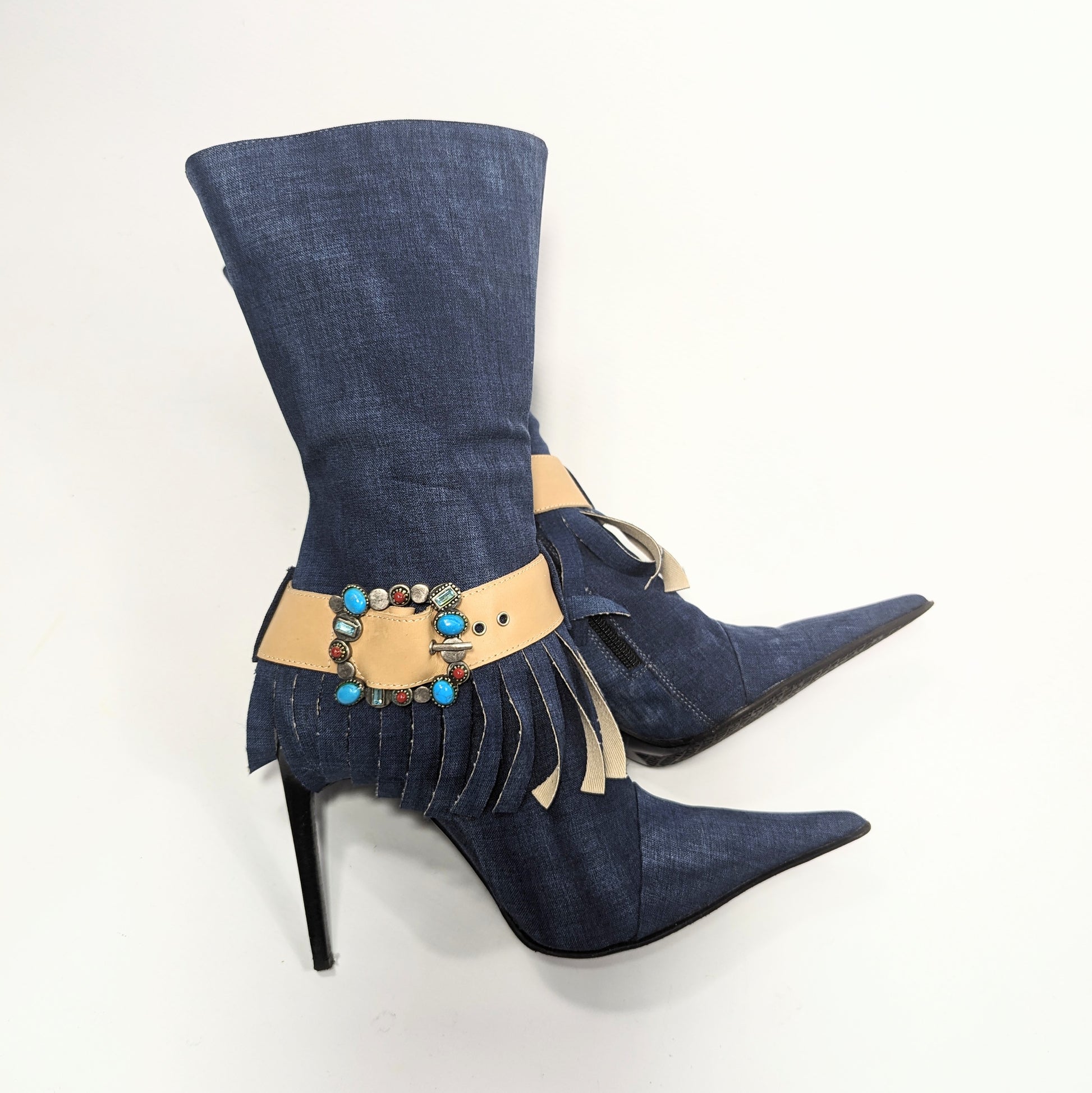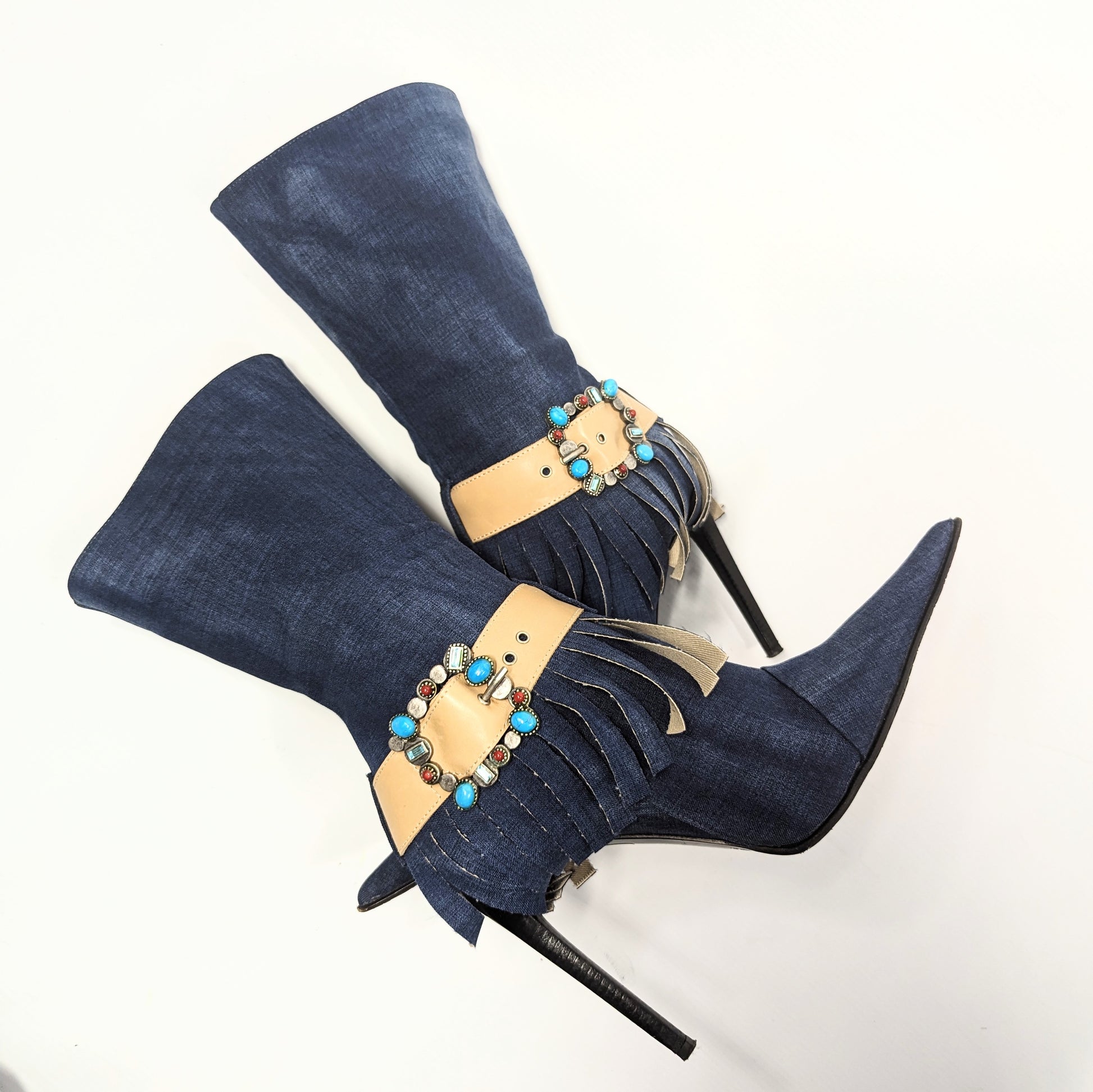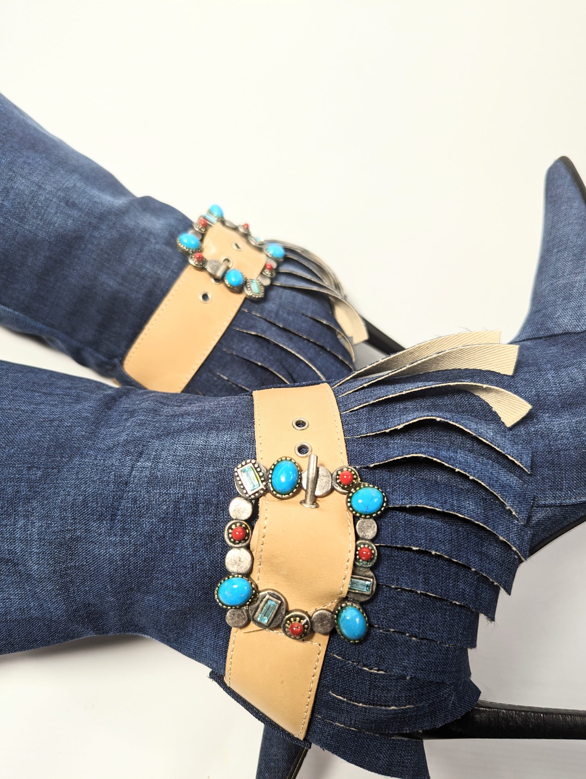 Item: Denim boots decorated with a leather strap with multicolor stone strap