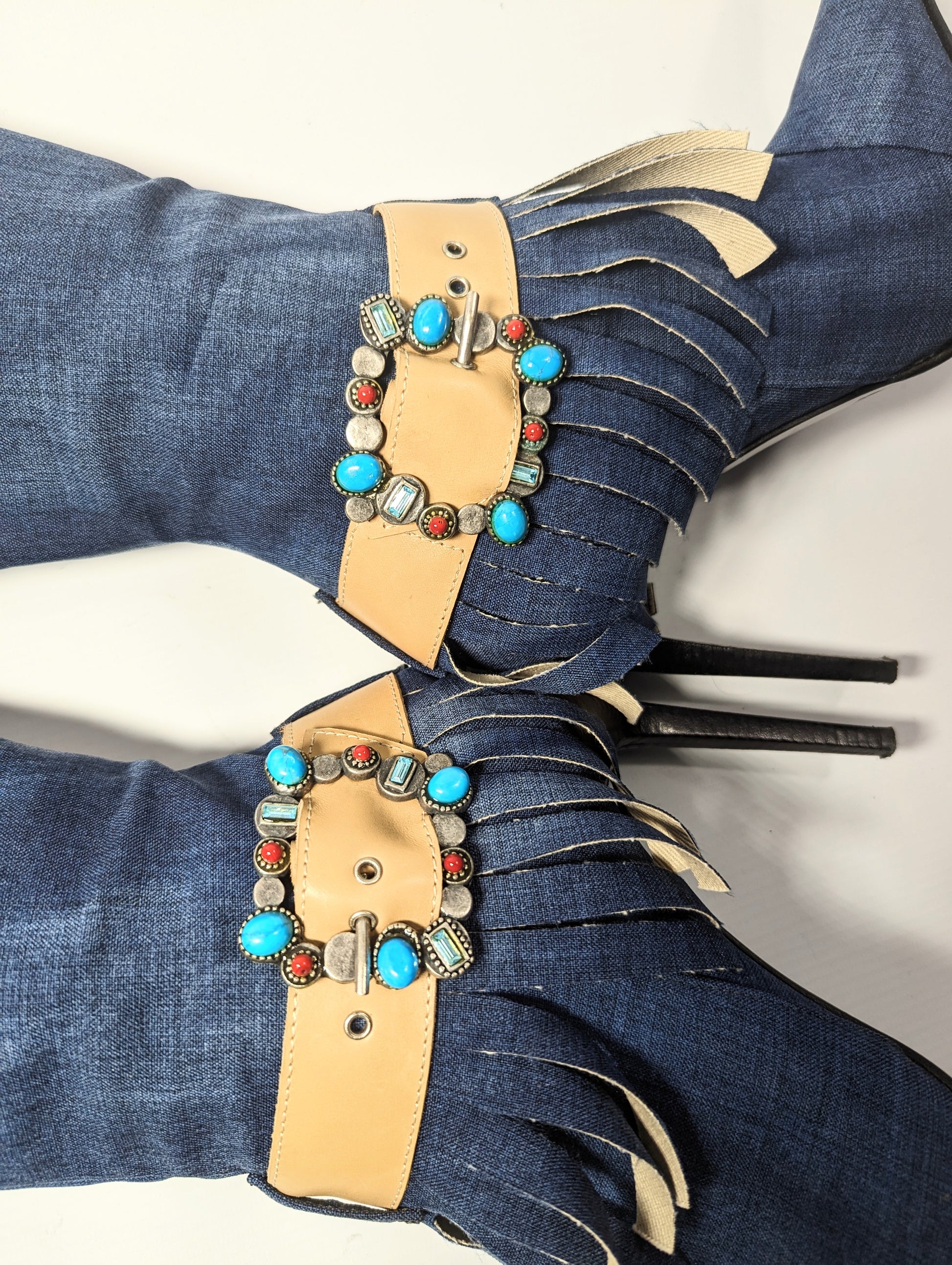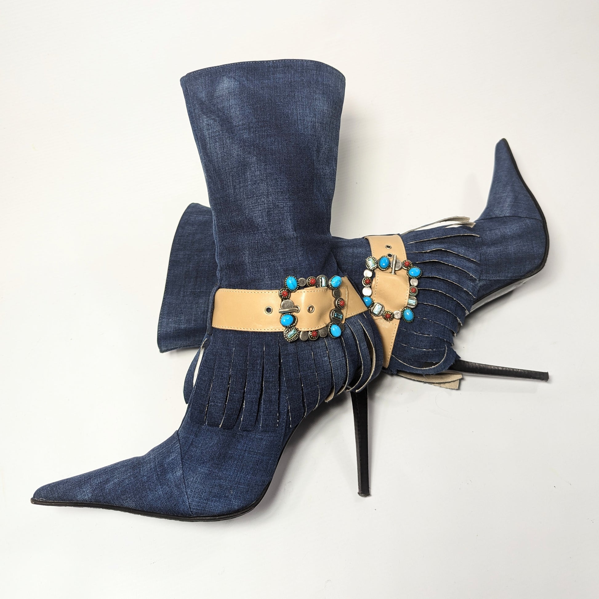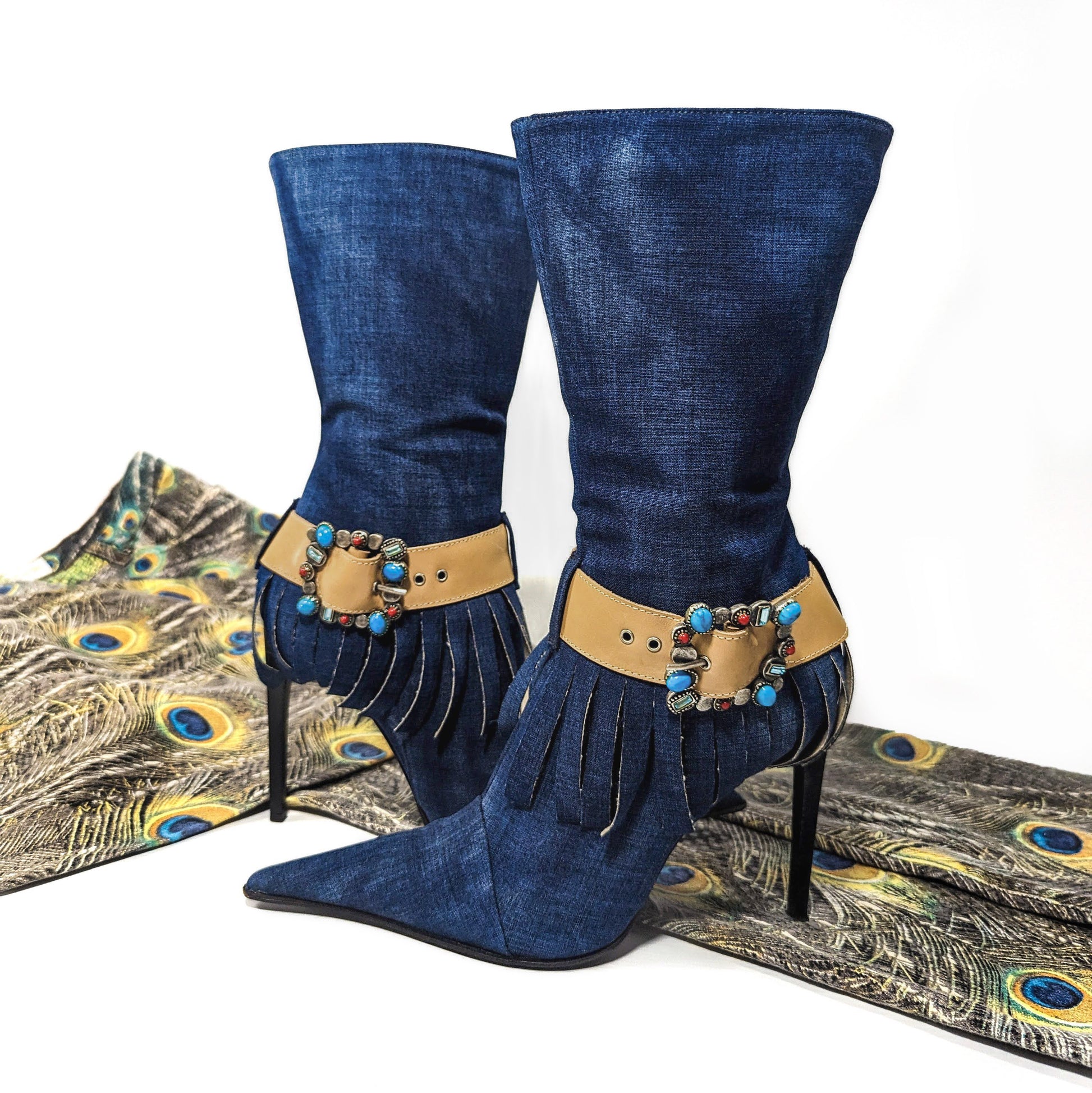Item: Denim boots decorated with a leather strap with multicolor stone strap