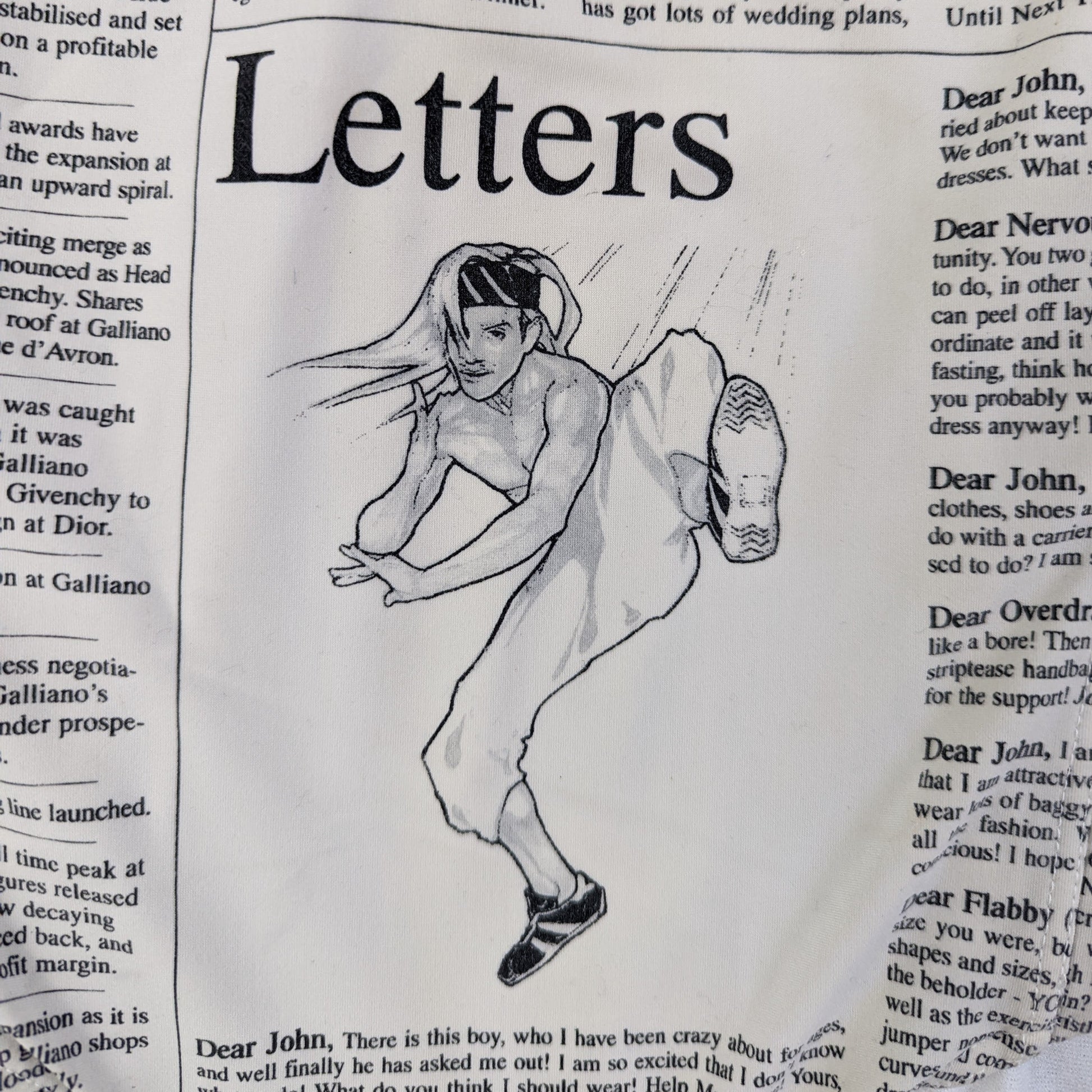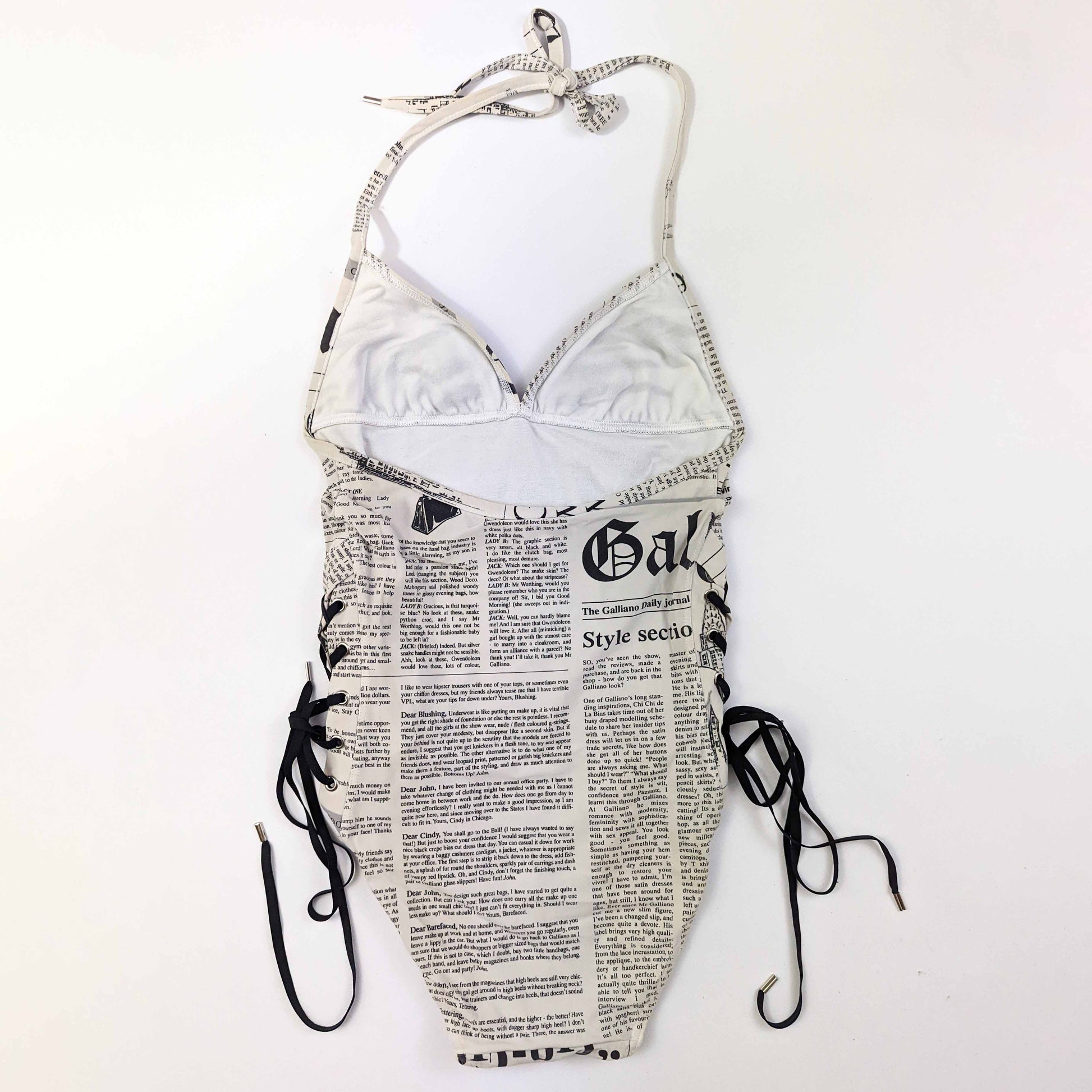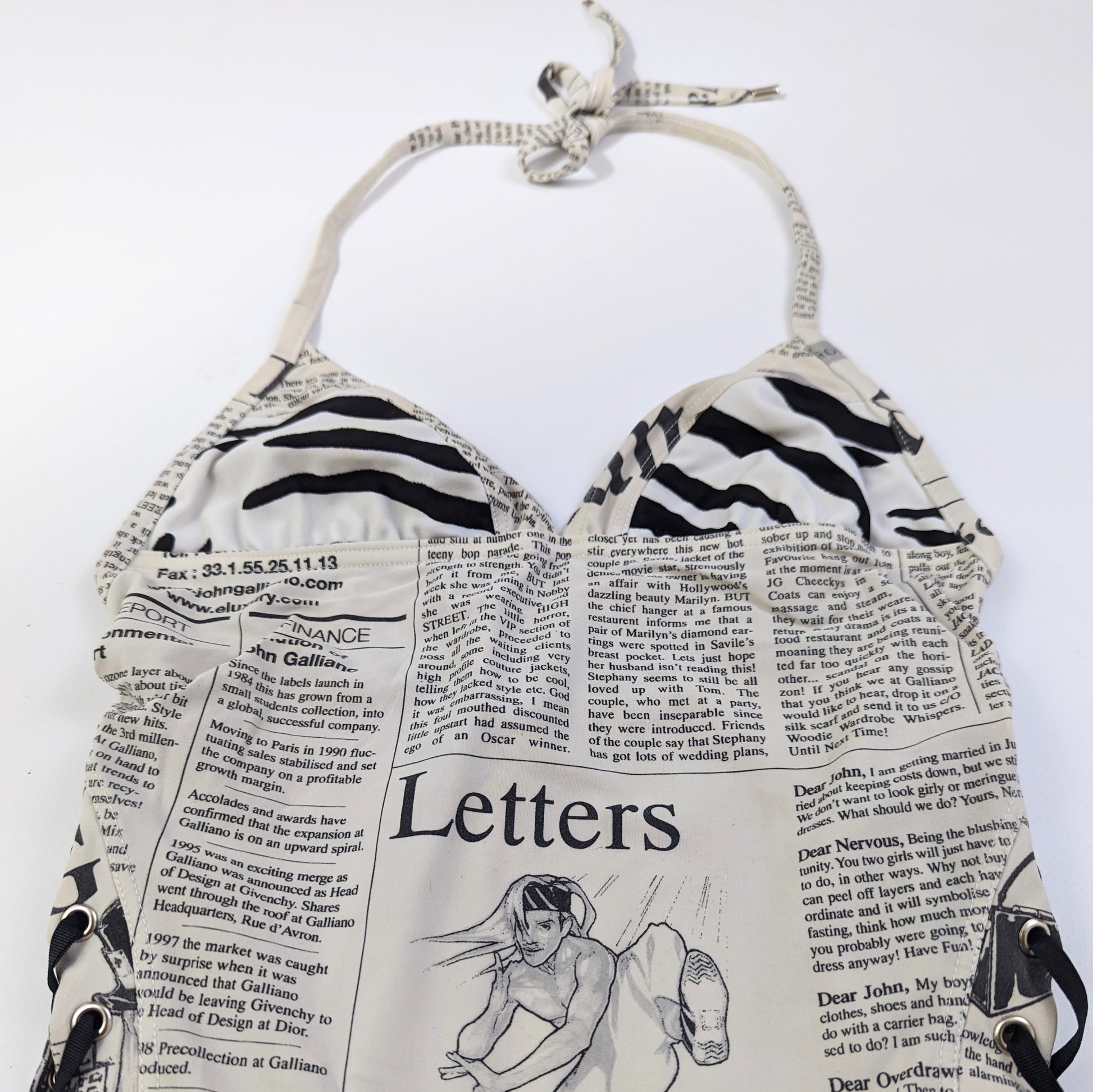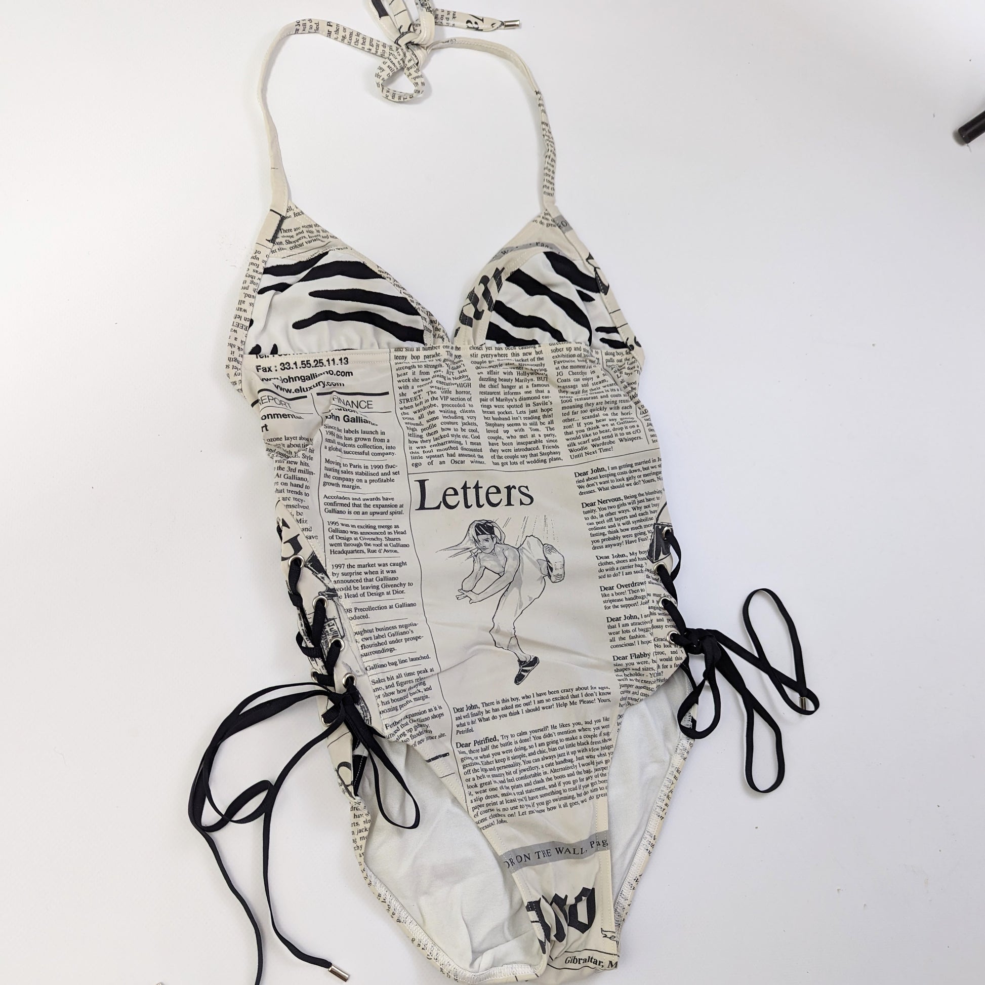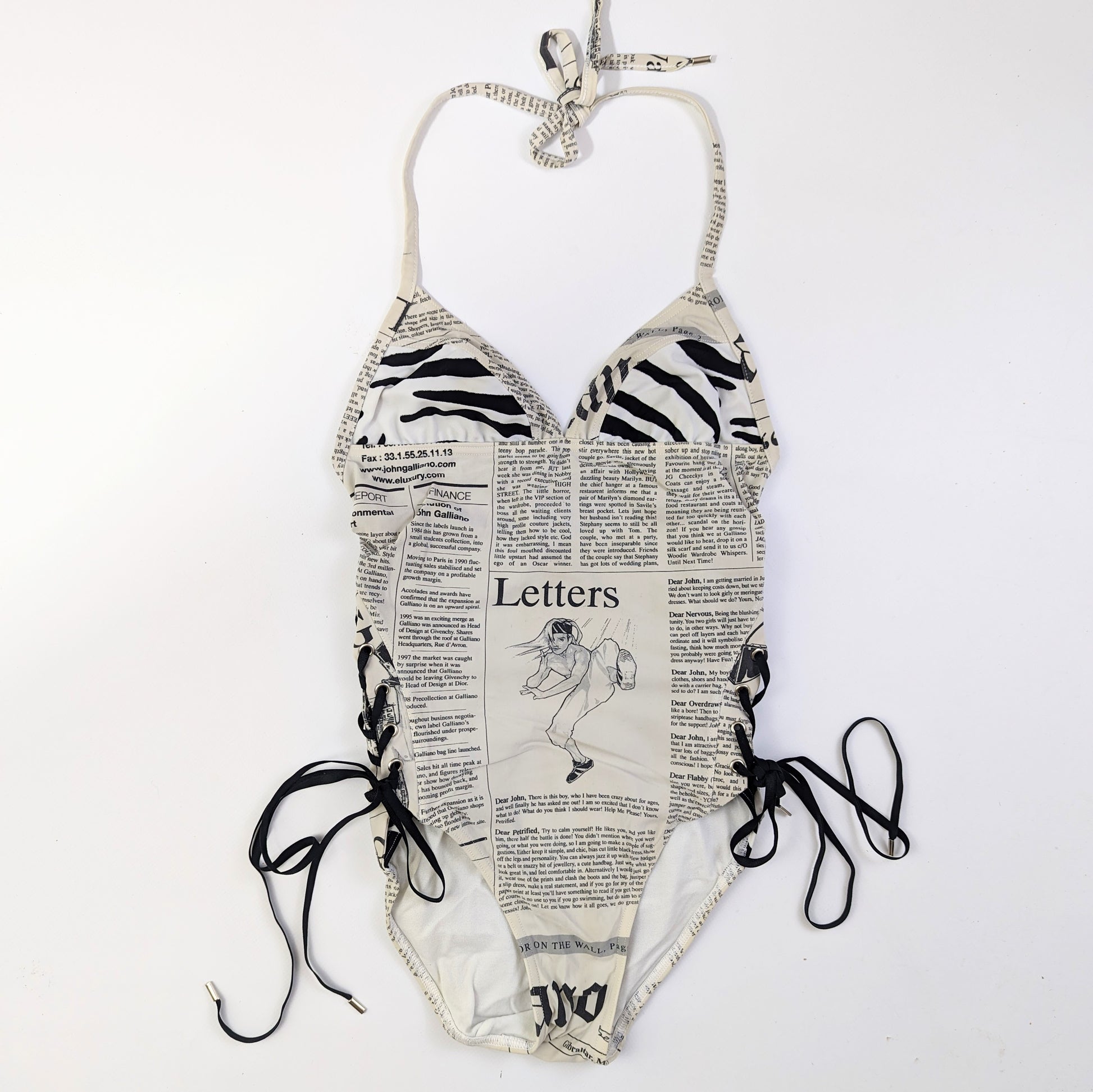 Item: One-piece swimsuit, lace bodice on each side. Newspaper pattern.