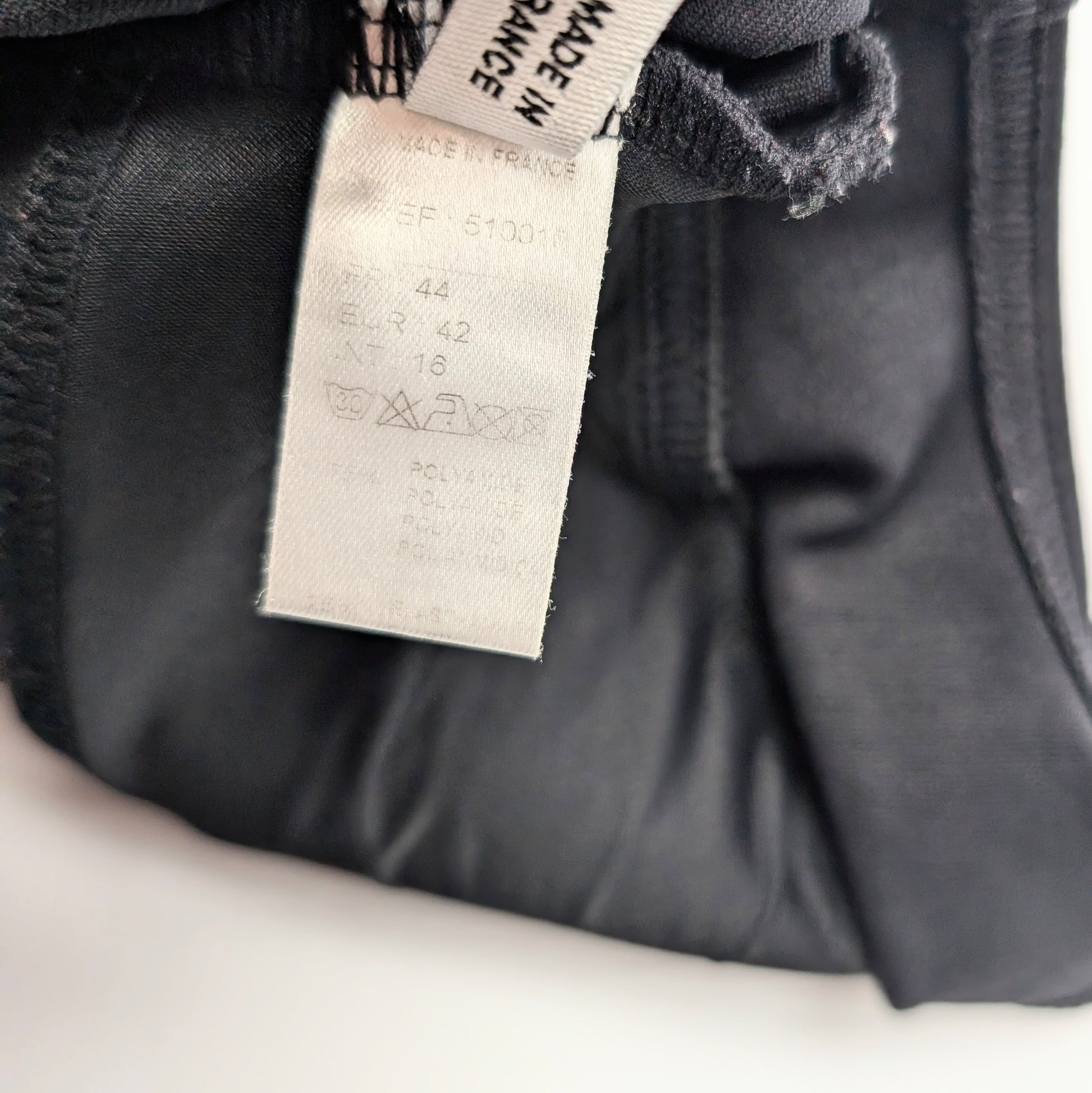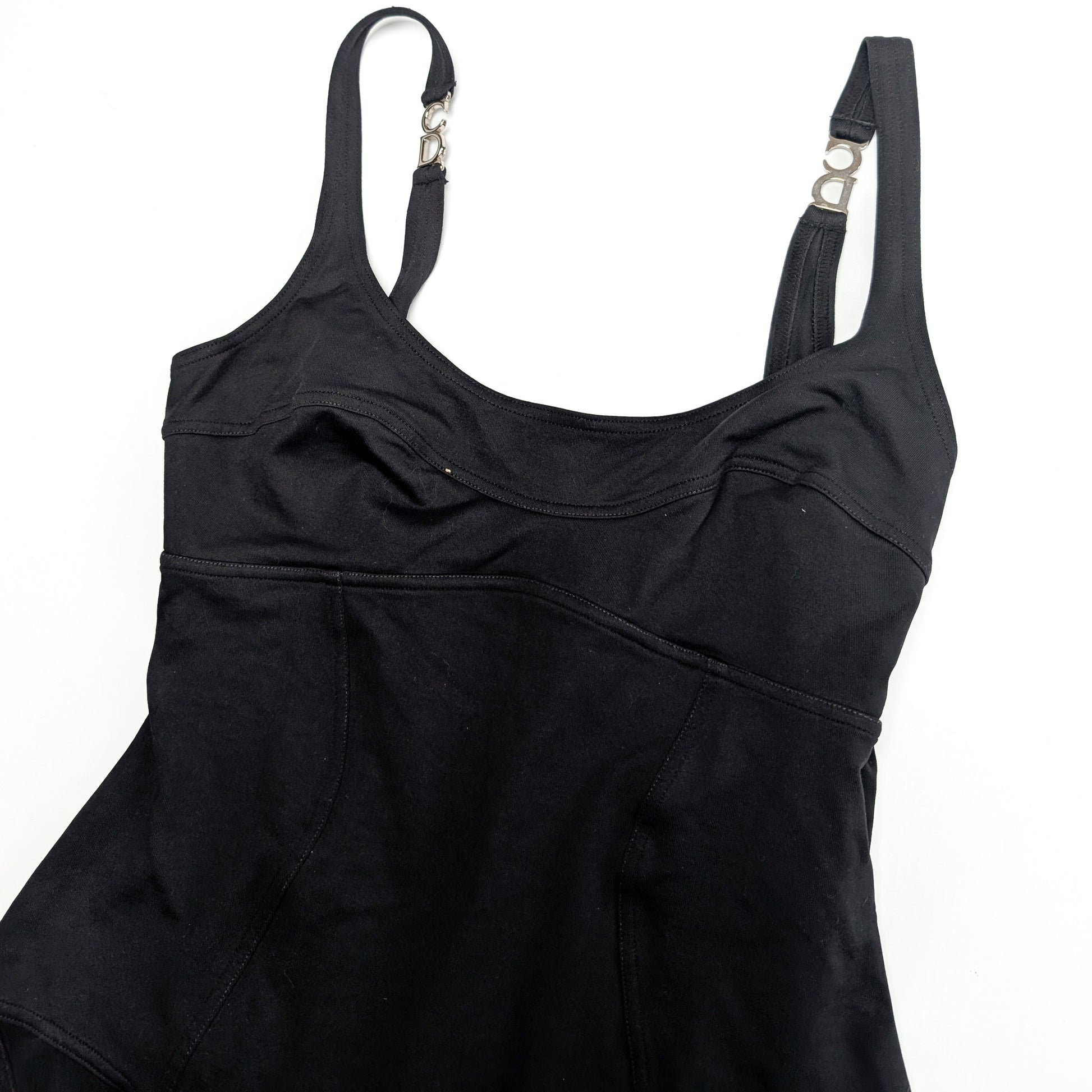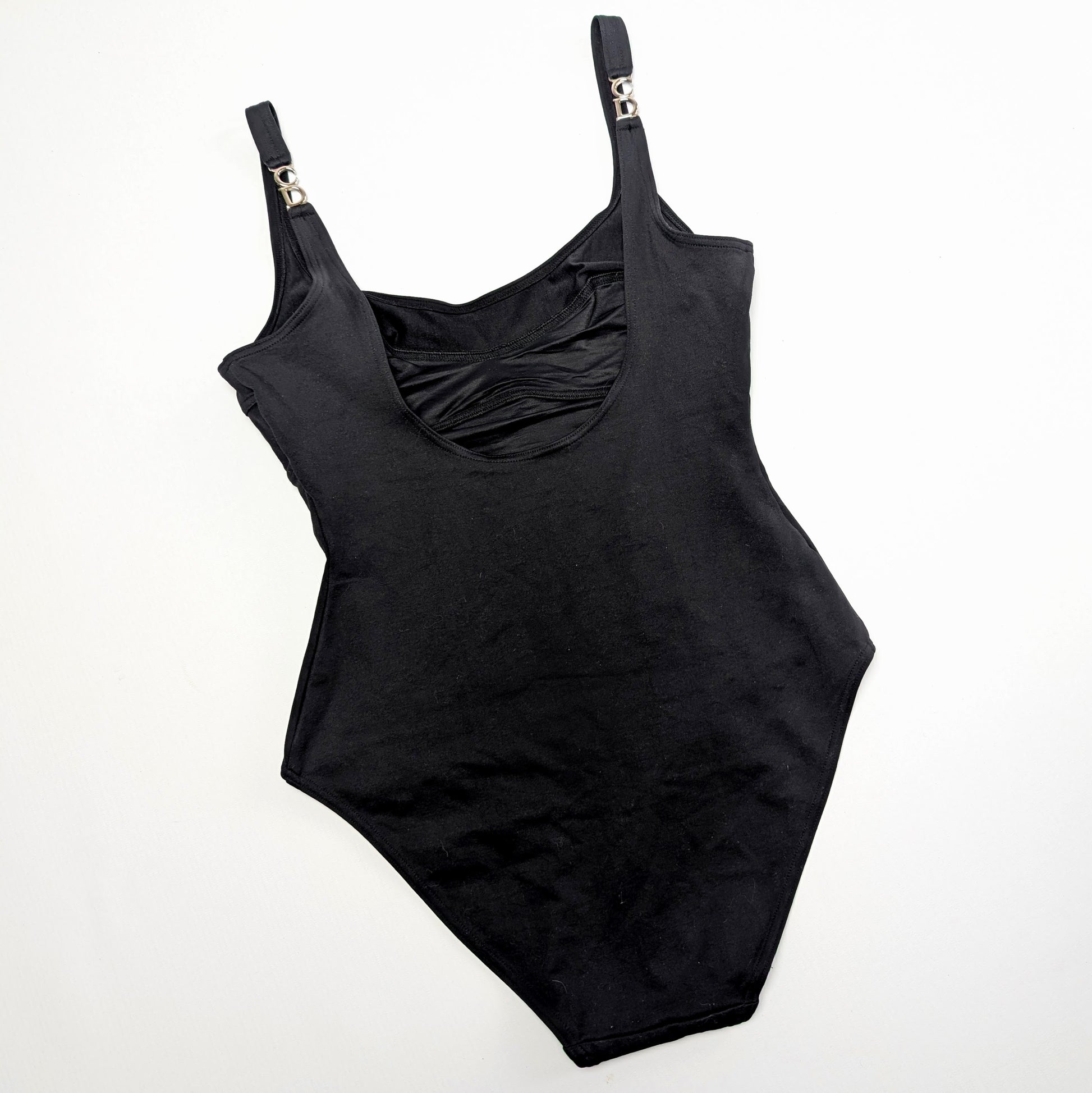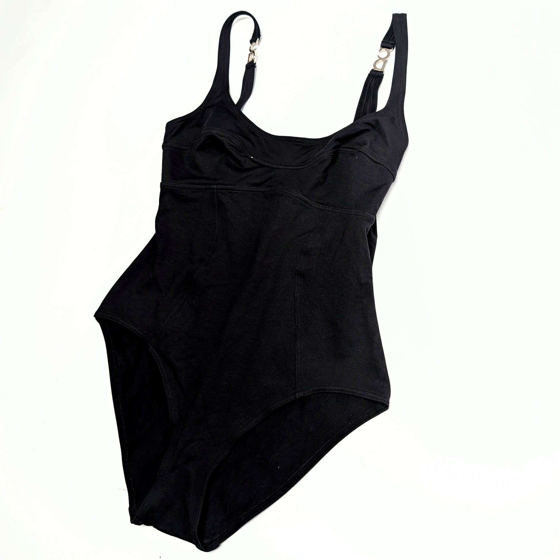 Item: One-piece swimsuit, black, fitted, corset effect. The straps are decorated with the silver initials "CD".