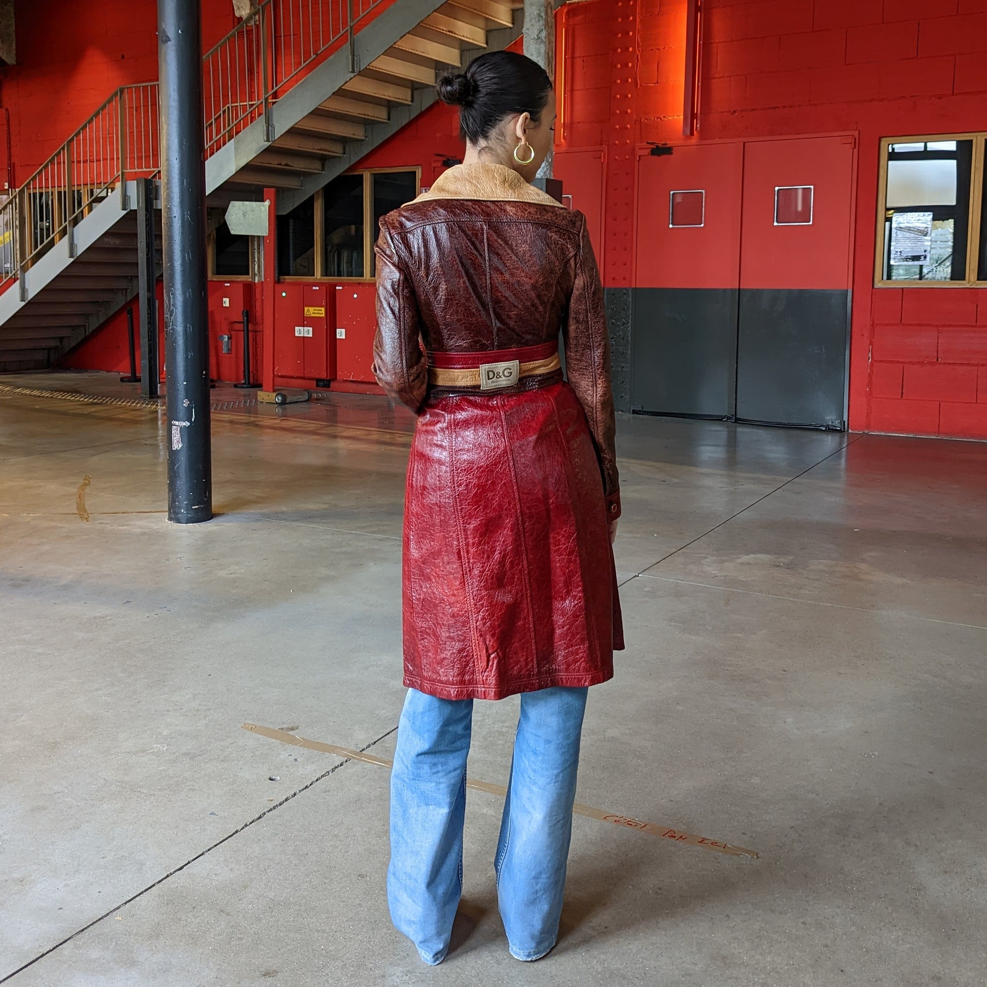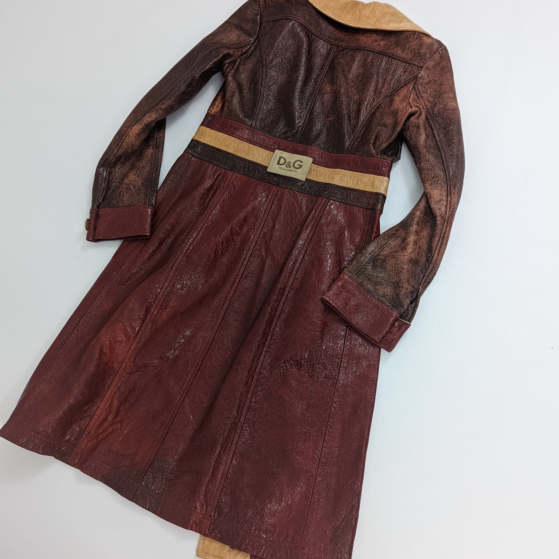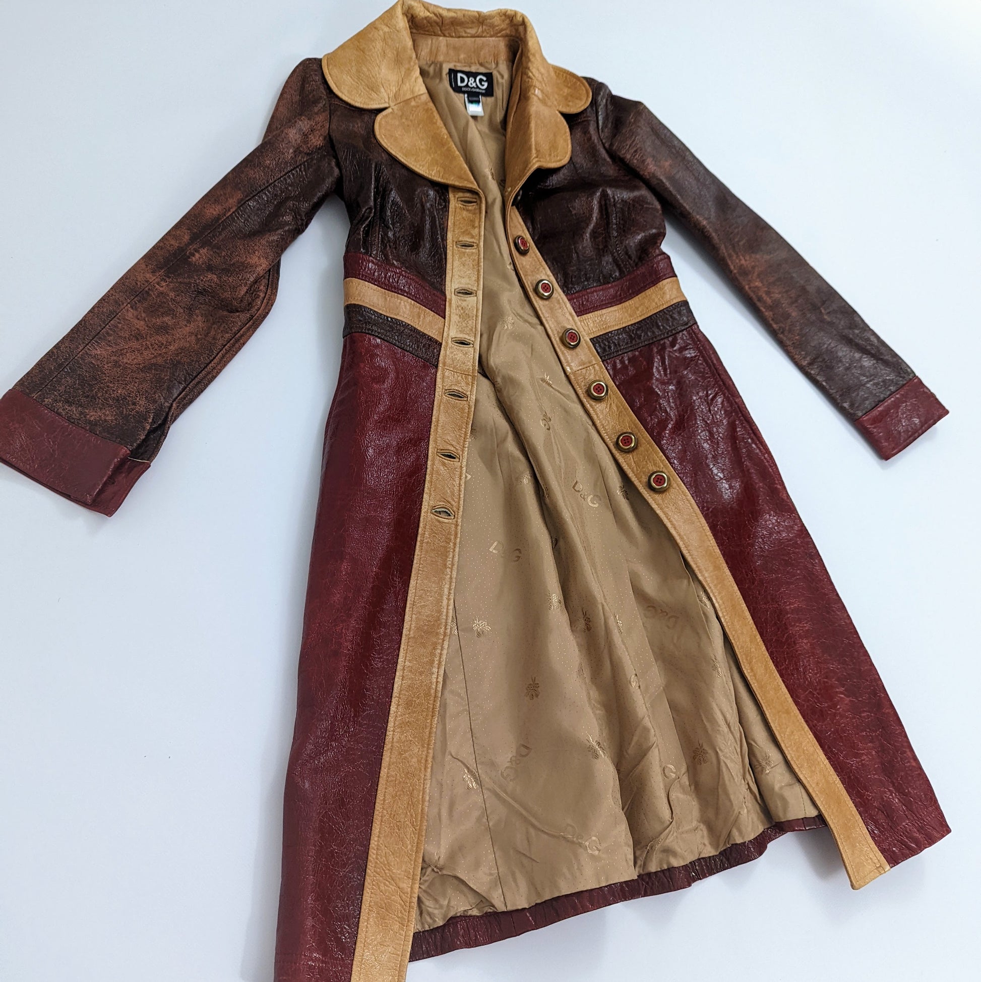 Item: Fitted trench style coat in burgundy and beige leather. Logo "Dolce & Gabbana" on the back.