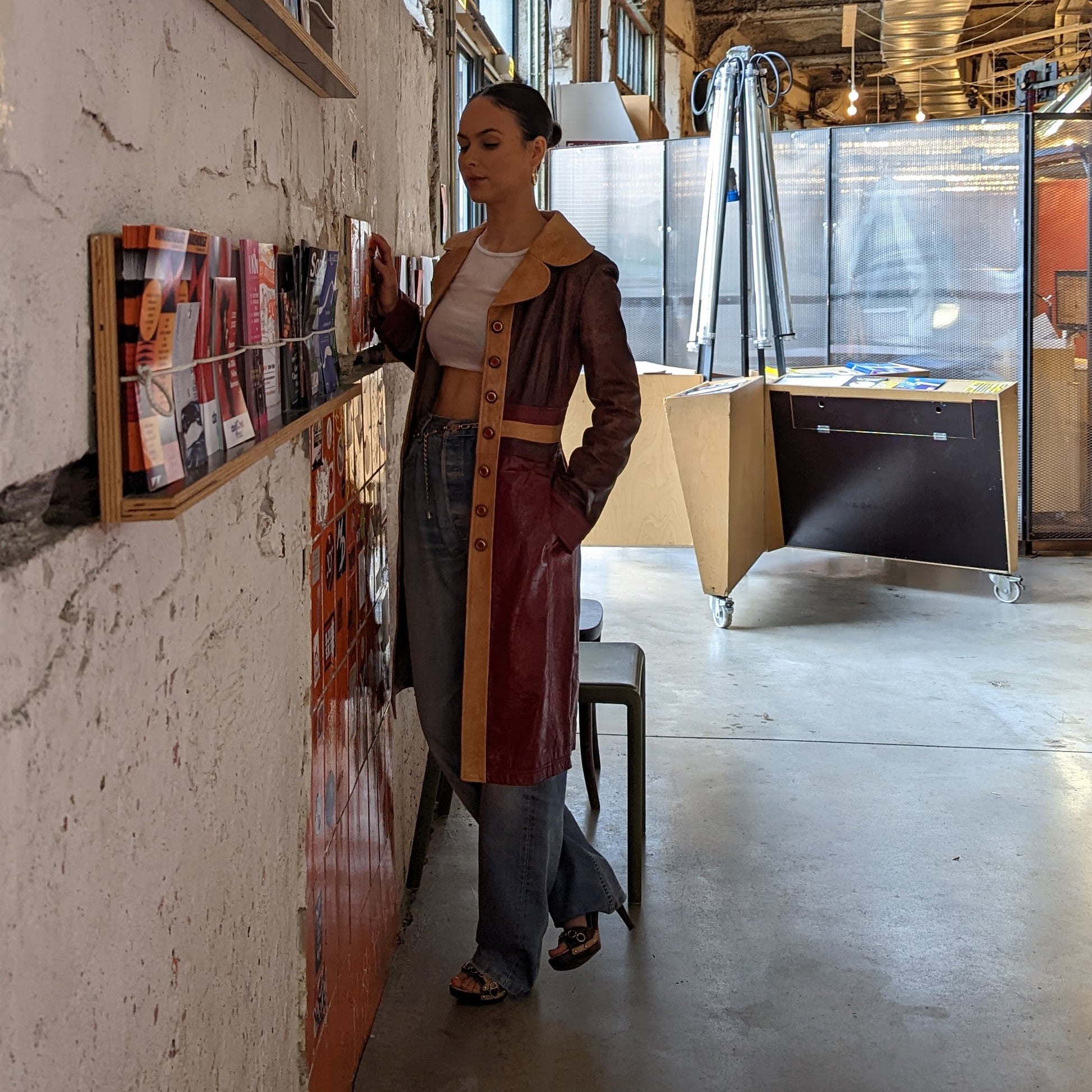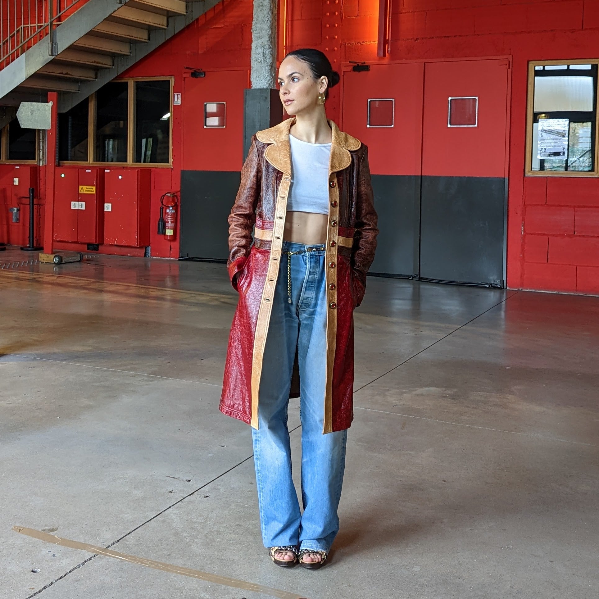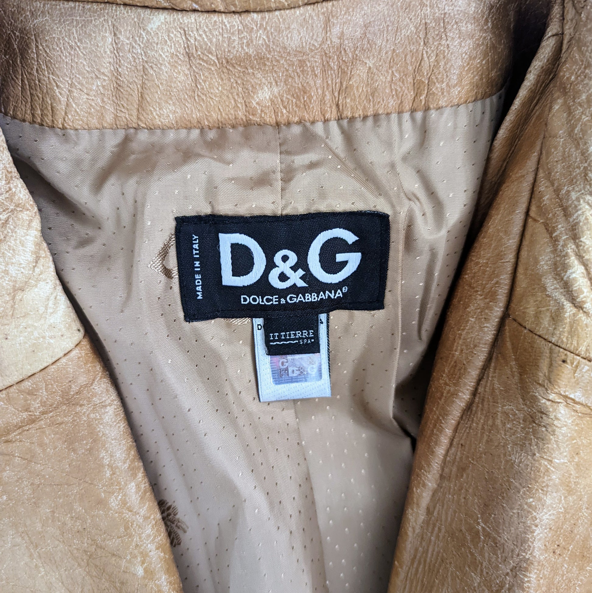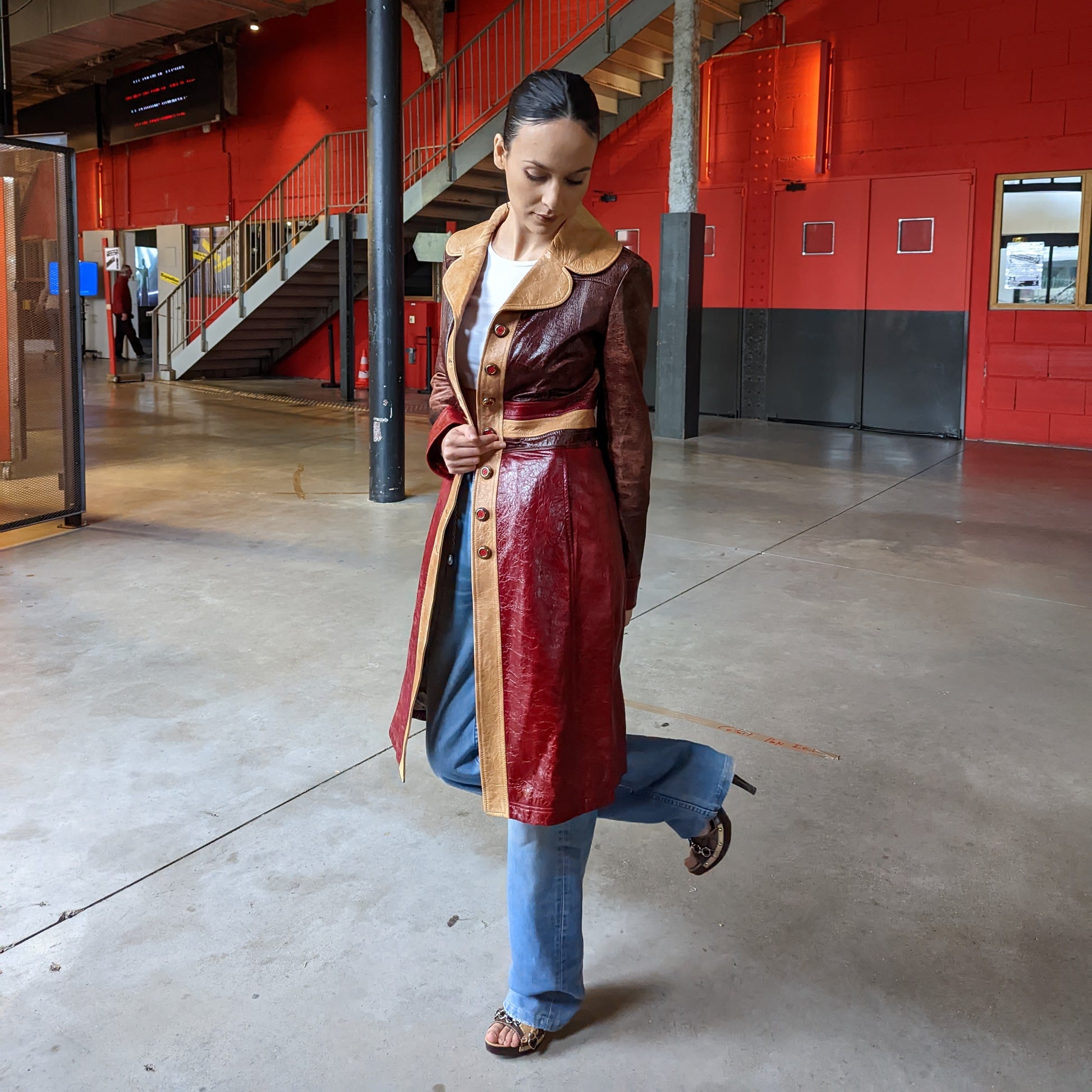 Item: Fitted trench style coat in burgundy and beige leather. Logo "Dolce & Gabbana" on the back.