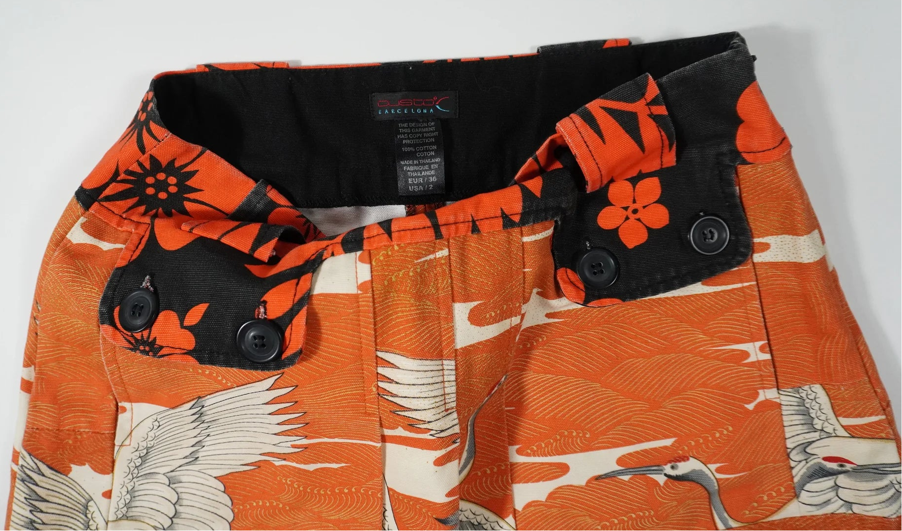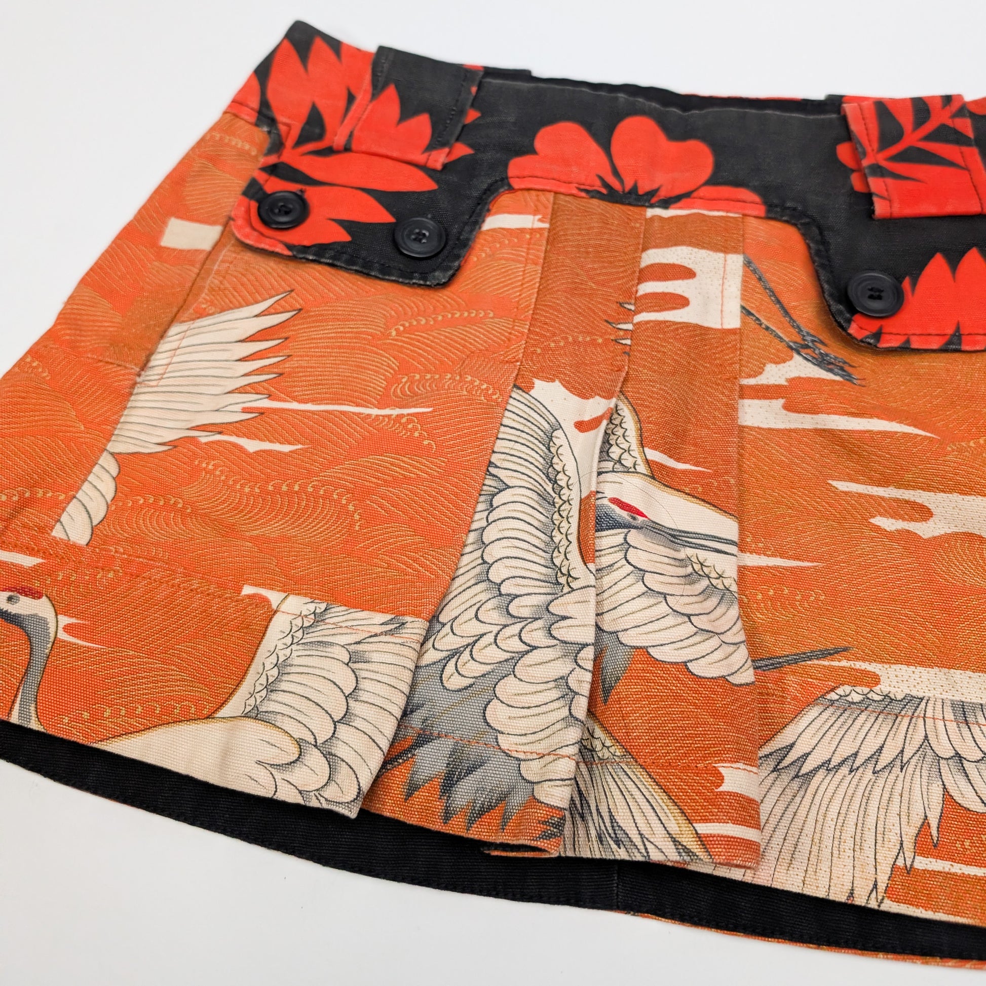 Item: Custo Barcelona low-rise mini-skirt with swan pattern. It has two front pockets, front pleats, and a side zipper.