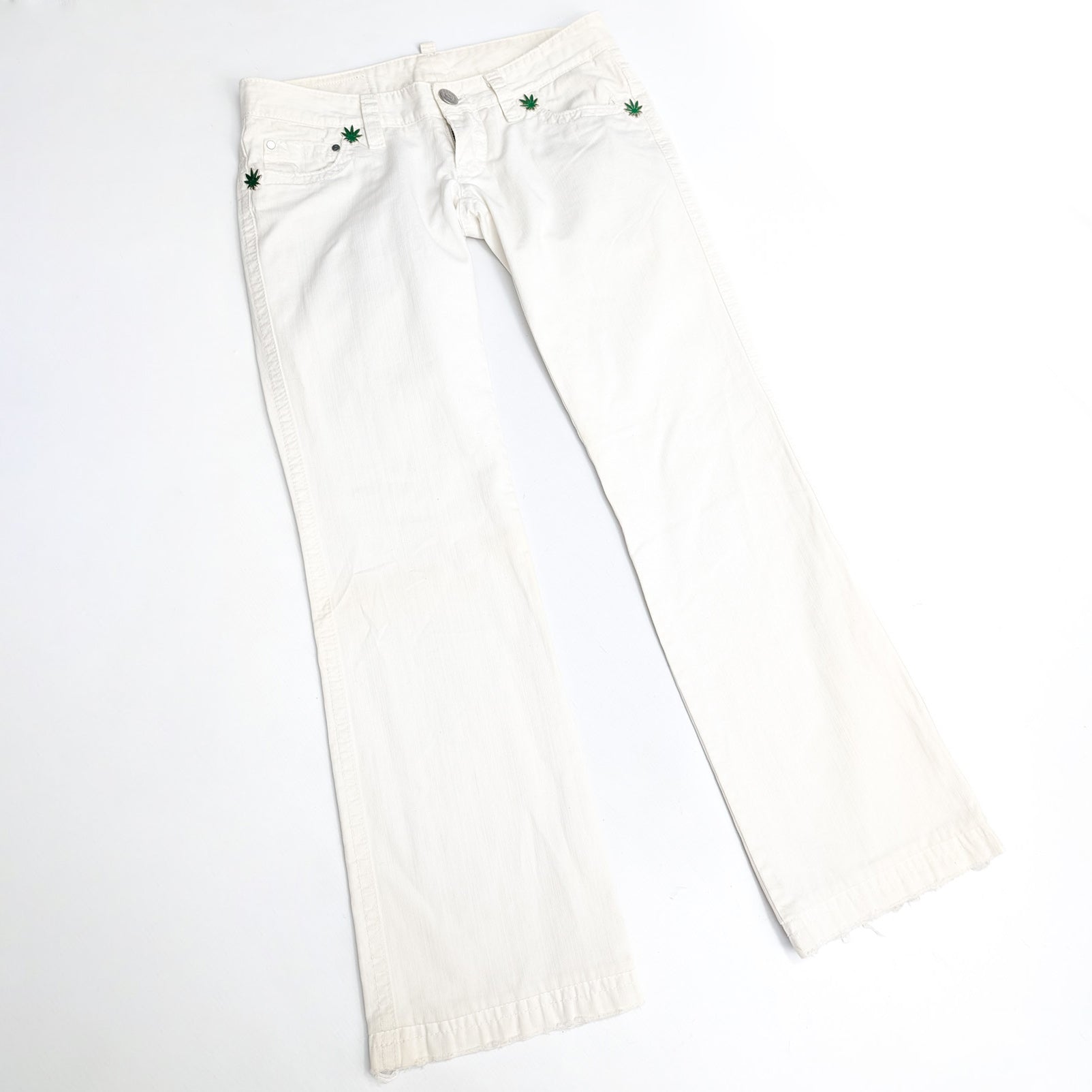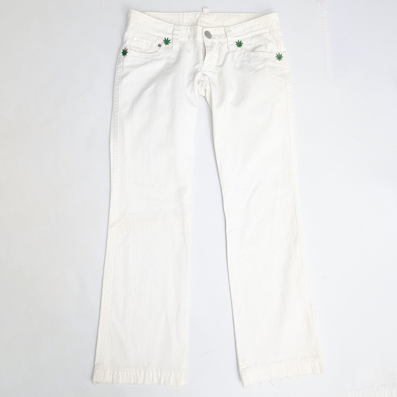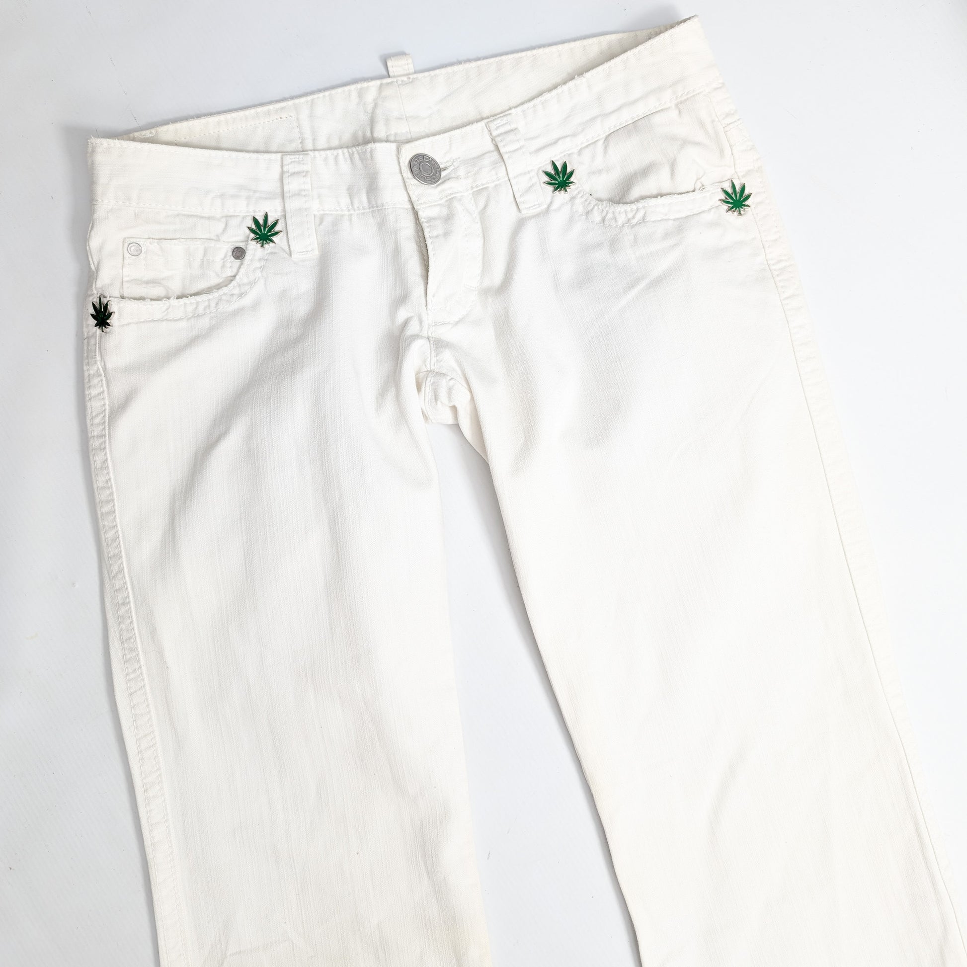Item: Low-waisted white jeans adorned with "Cannabis" and "Dsquared2" pins.