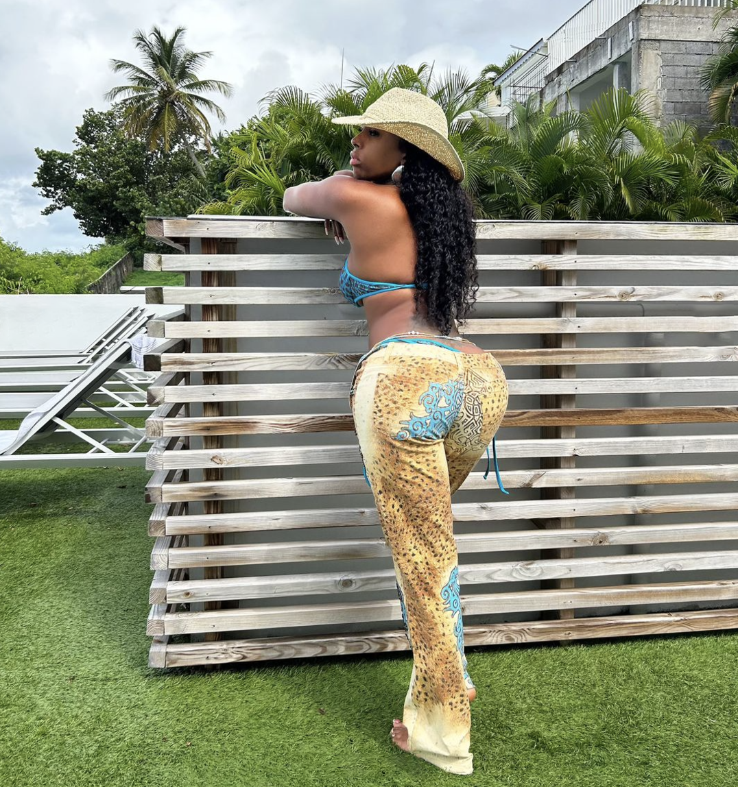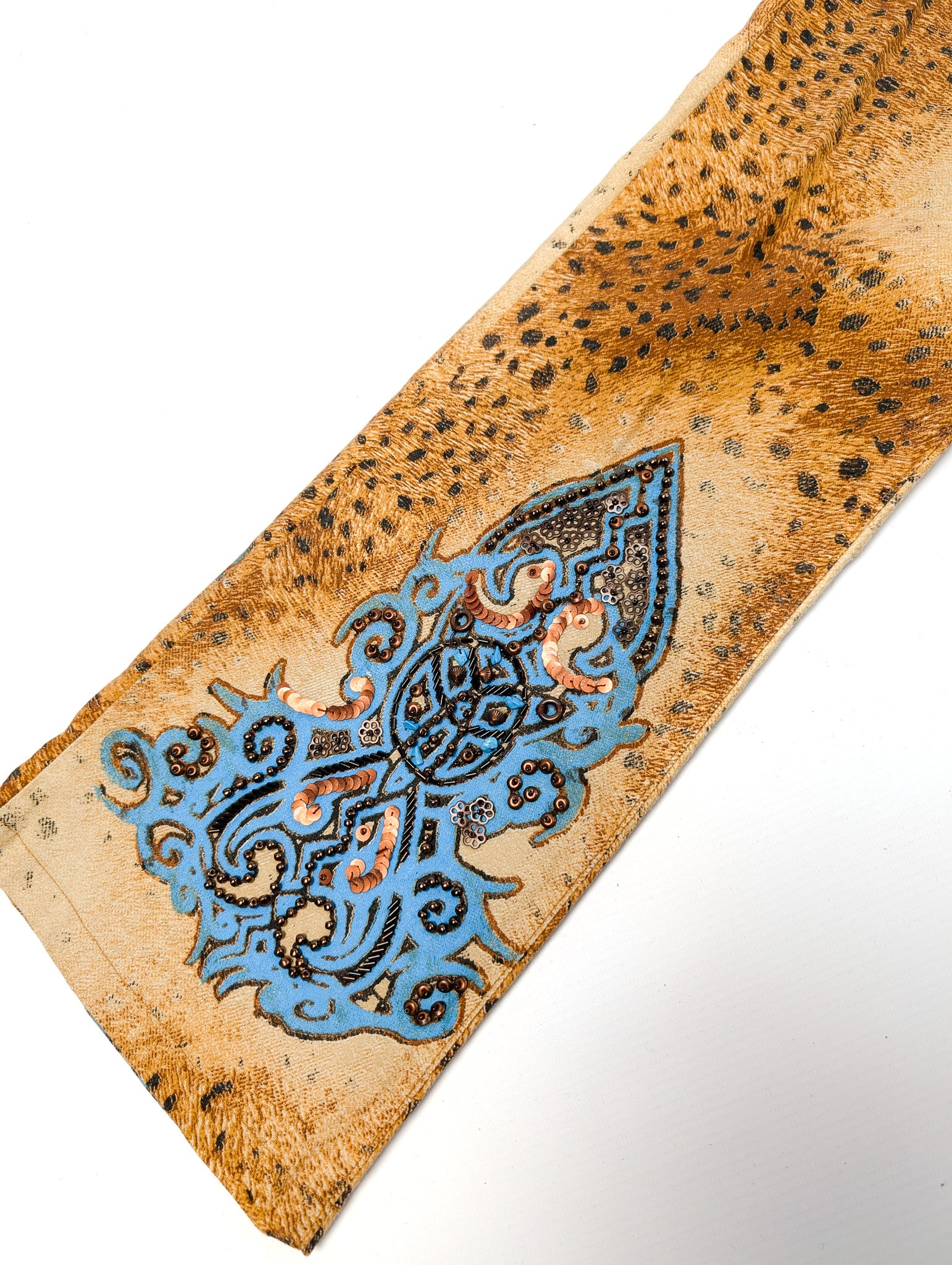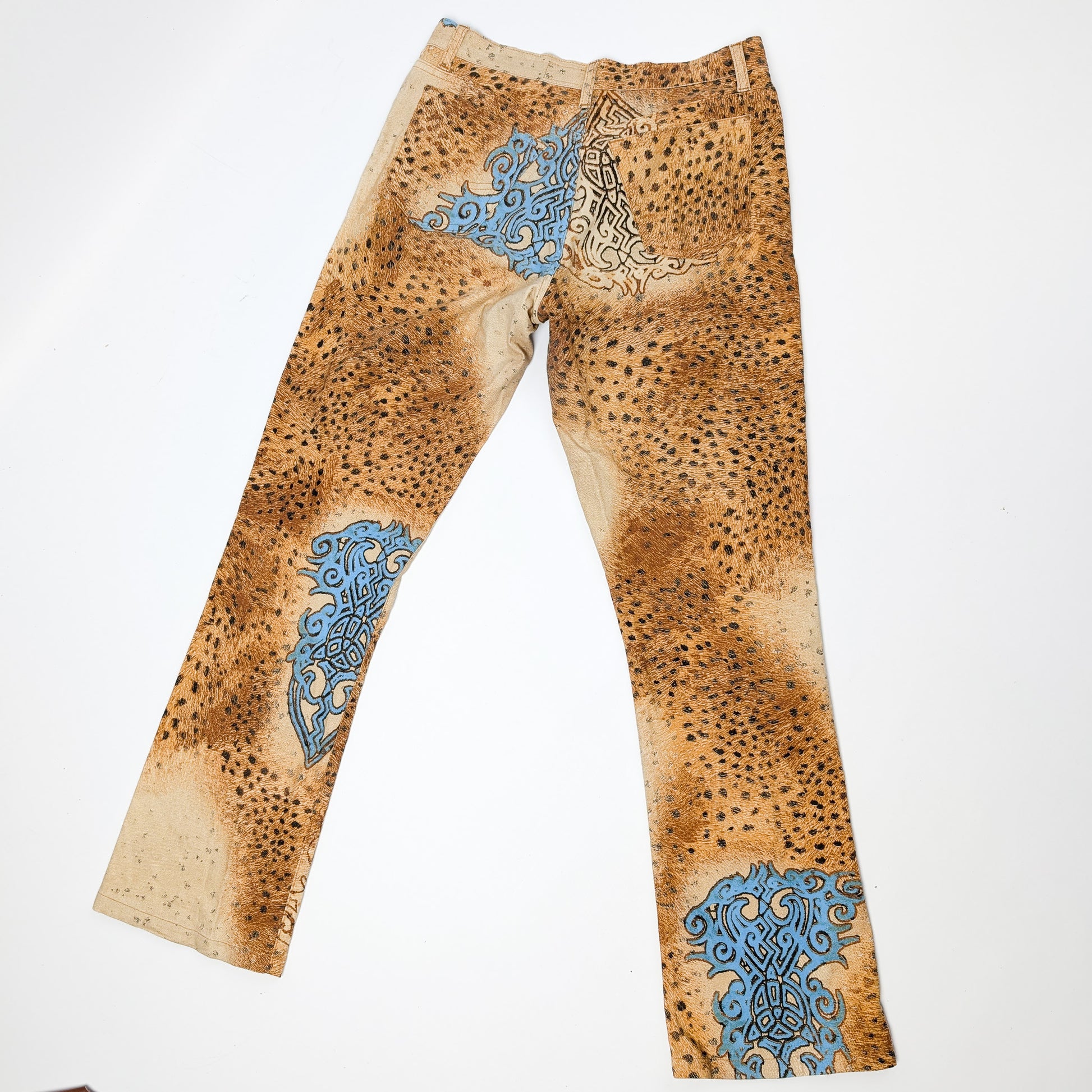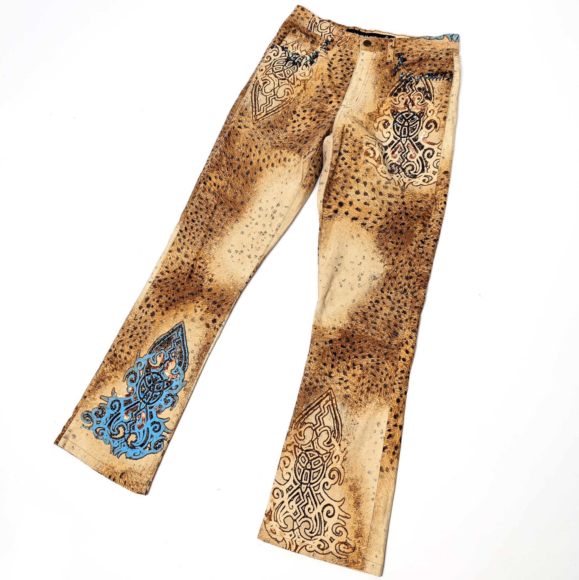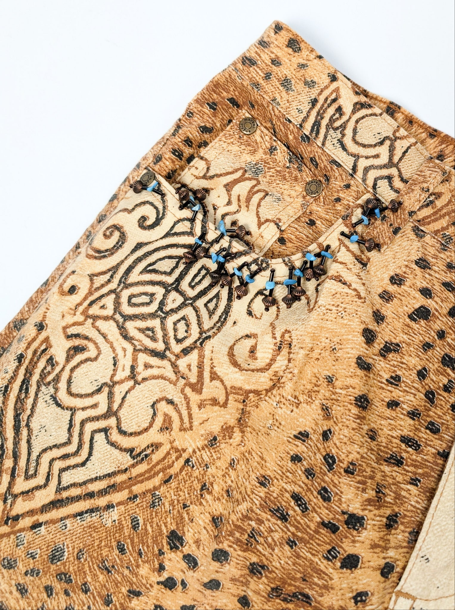 Item: Psychedelic patterned jeans pants decorated with blue beads. Slightly stretchy. Italian vintage brand.