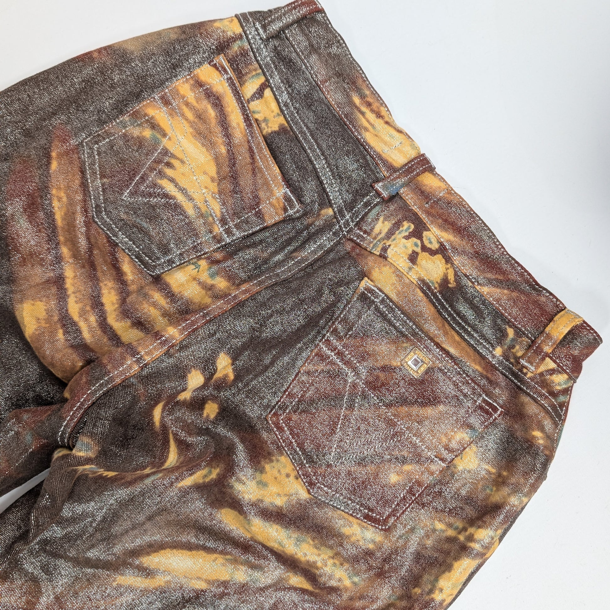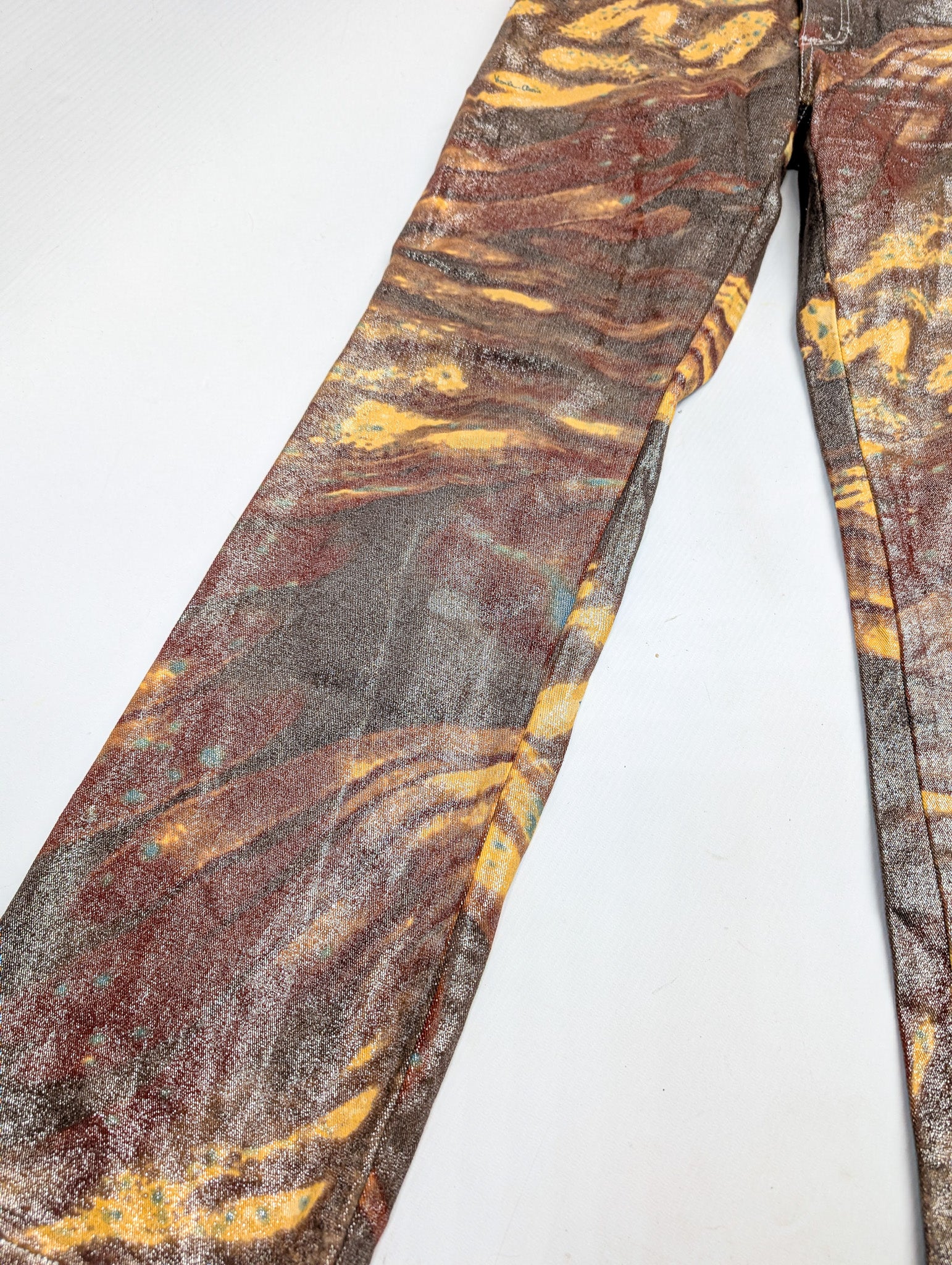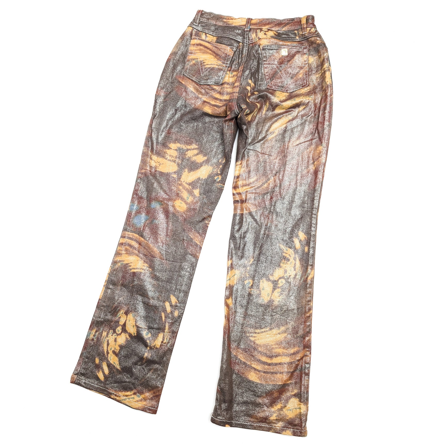 Item: Denim pants with a multi-colored abstract pattern. Sequins.