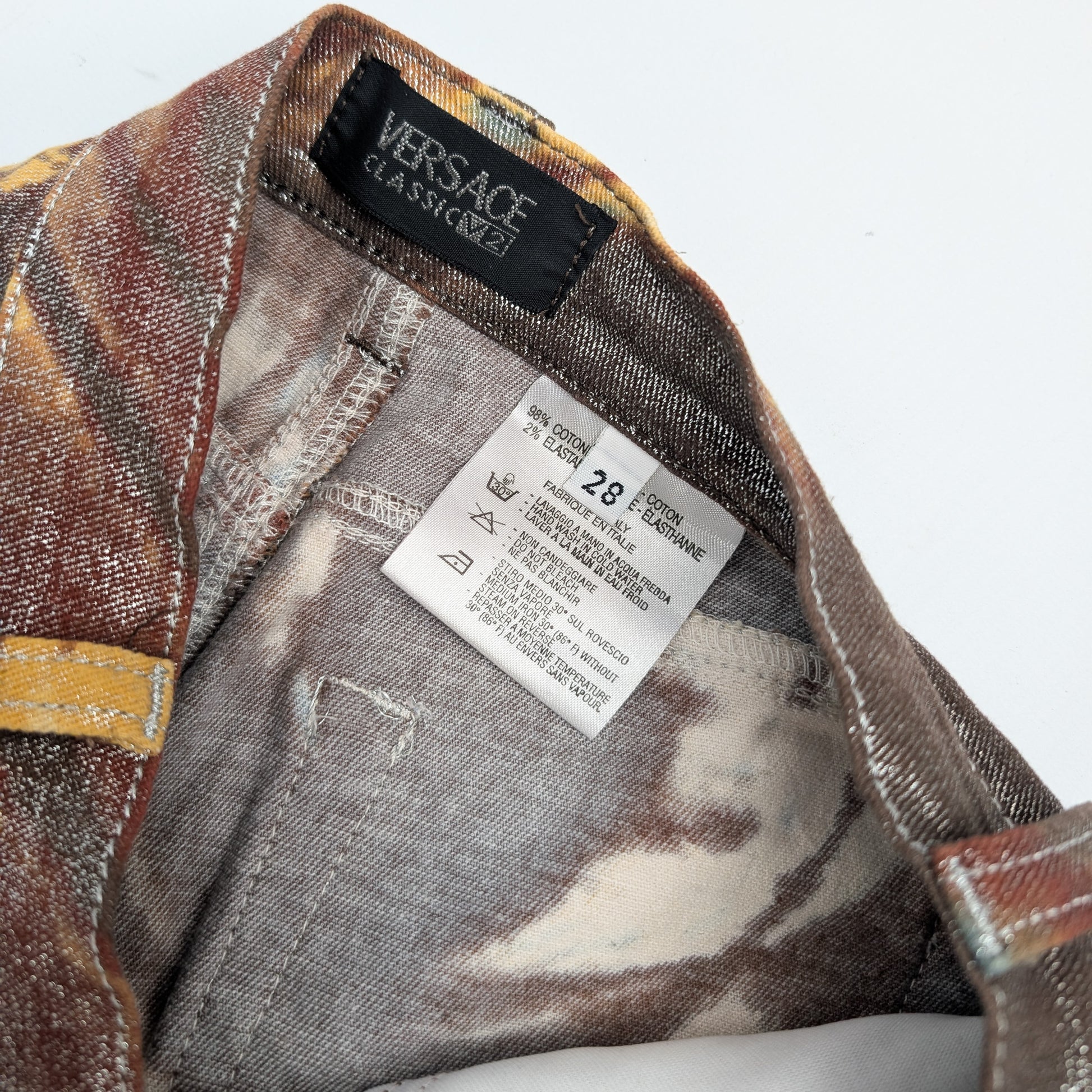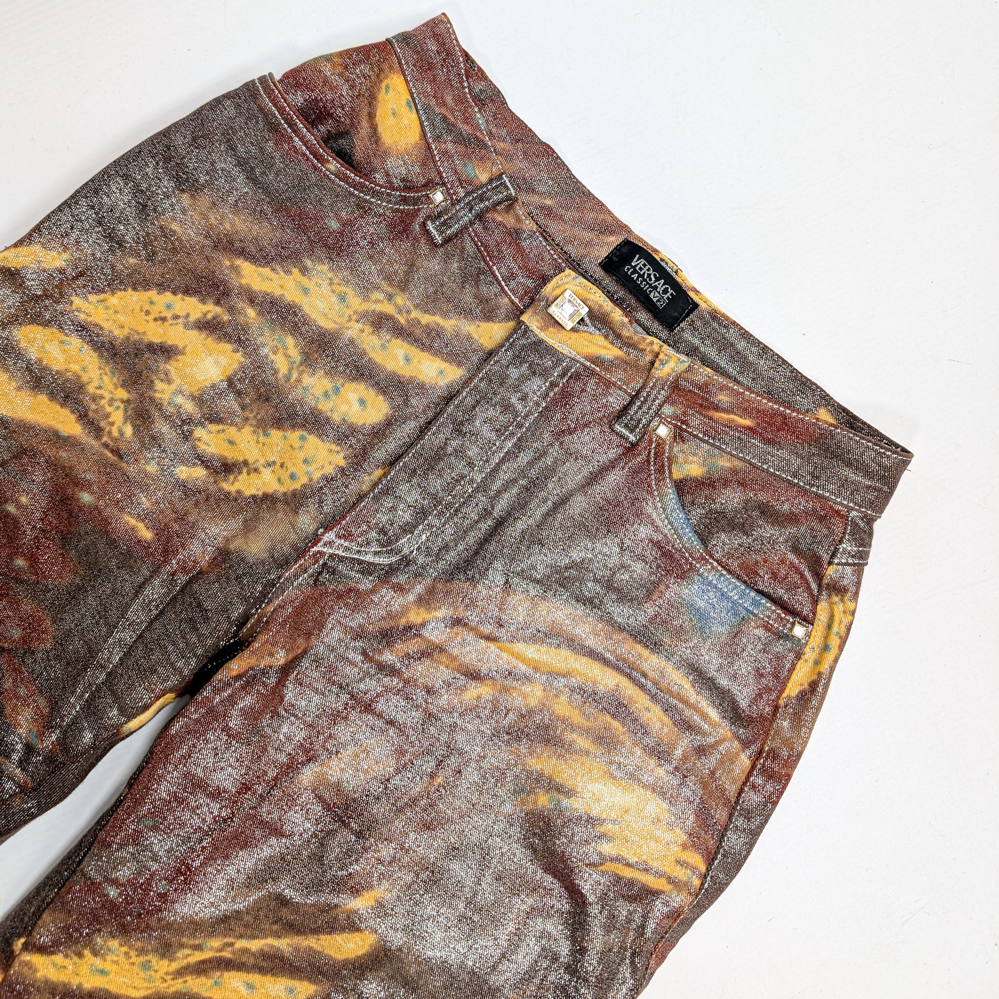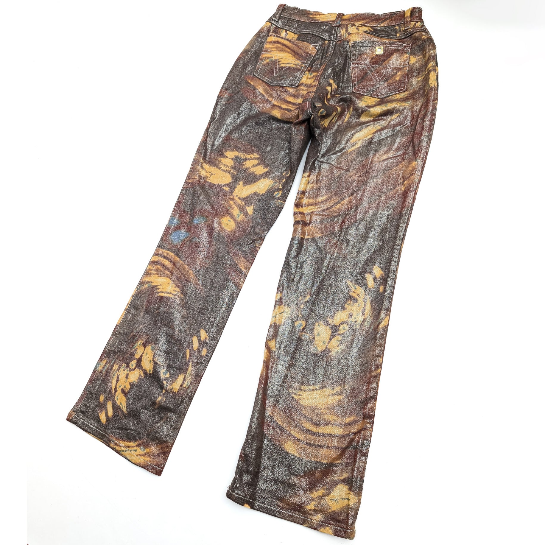 Item: Denim pants with a multi-colored abstract pattern. Sequins.