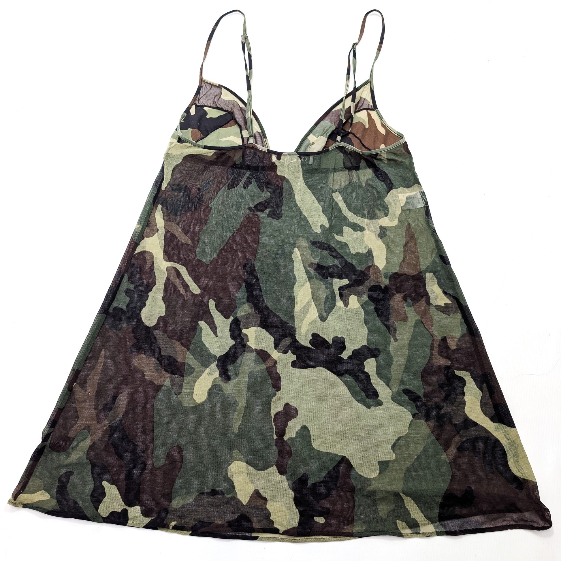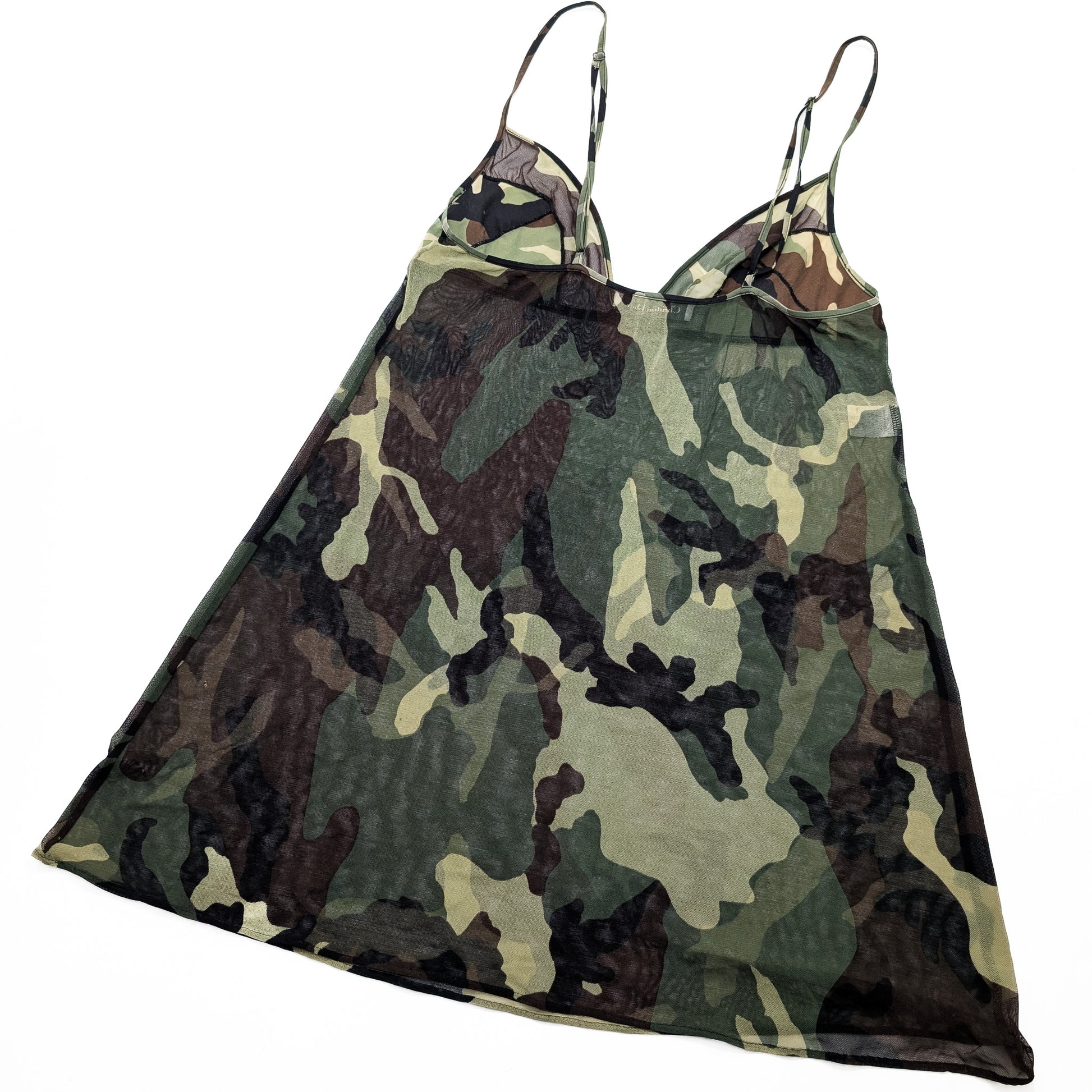 Item: Mesh slip dress, slightly sheer, camouflage print, military