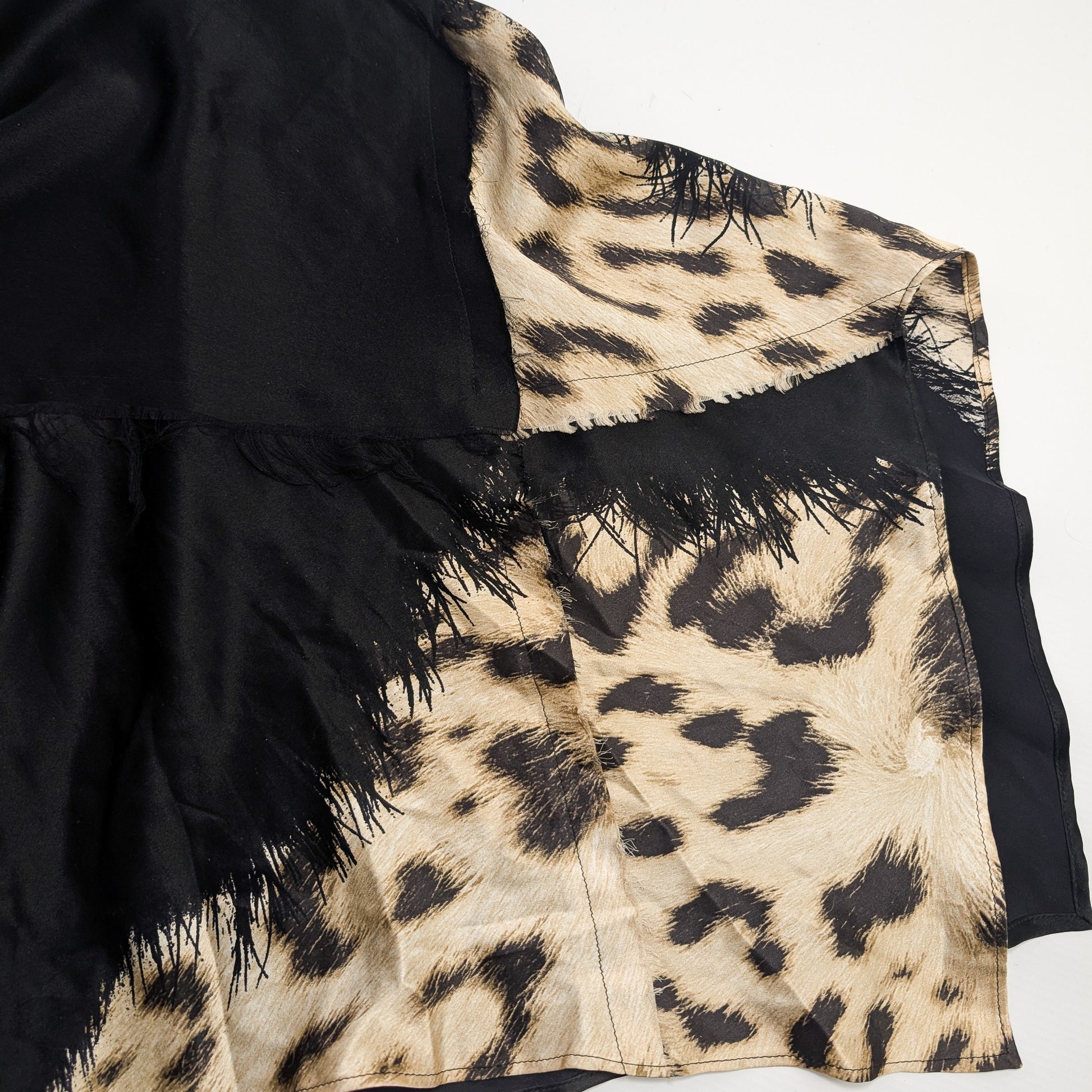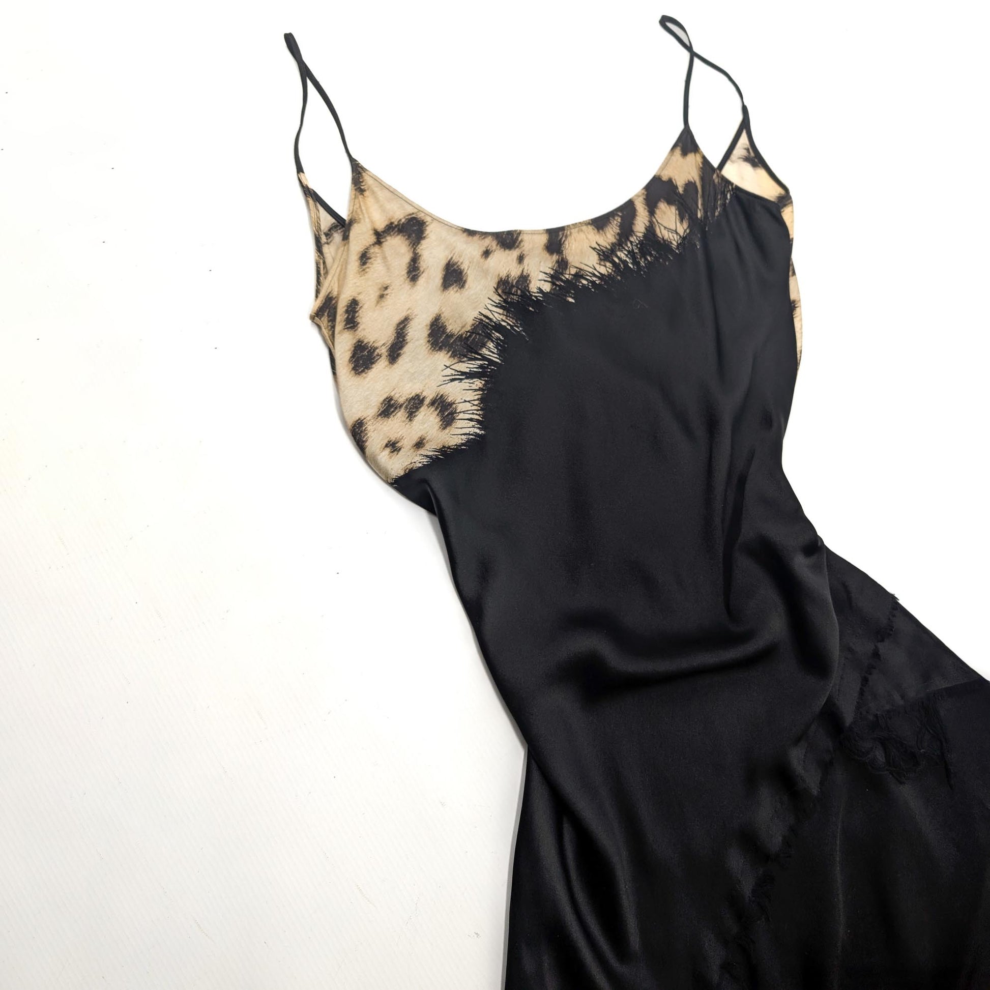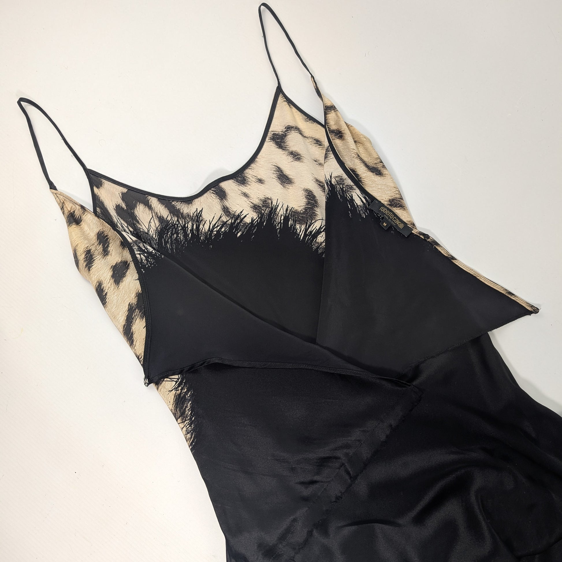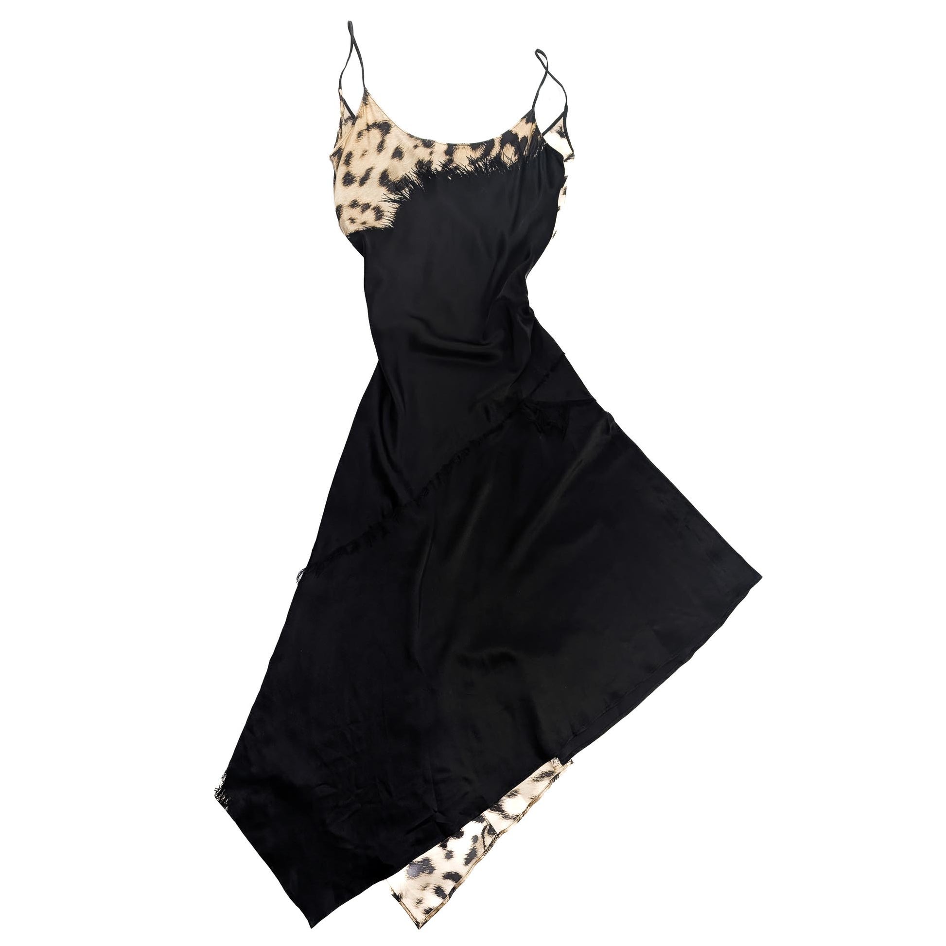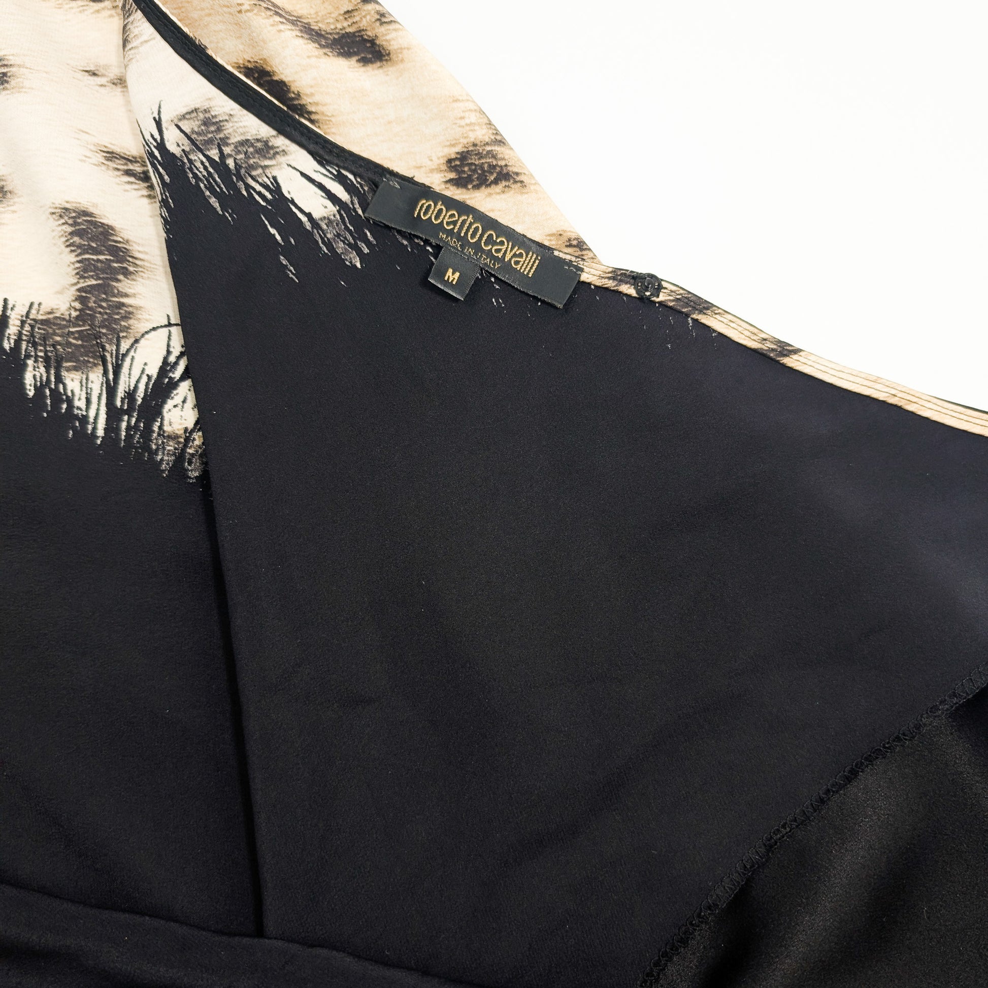Item: Roberto Cavalli long black silk dress with animal print. Asymmetrical length. Open back.