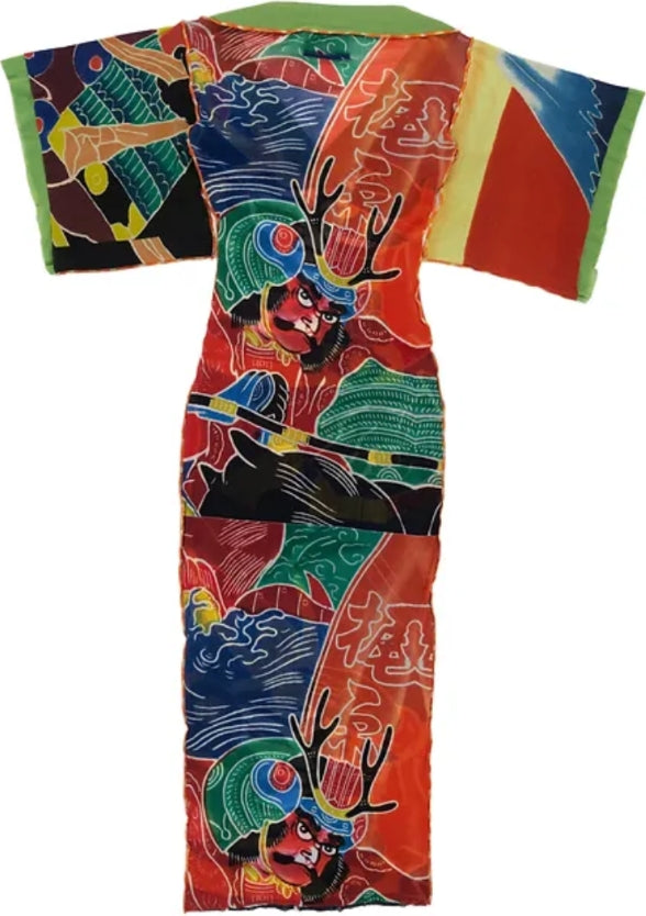 Item: Long vintage bodycon kimono style dress in multicolor knit. Geisha print Multicolored Japanese tourists from the 1999 parade at the Louvre. V-neckline, kimono sleeves with layered green mesh lining. Reverse seam finishes. Raw cut finishes on the bottom. Slightly transparent and stretchy.