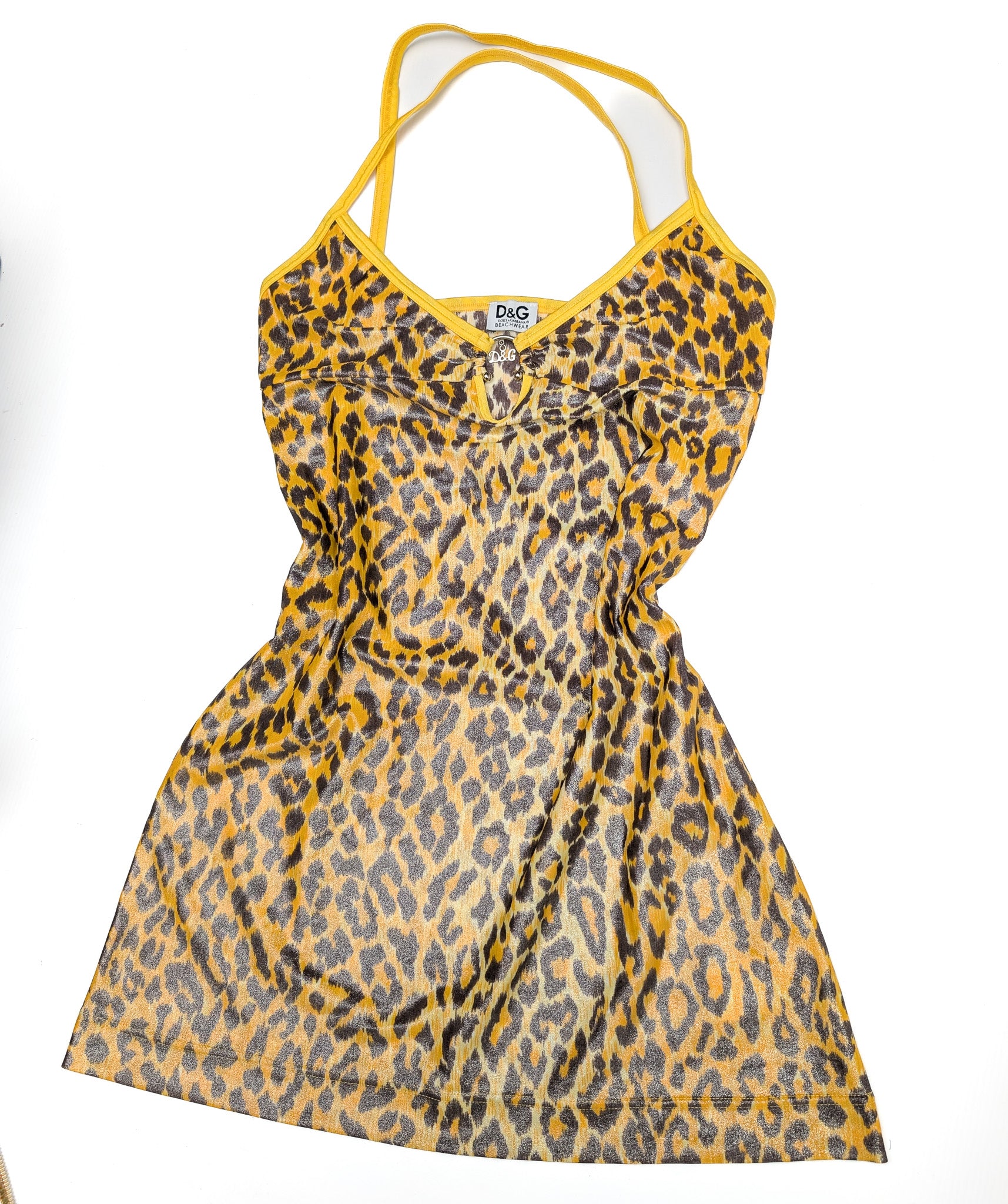 Item: Dolce & Gabbana dress with yellow animal print, adorned with a "D&G" jewel.