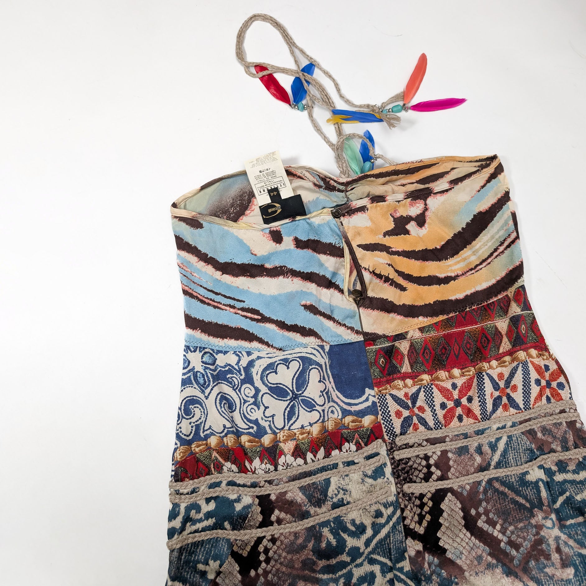 Item: Cavalli strapless silk dress with abstract pattern. Ties adorned with feathers.