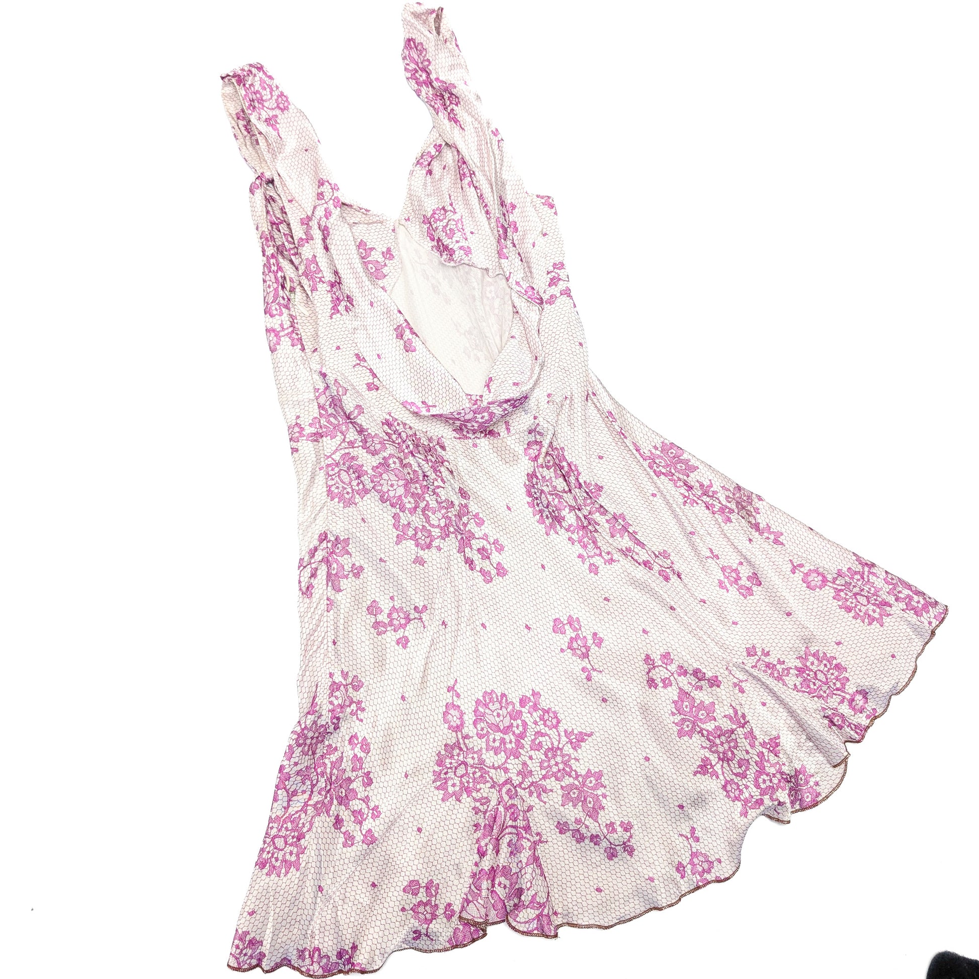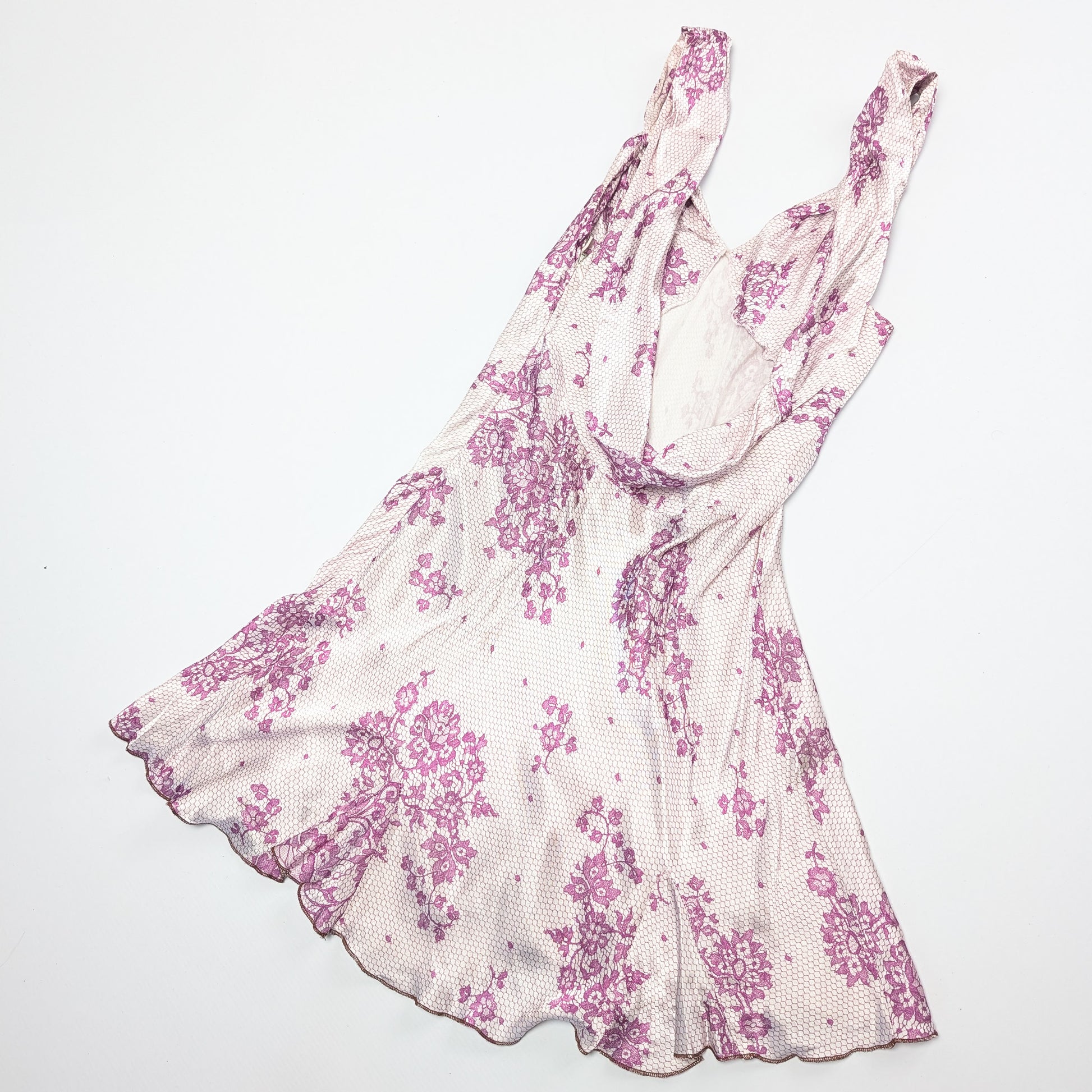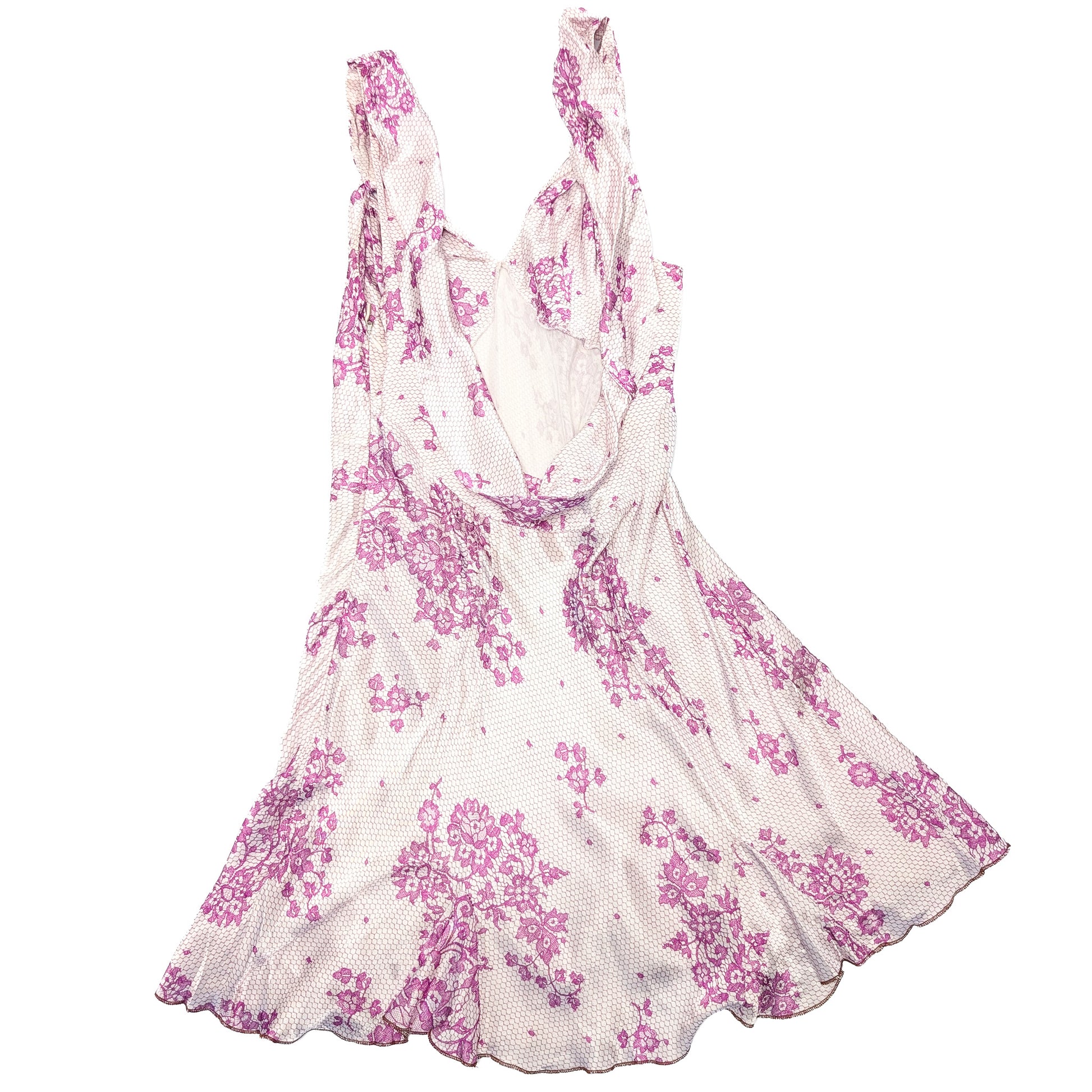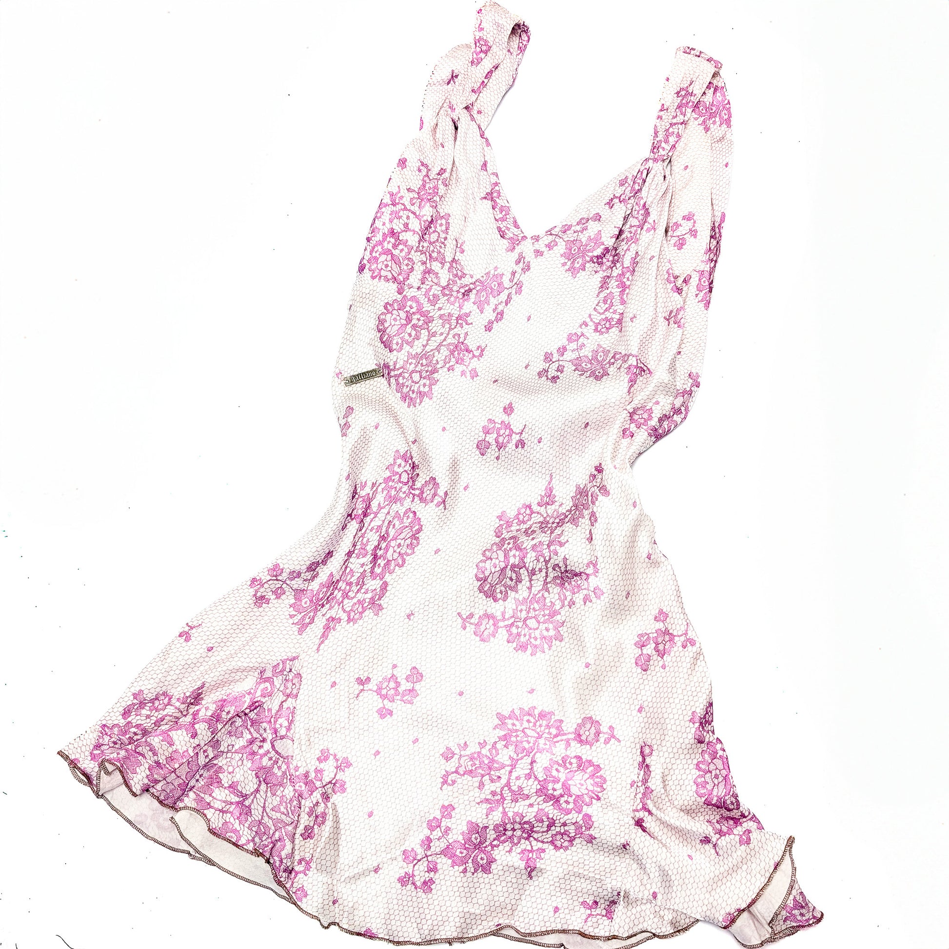 Item: John Galliano silk mini dress with trompe l'oeil and floral lace pattern.