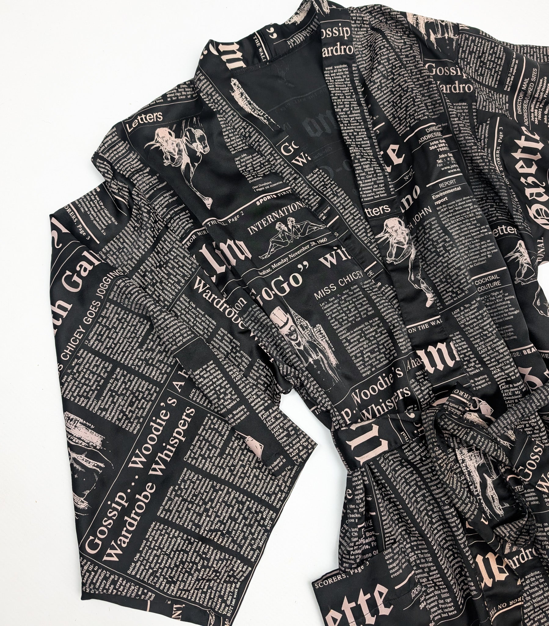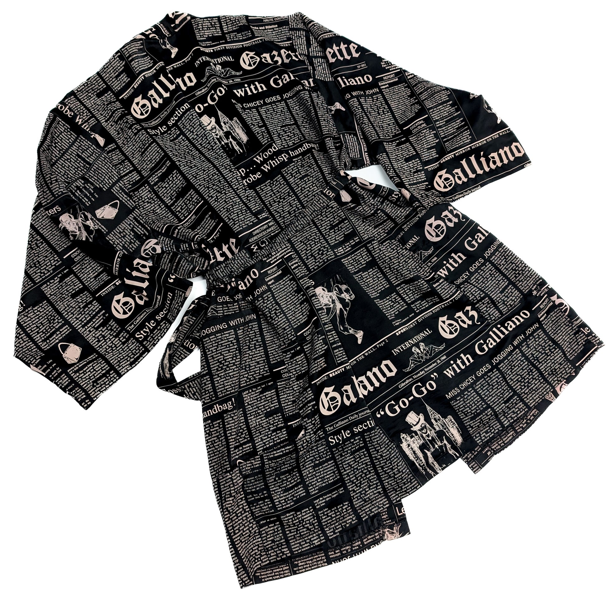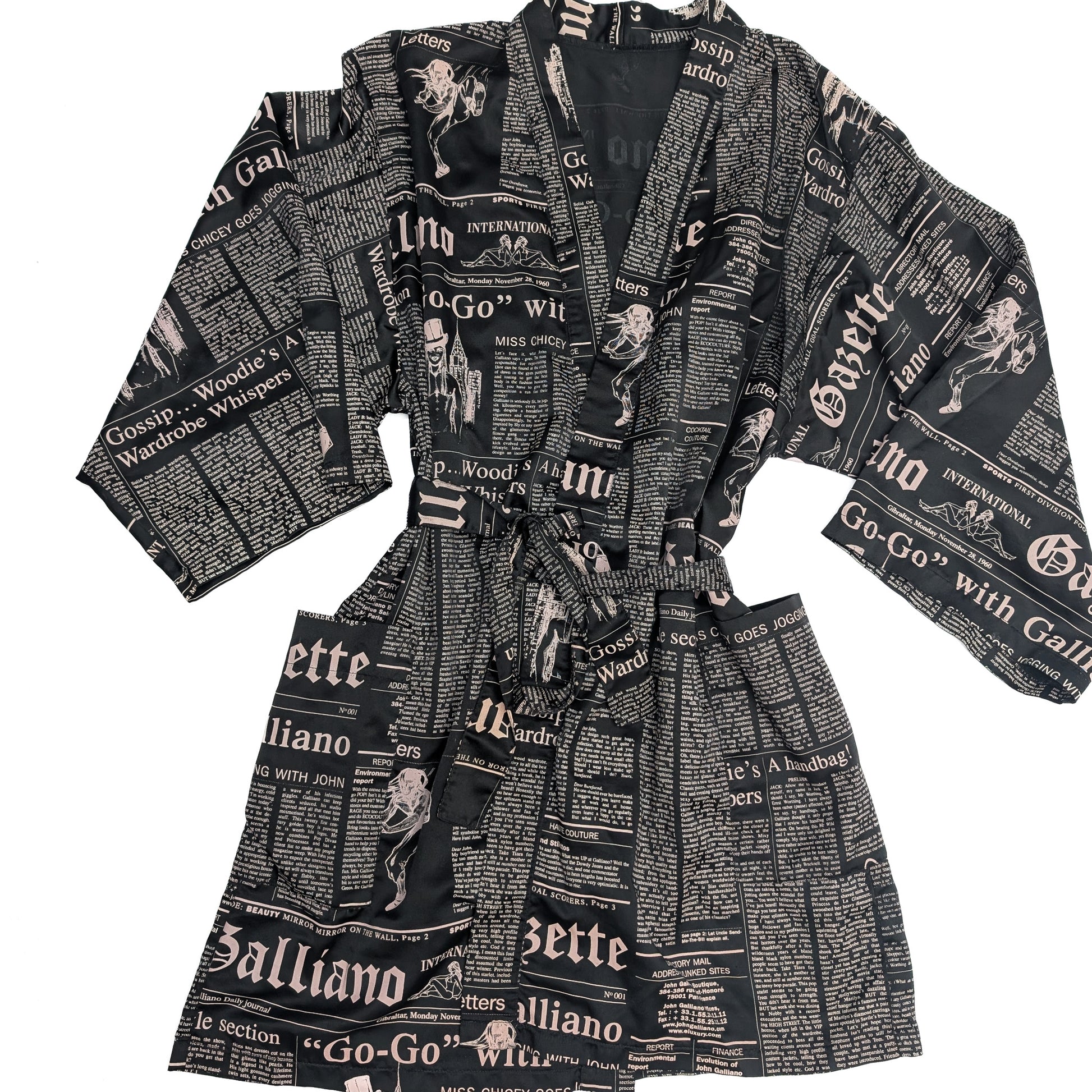 Item: Belted Kimono Jacket Dress. "Newspaper" Print