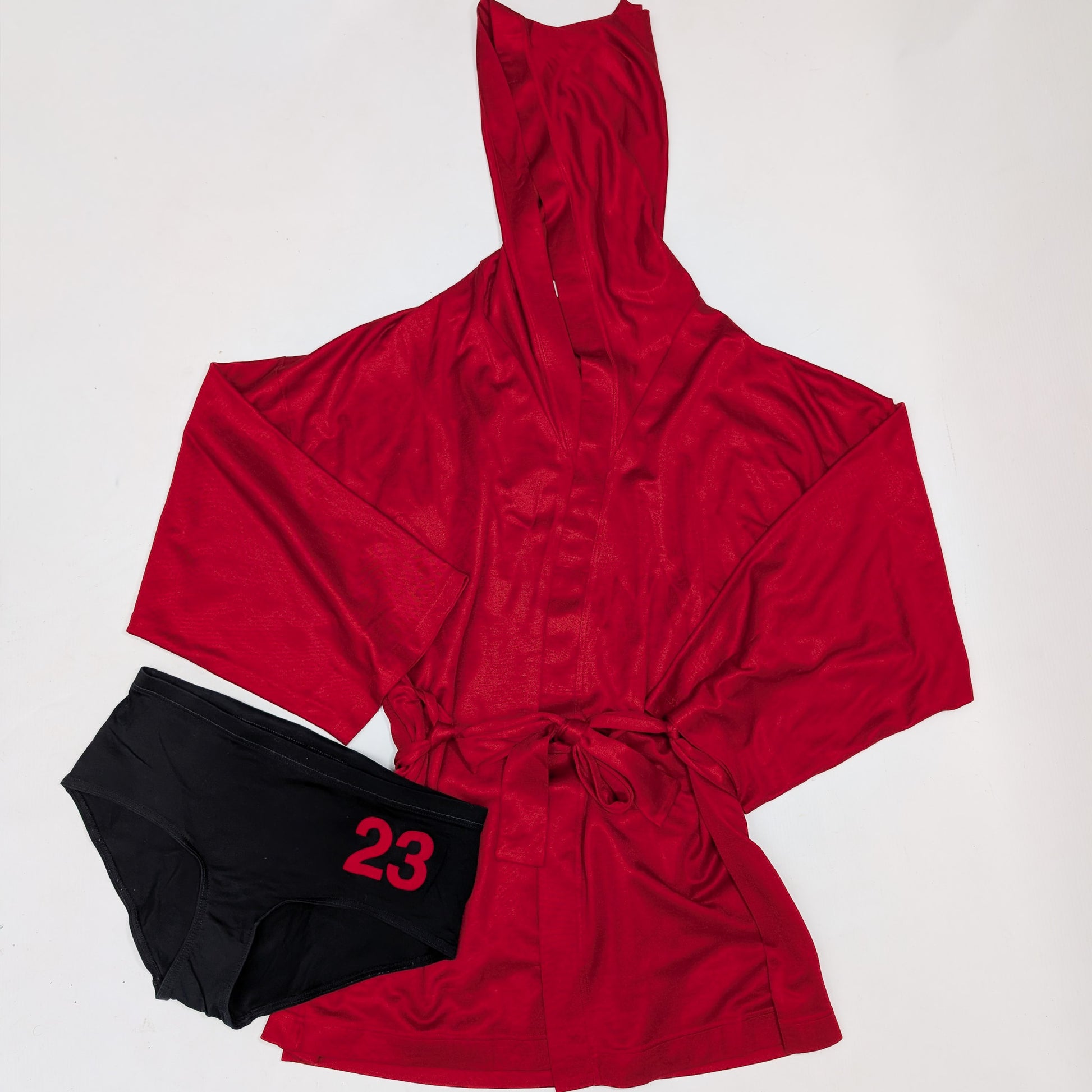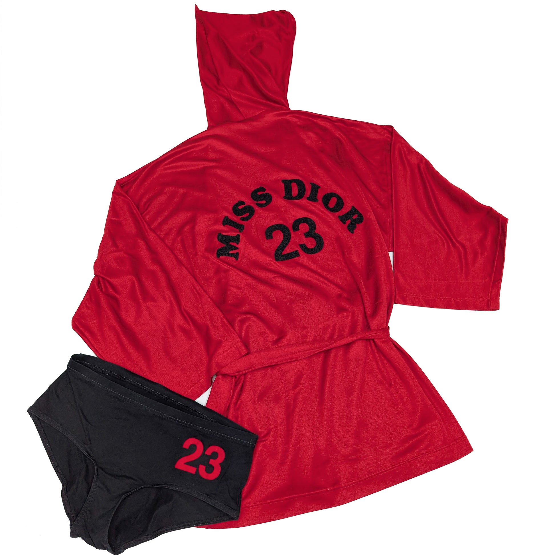 Item: Kimono-style belted robe dress with hood. "Miss Dior 23" inscription in red and black. Matching panties.
