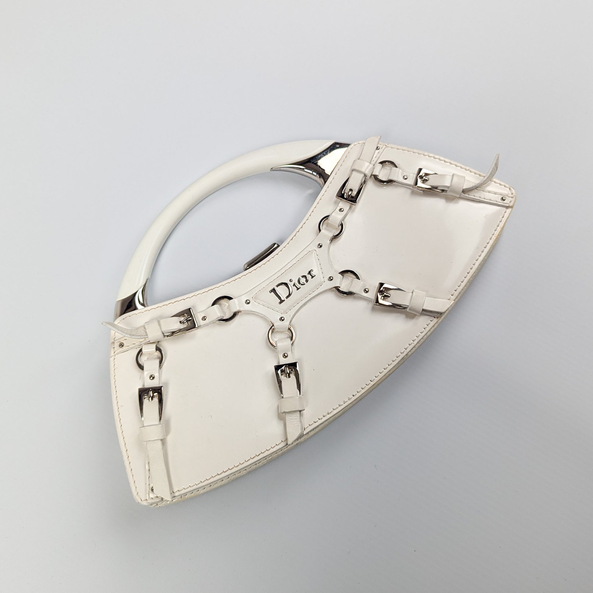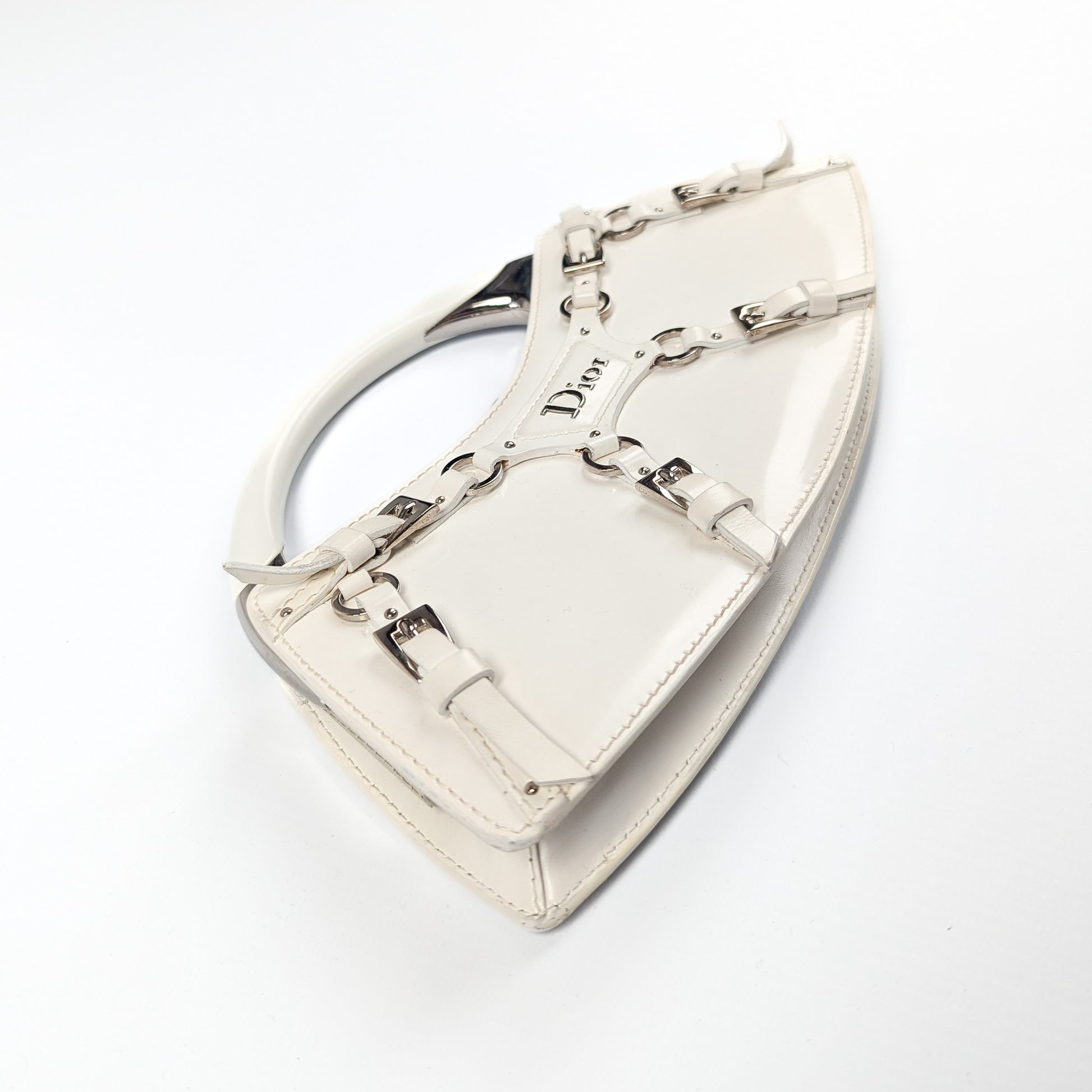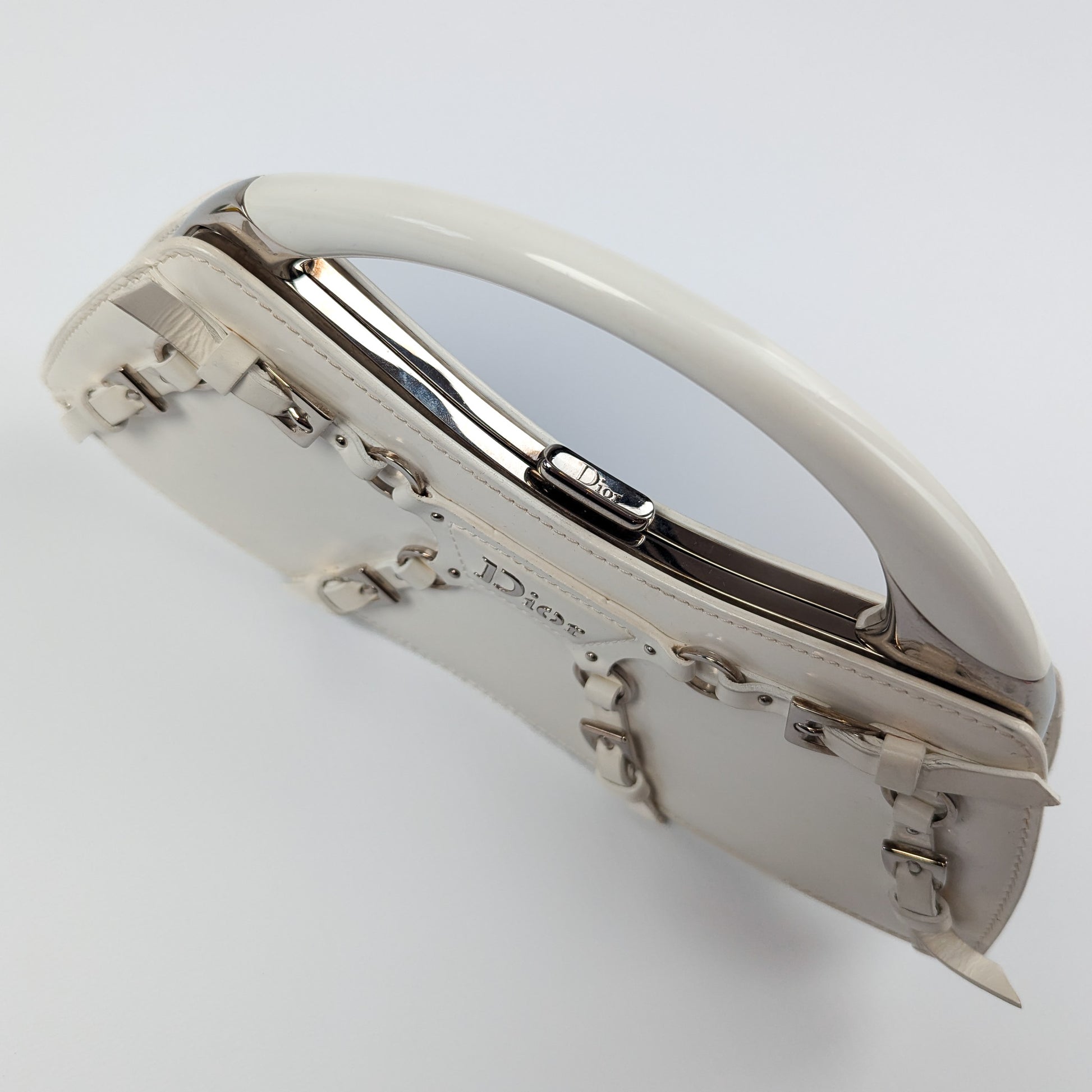 Item: White patent leather handbag decorated with bondage-inspired straps with a silver "Dior" plaque and Dior monogram lining. Silver top handle. Interior leather tag is stamped Christian Dior Paris with serial code on the opposite side.