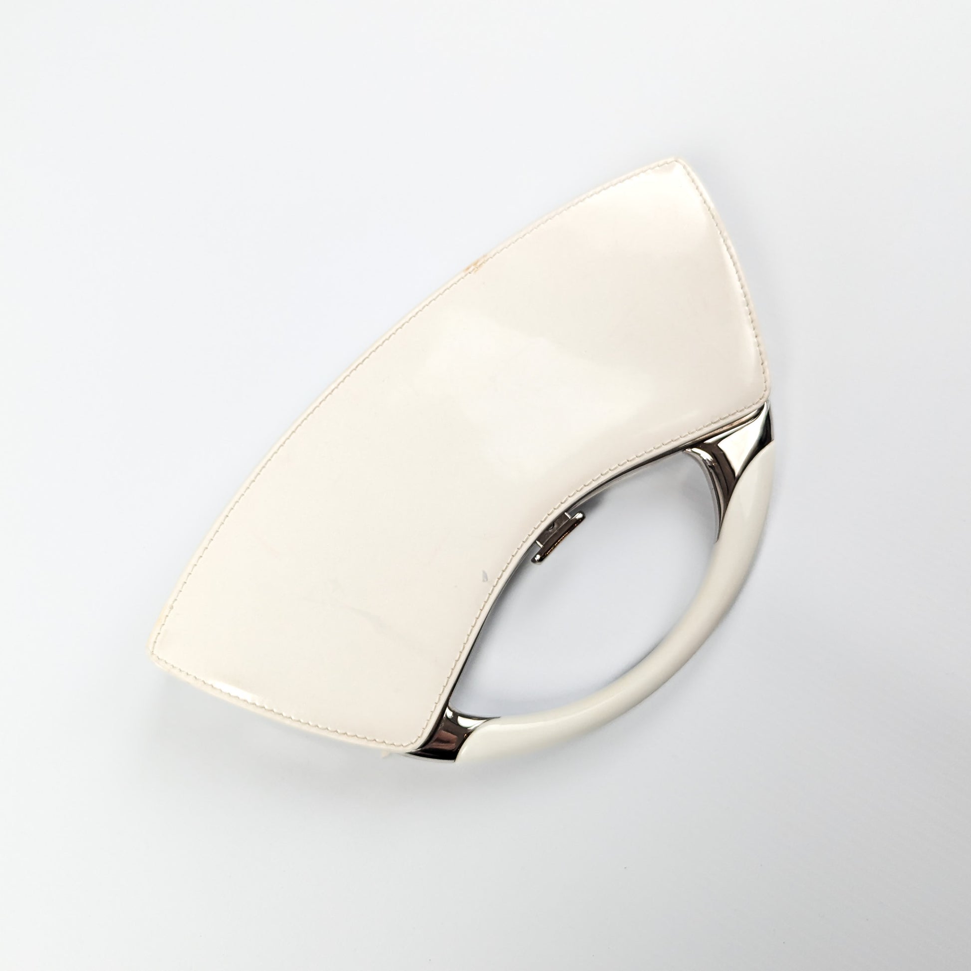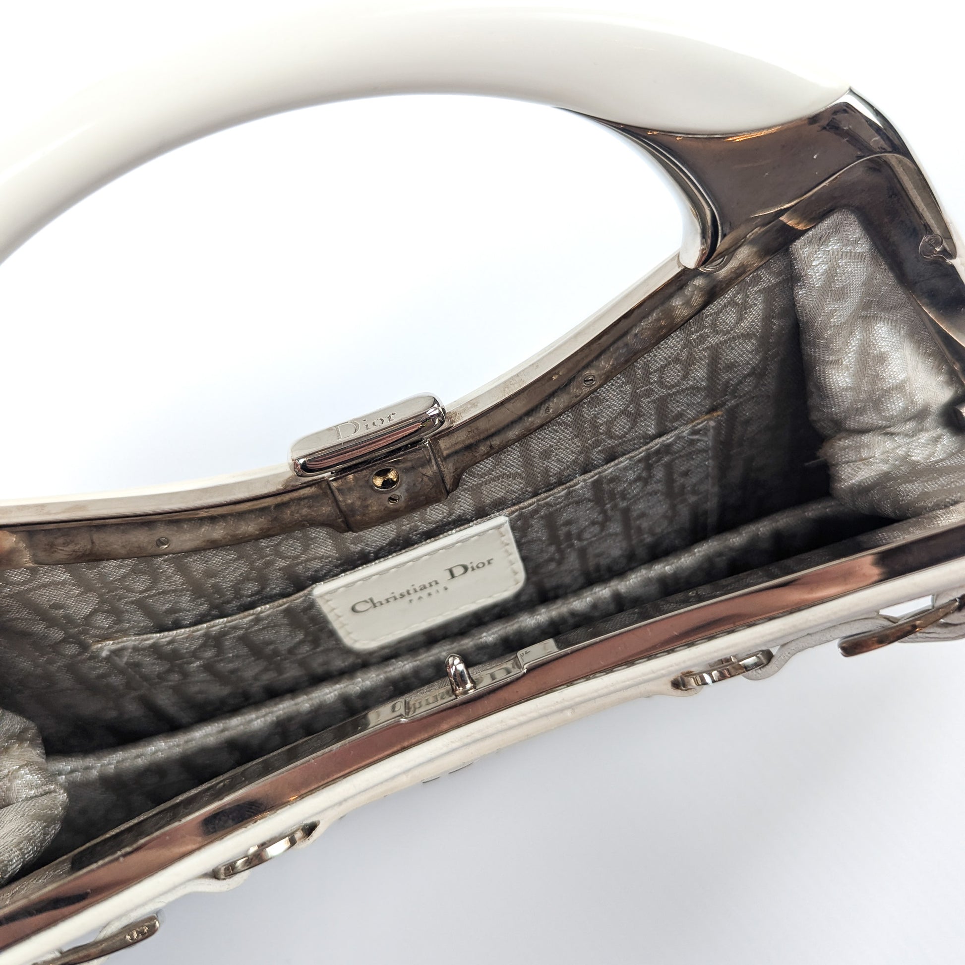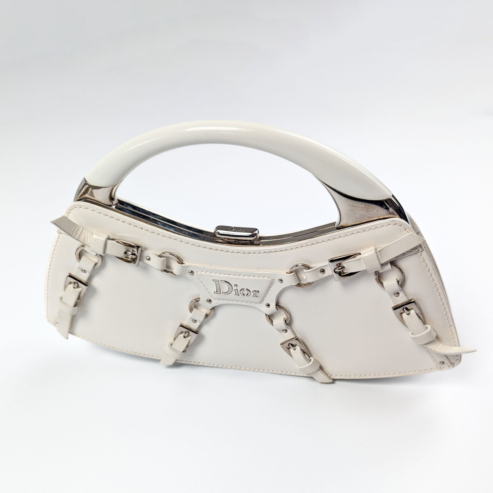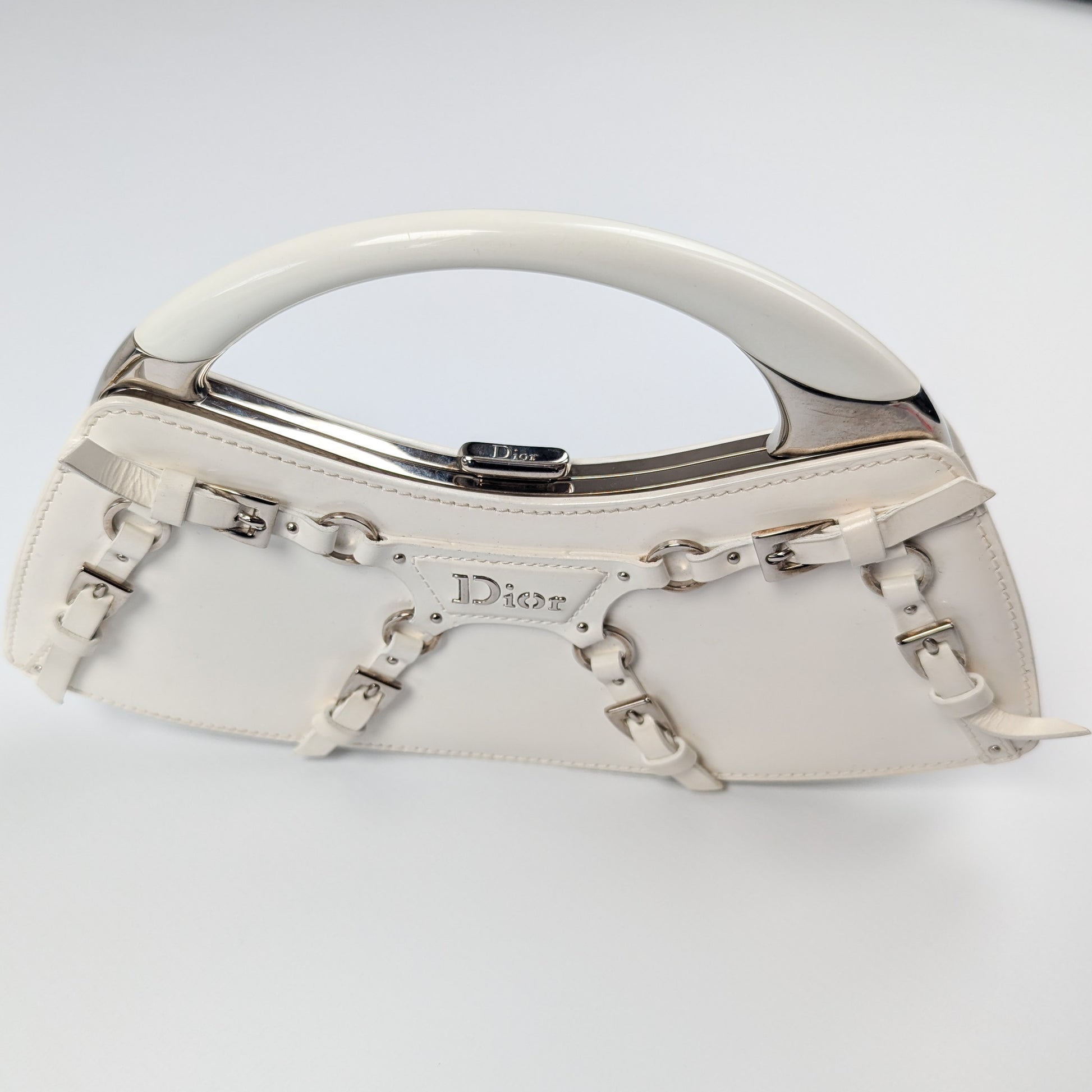 Item: White patent leather handbag decorated with bondage-inspired straps with a silver "Dior" plaque and Dior monogram lining. Silver top handle. Interior leather tag is stamped Christian Dior Paris with serial code on the opposite side.