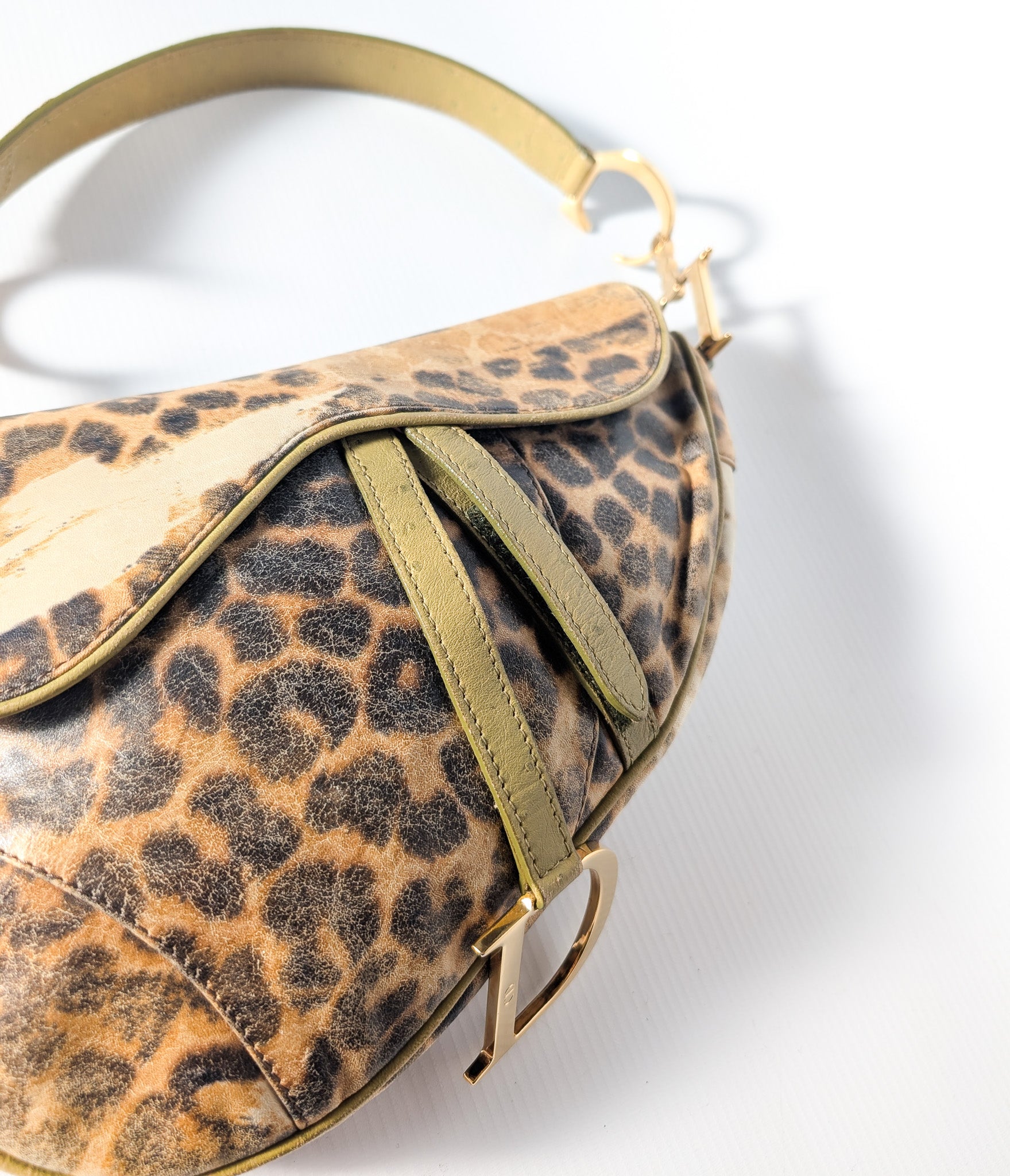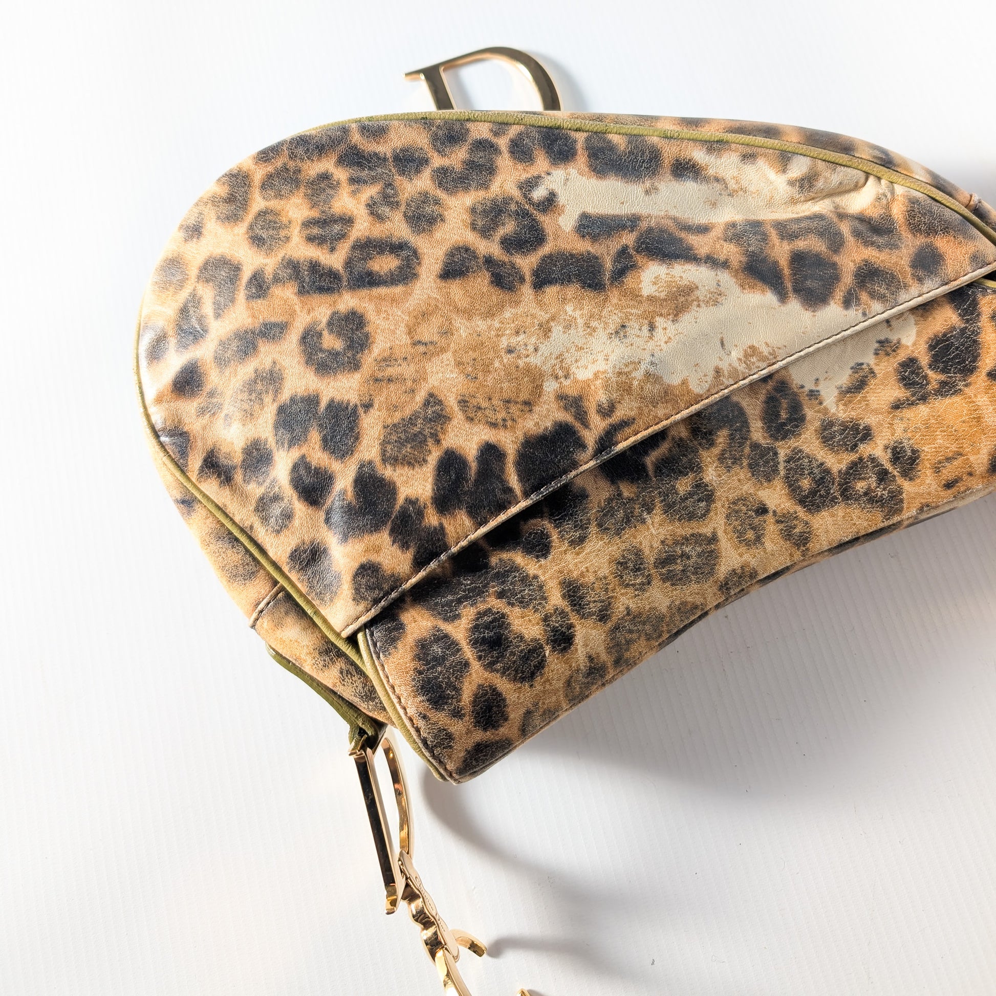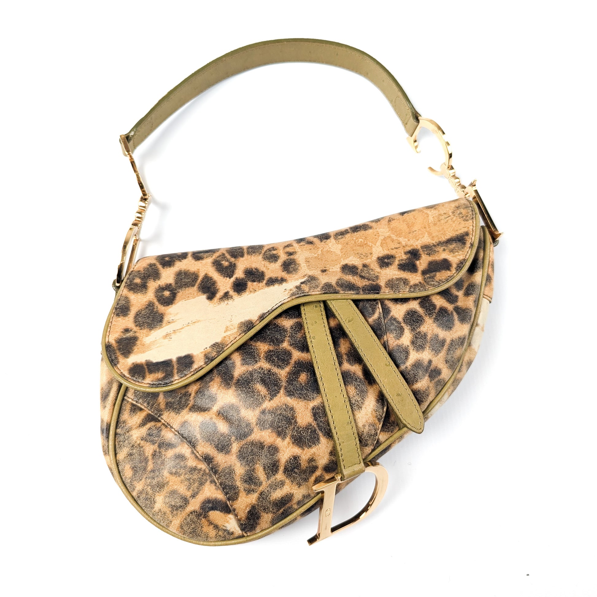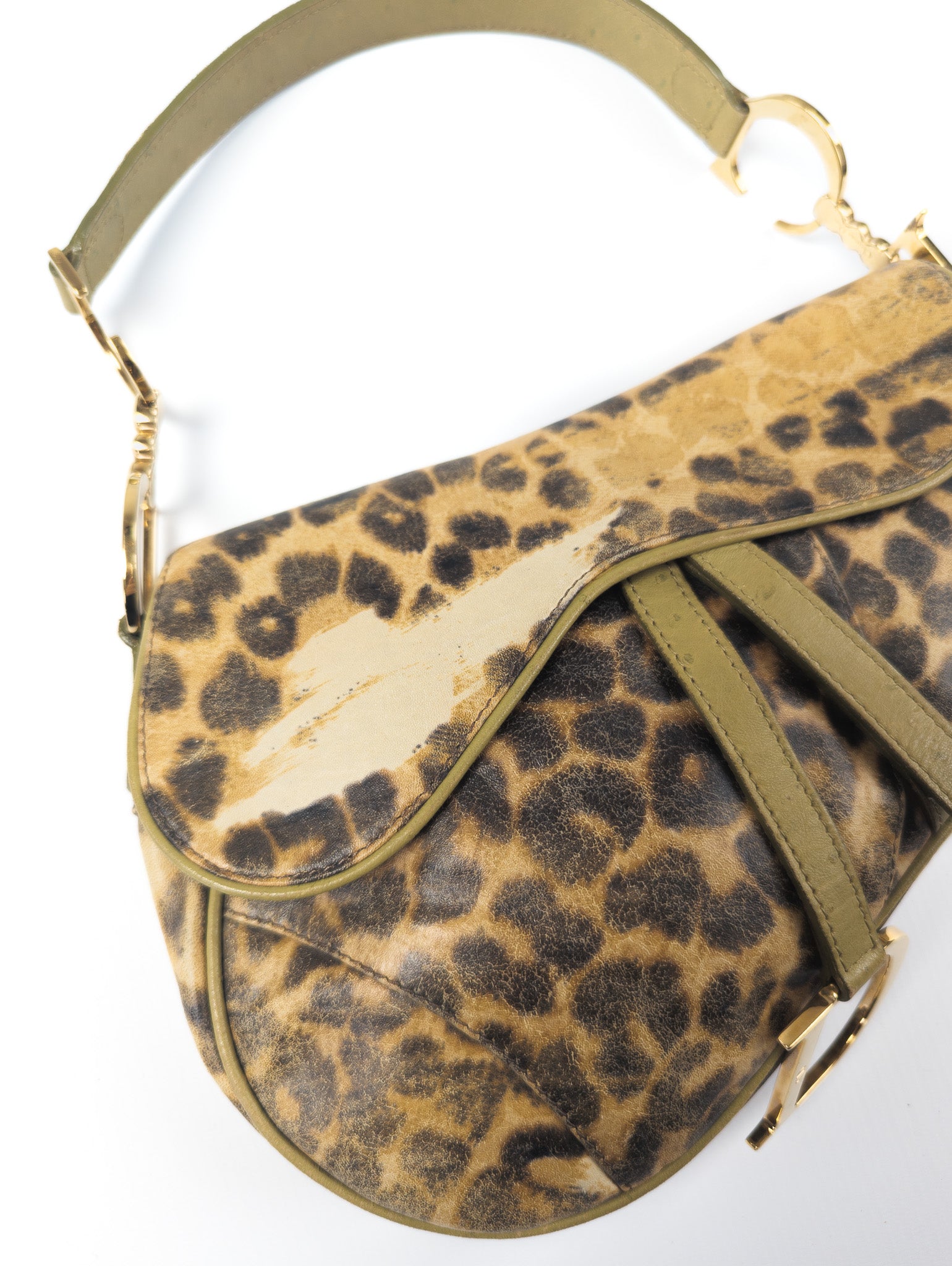 Item: Saddle bag in leather with an iconic print from the Winter 2000 fashion show. Leopard print with destroyed effect.