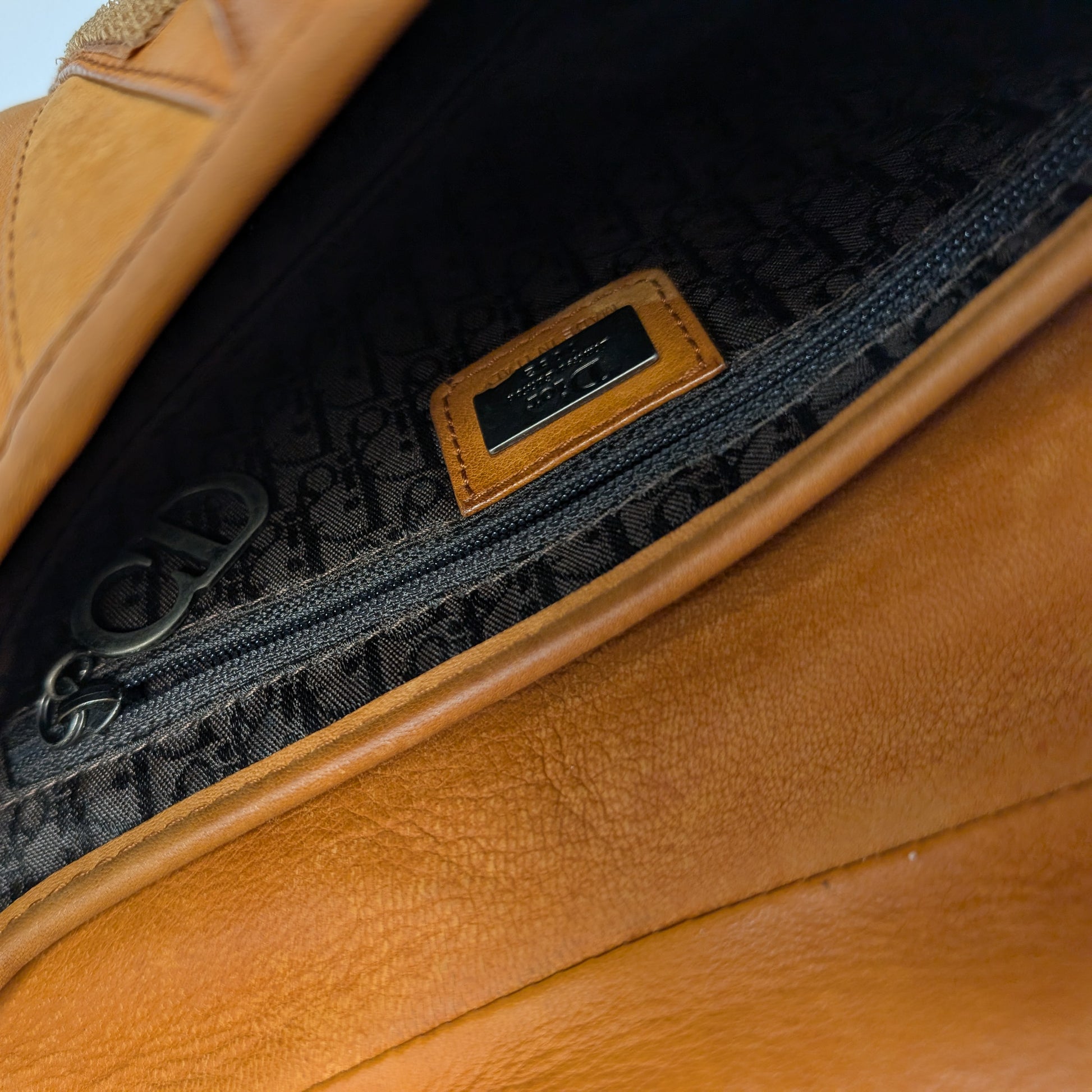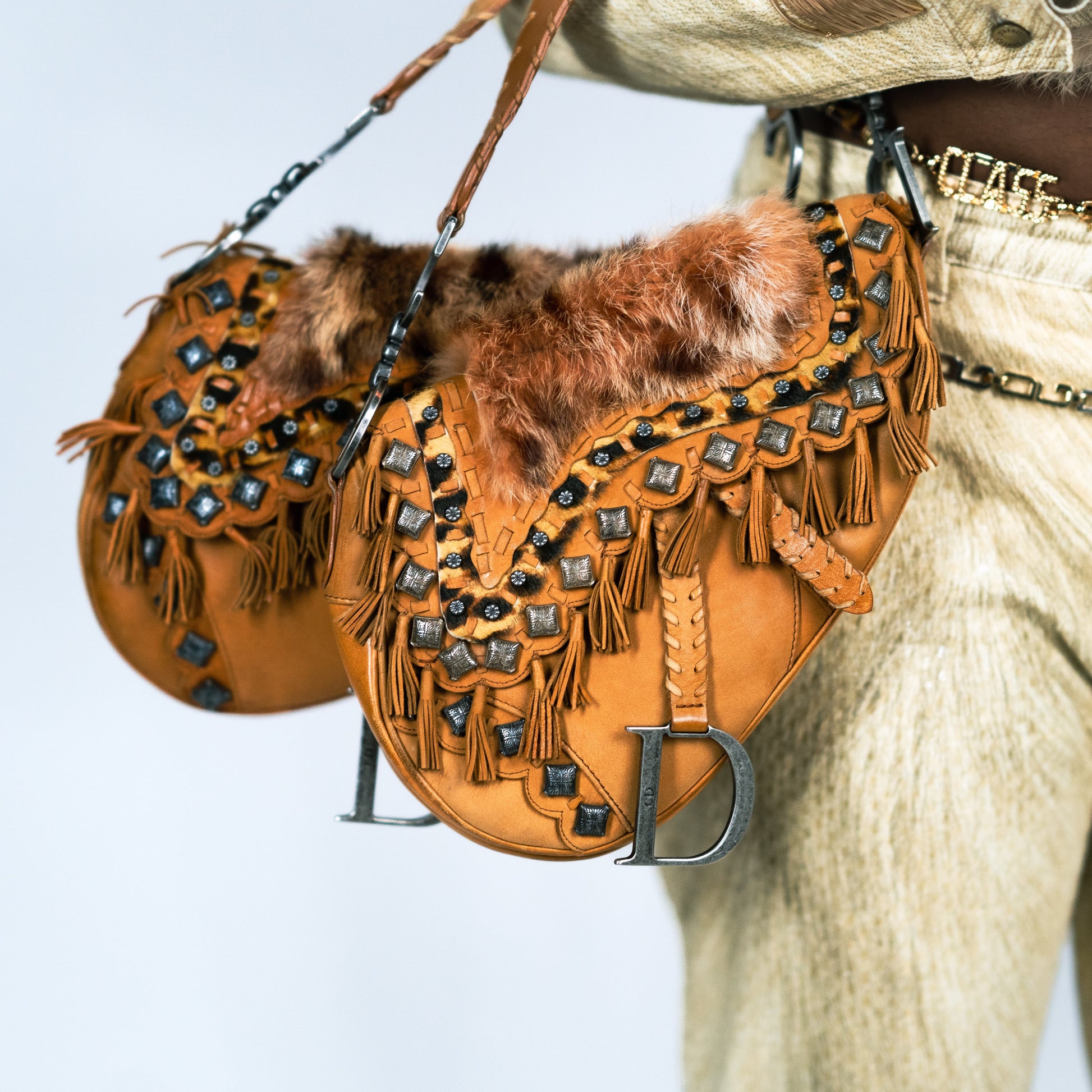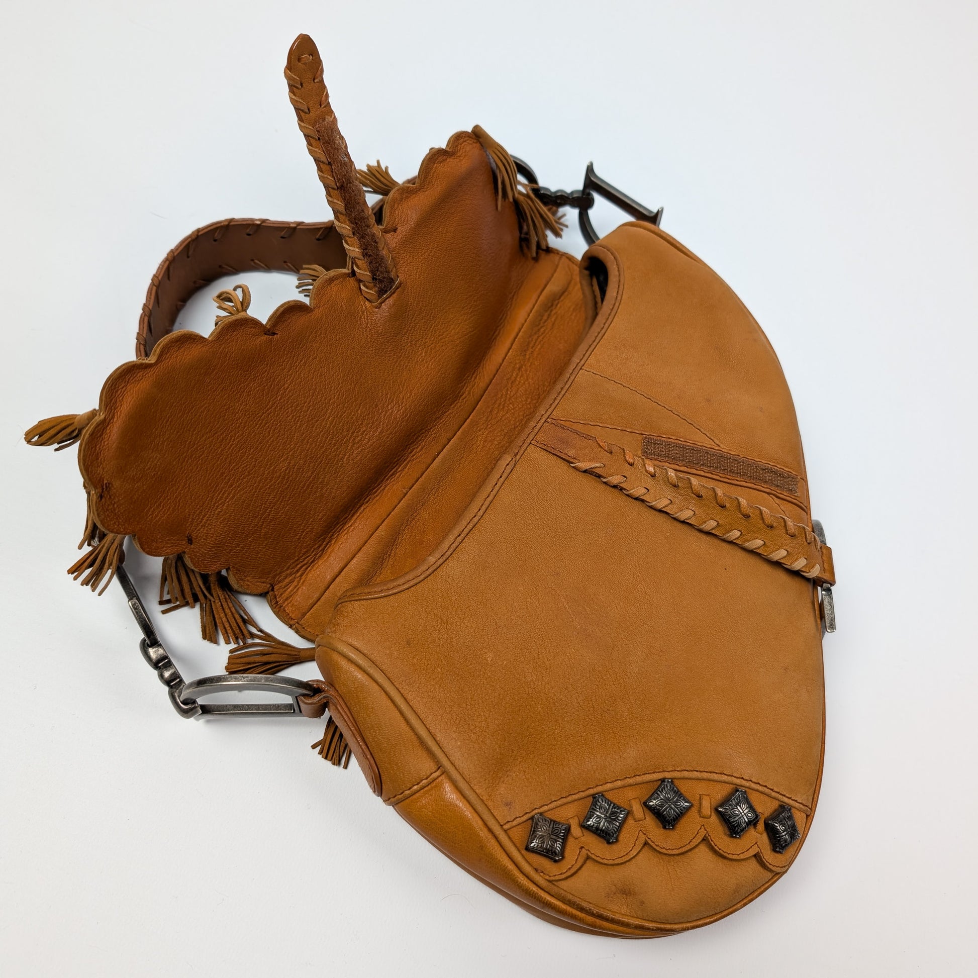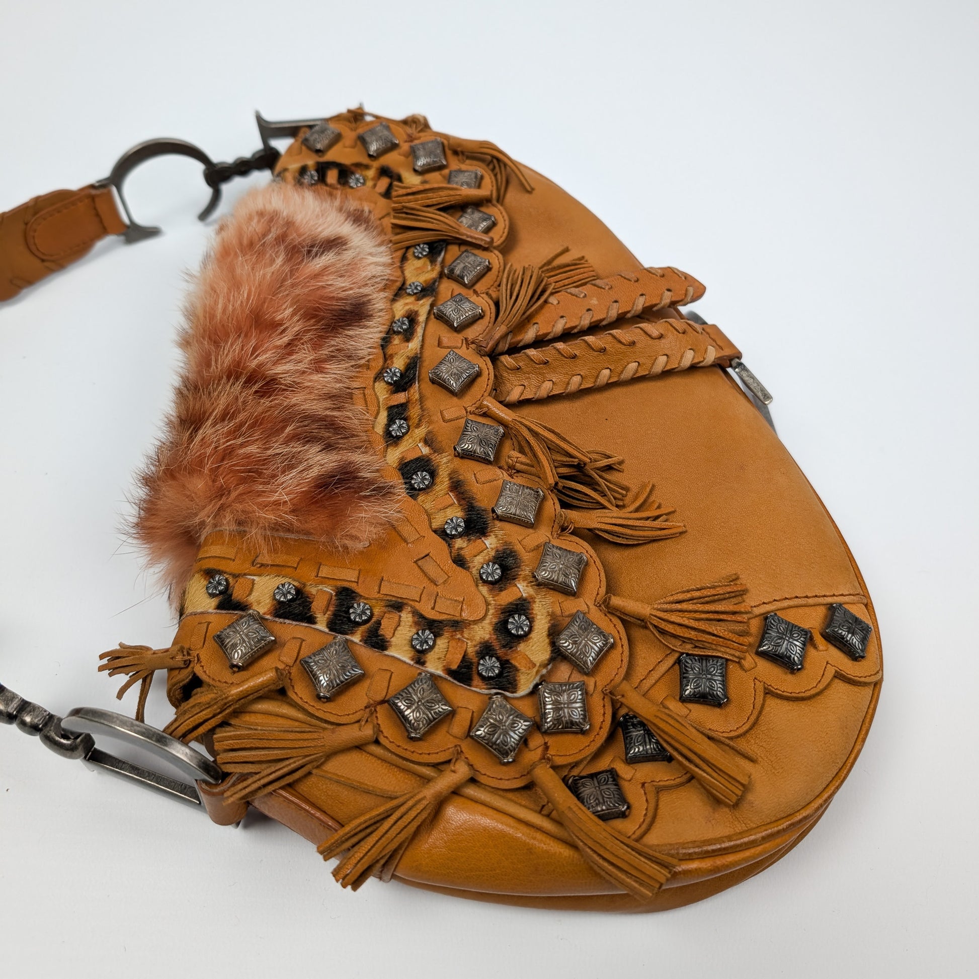 Item: Brown leather saddle decorated with studs and rabbit fur.