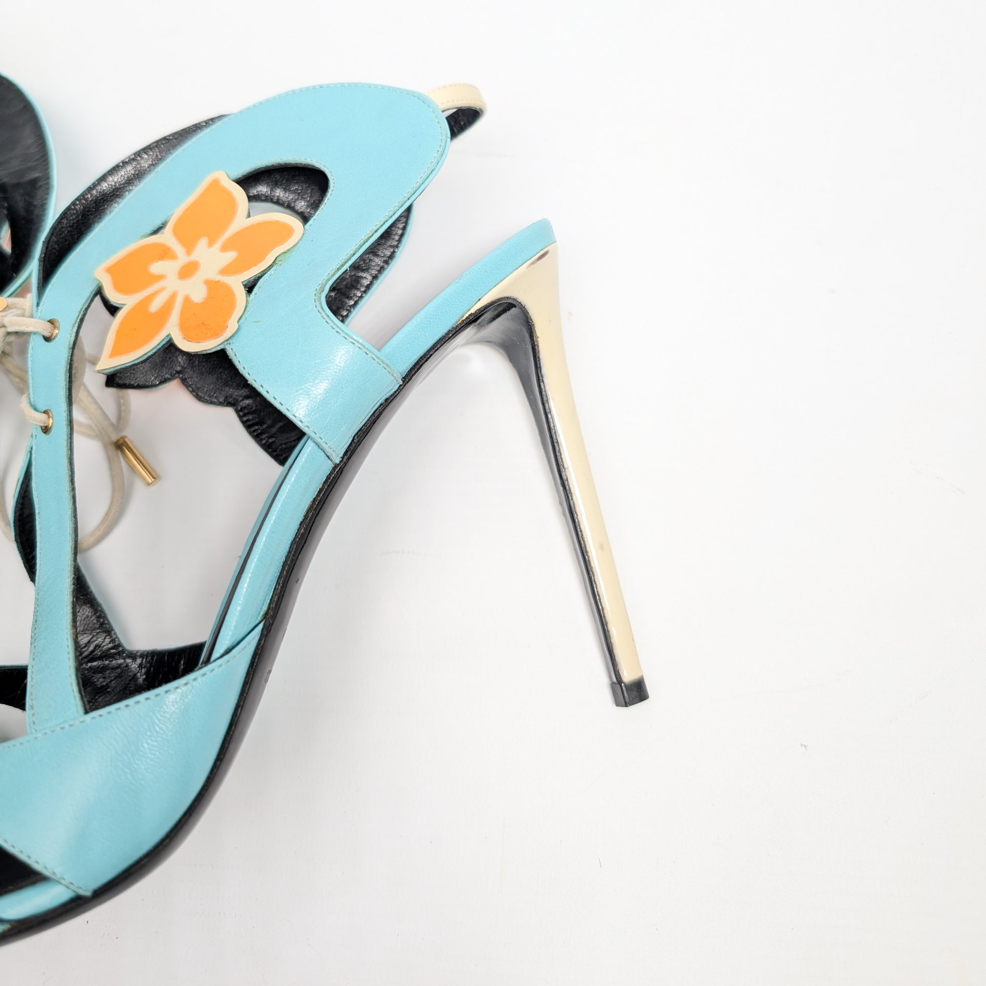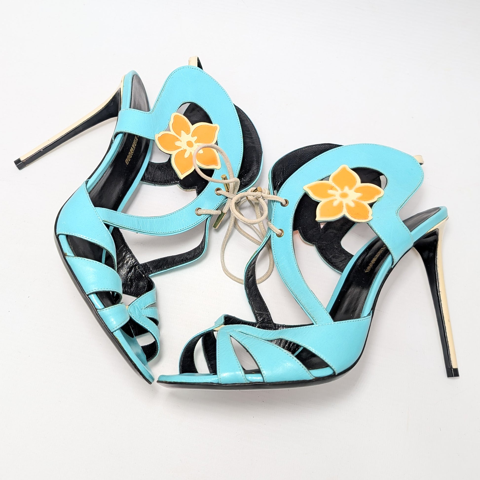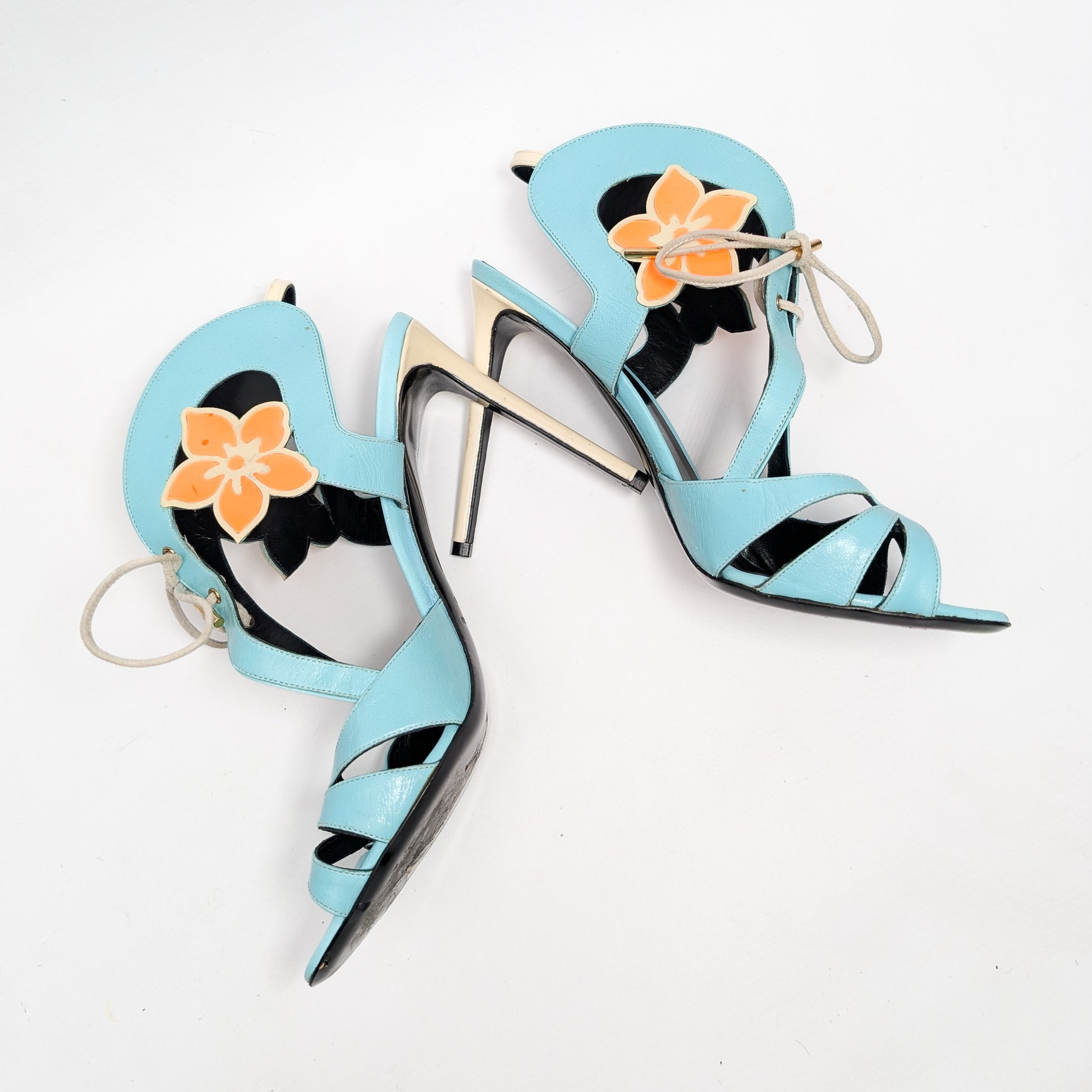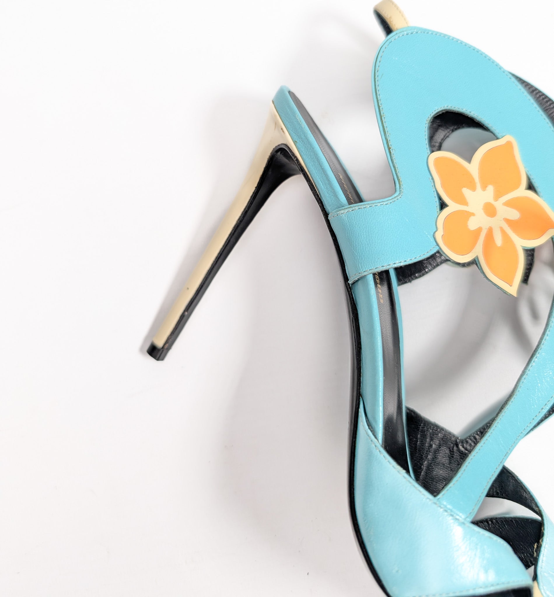 Item: Blue leather sandals adorned with an orange flower by Nicholas Kirkwood